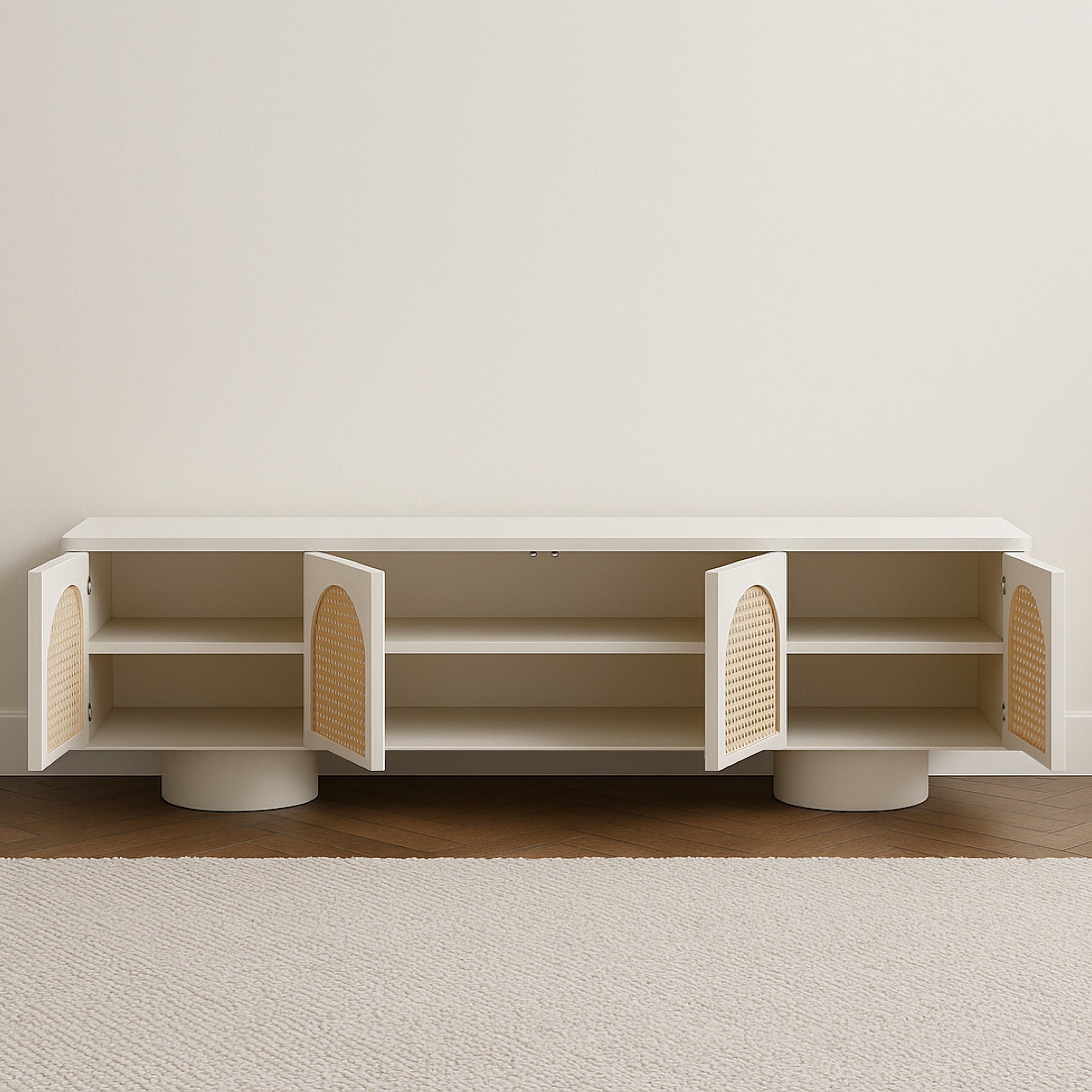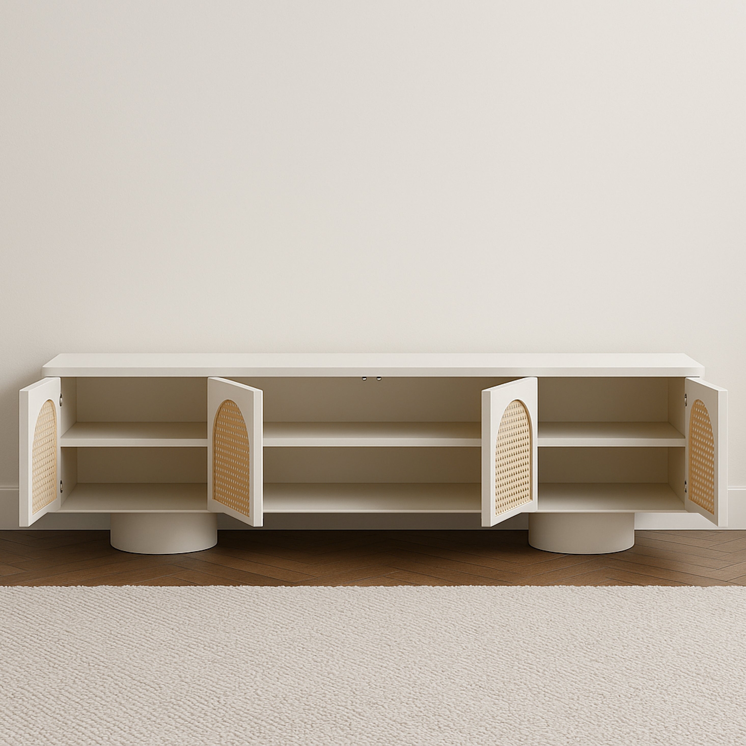 Embrace the charm of contemporary craftsmanship with this elegant Arc Cane TV Unit. Featuring a clean, minimalist form in a smooth plaster finish, its standout detail lies in the semi-circular cane panel fronts, which bring natural texture and warmth to the design. Resting on cylindrical pedestal legs, the unit maintains a light, airy presence while offering ample concealed storage for a clutter-free space. Perfect for modern interiors, it blends organic accents with refined geometry, creating a functional yet stylish focal point for your living room