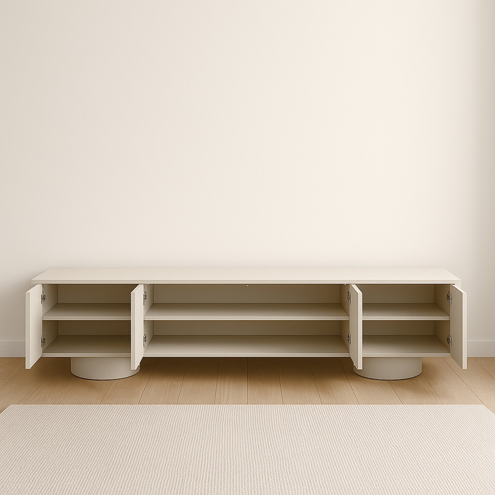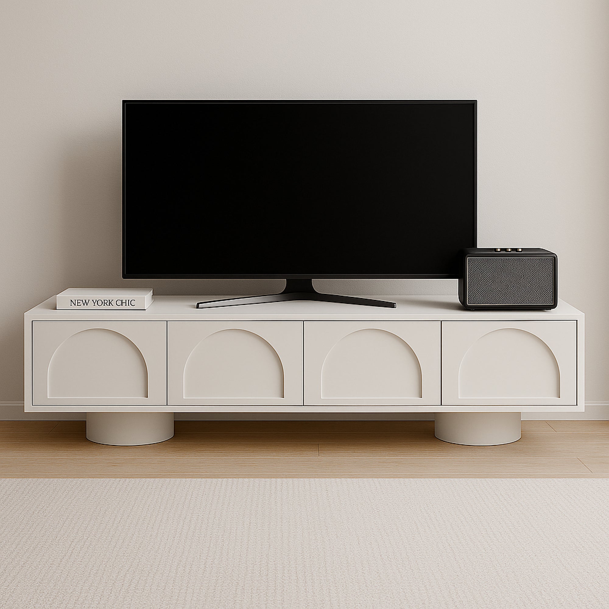 Experience the harmony of clean geometry and understated elegance with this Arc TV unit. Crafted in a smooth plaster finish, its front panels feature subtle embossed arc motifs that add architectural interest while maintaining a refined minimal aesthetic. Elevated on cylindrical pedestal bases, the design achieves a grounded yet airy presence. Seamlessly integrated storage compartments keep your living space organized, while the balanced proportions and gentle curves make it a versatile addition to modern interiors—uniting everyday practicality with timeless sophistication.