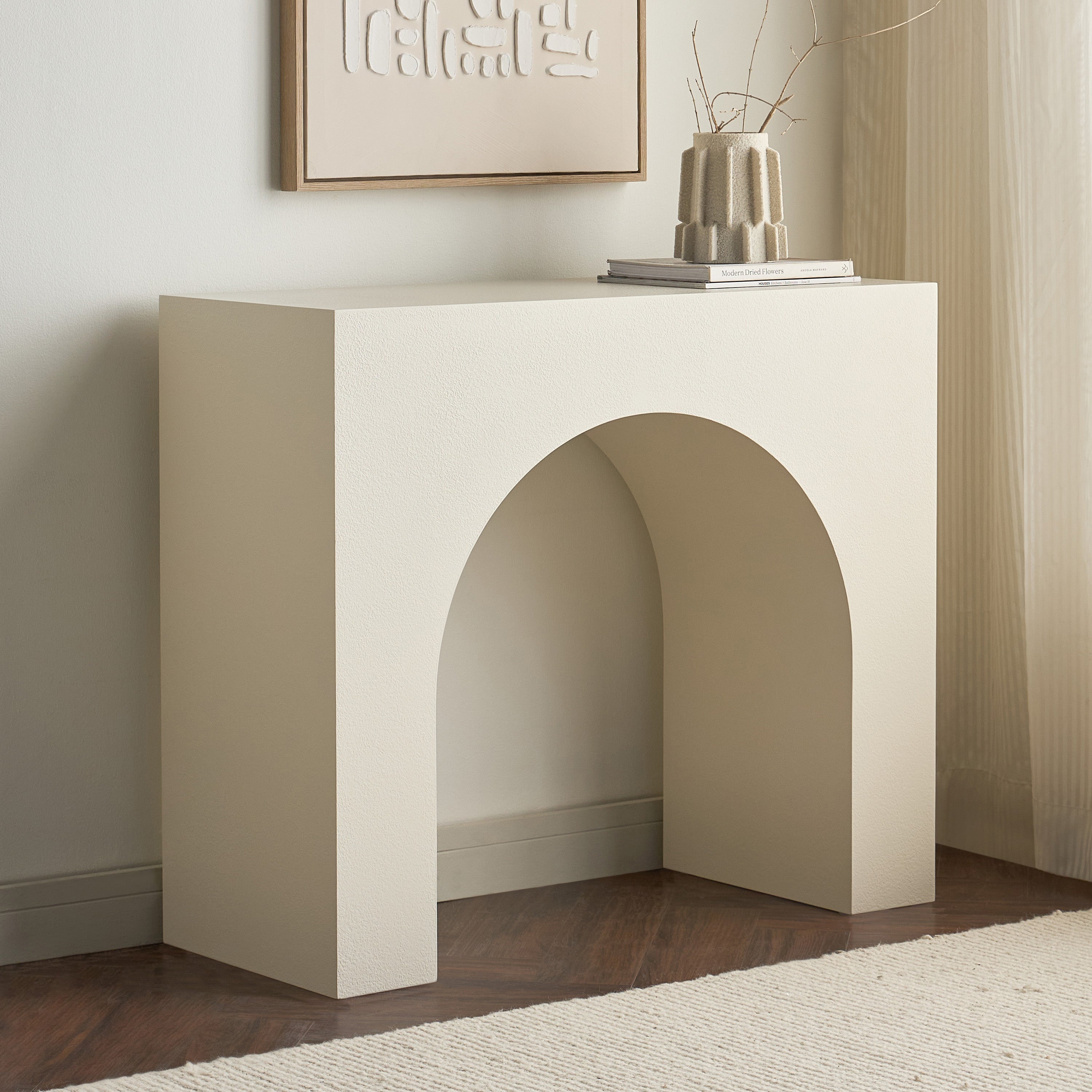 The console table is a striking piece, designed with a sleek, arched silhouette that brings an elegant flow to any room. Crafted with a smooth plaster finish, it offers a minimalist yet distinctive look, perfect for both modern and traditional interiors. The console's bold structure, defined by its clean lines and symmetrical arch, effortlessly blends functionality with a sculptural aesthetic. It’s an ideal addition to entryways, living spaces, or dining areas, delivering a statement while maintaining versatility.