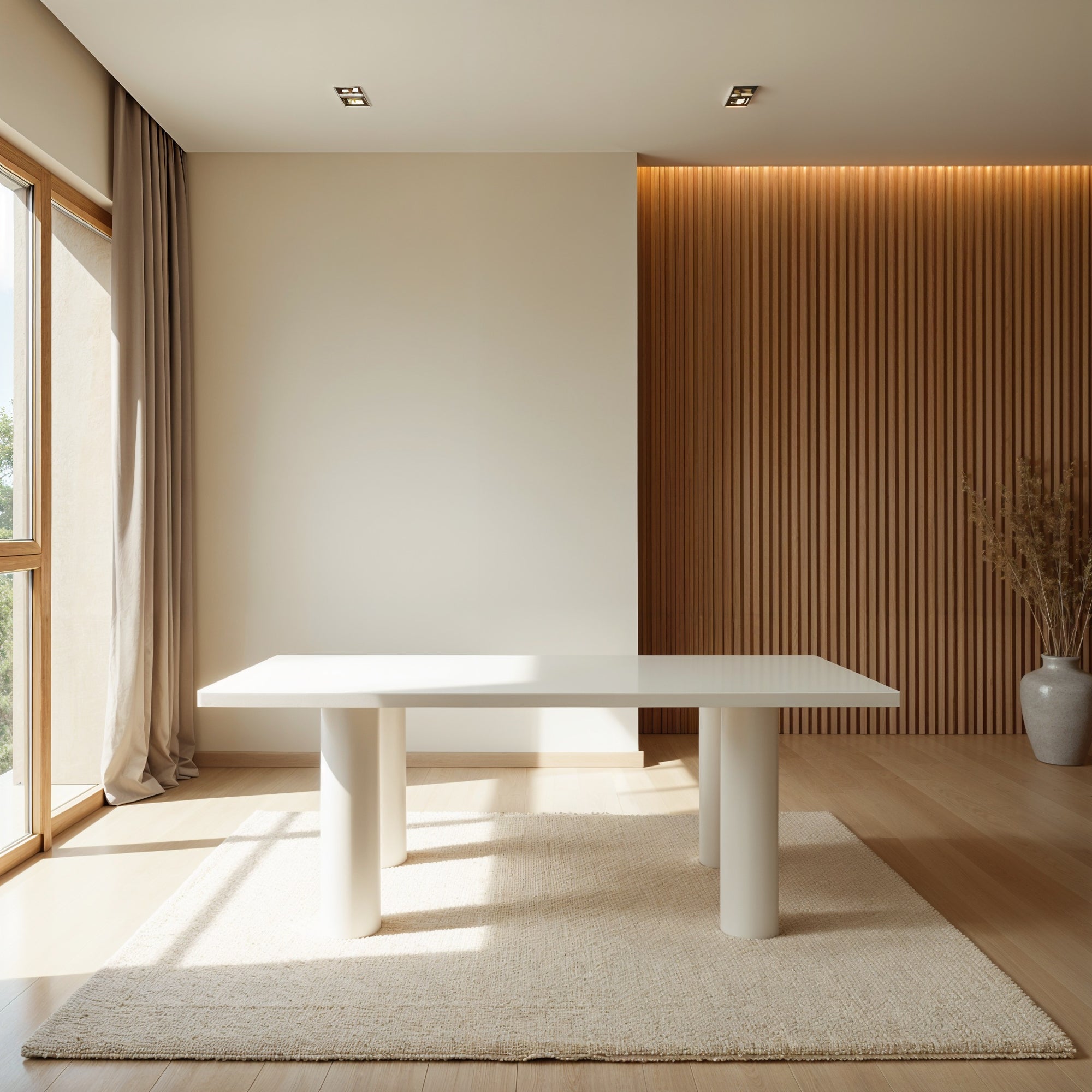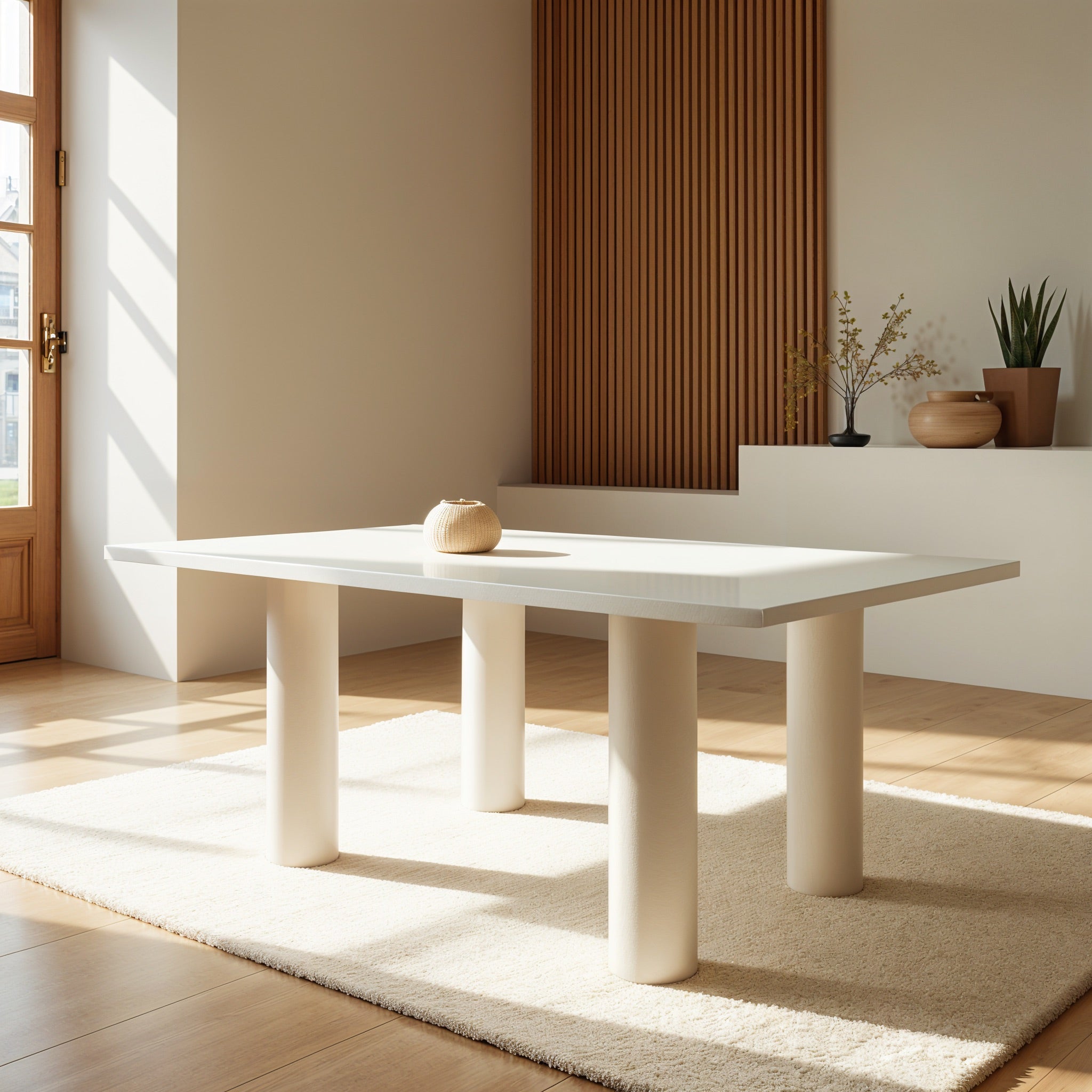 This dining table brings a touch of contemporary elegance to your space. Its smooth, rounded top is supported by four cylindrical legs, offering both stability and a unique aesthetic. The textured finish adds a sophisticated element, making this table a versatile choice for both formal dining areas and casual settings. Perfect for hosting meals with family and friends, this table combines modern design with practical functionality.