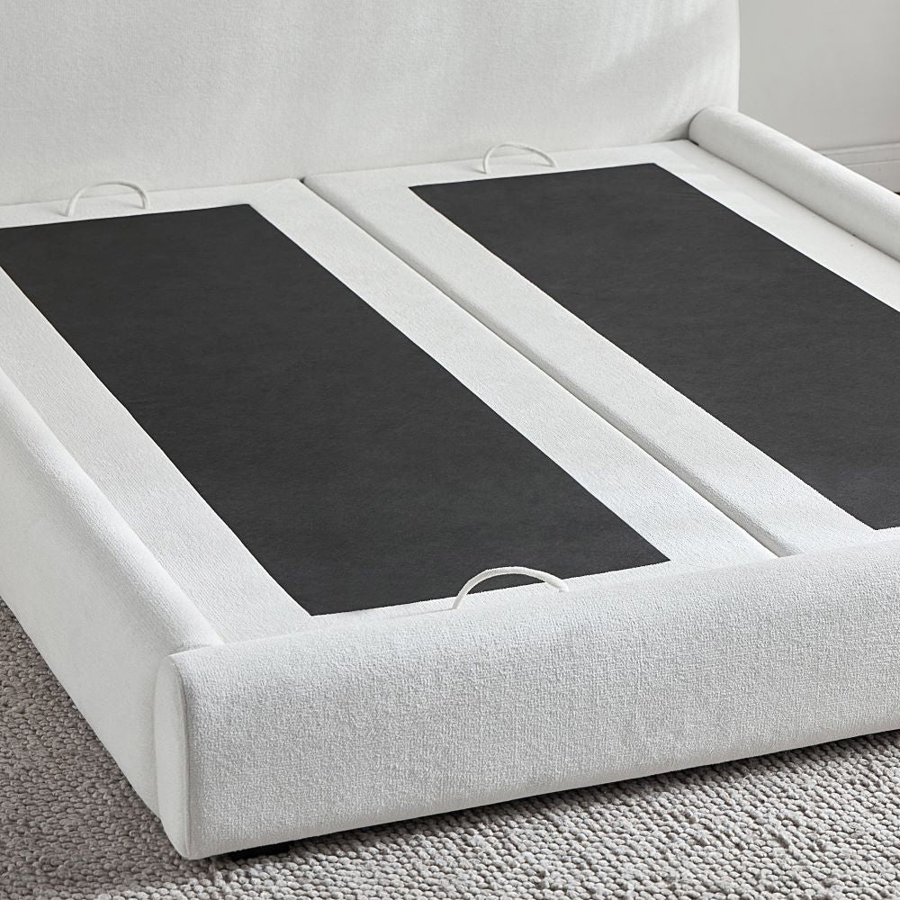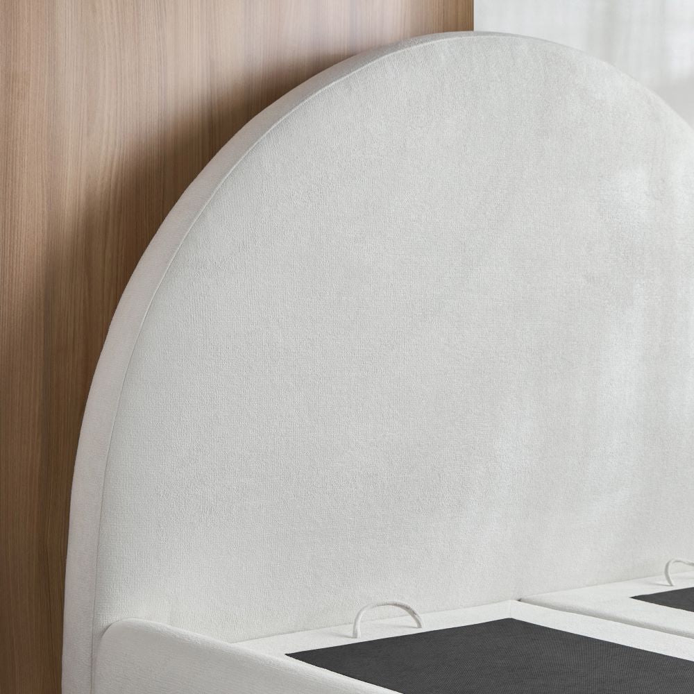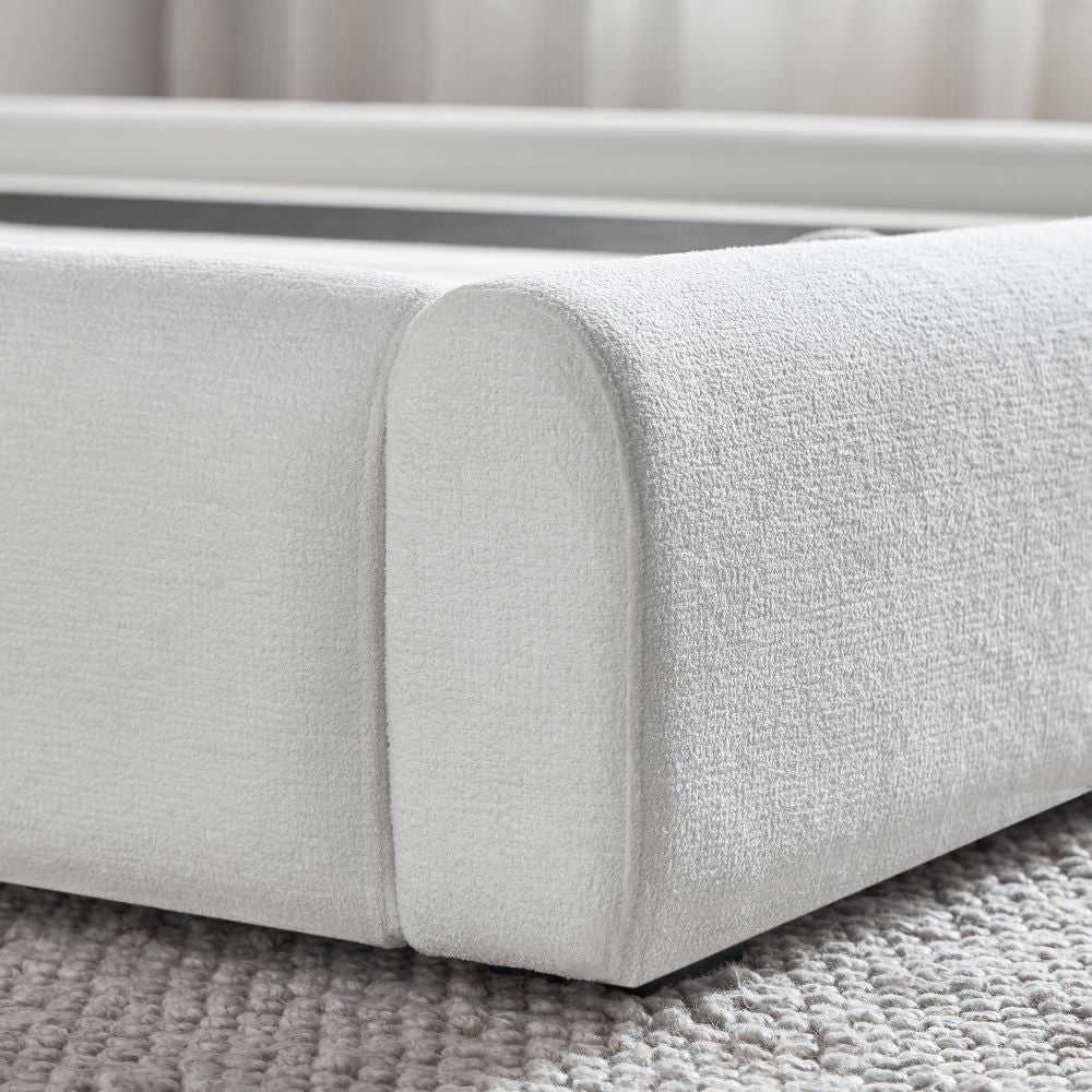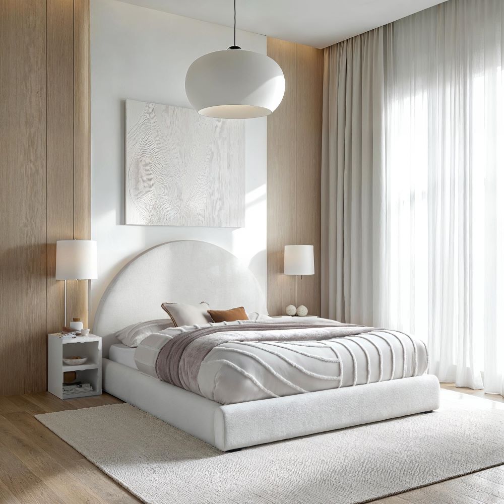 This cozy bed blends contemporary sophistication with timeless design. Its standout feature is the gently arched, fully upholstered fabric headboard, adding an elegant touch to your bedroom. The low-profile frame, crafted from solid wood, offers sturdy support while complementing a modern, minimalist aesthetic. Perfectly tailored for those who value understated luxury, this bed creates a serene and stylish focal point in any sleeping space, combining both comfort and chic design.