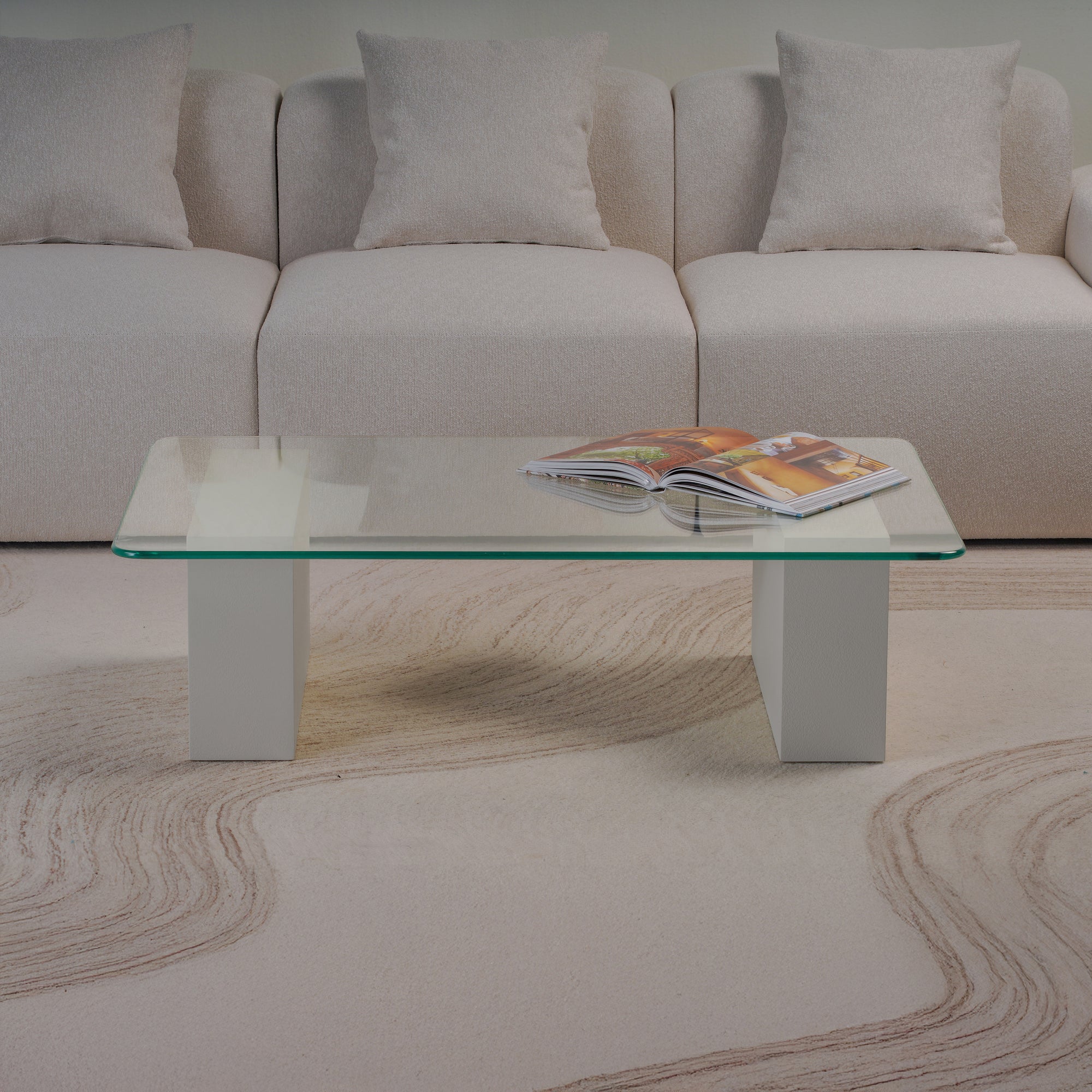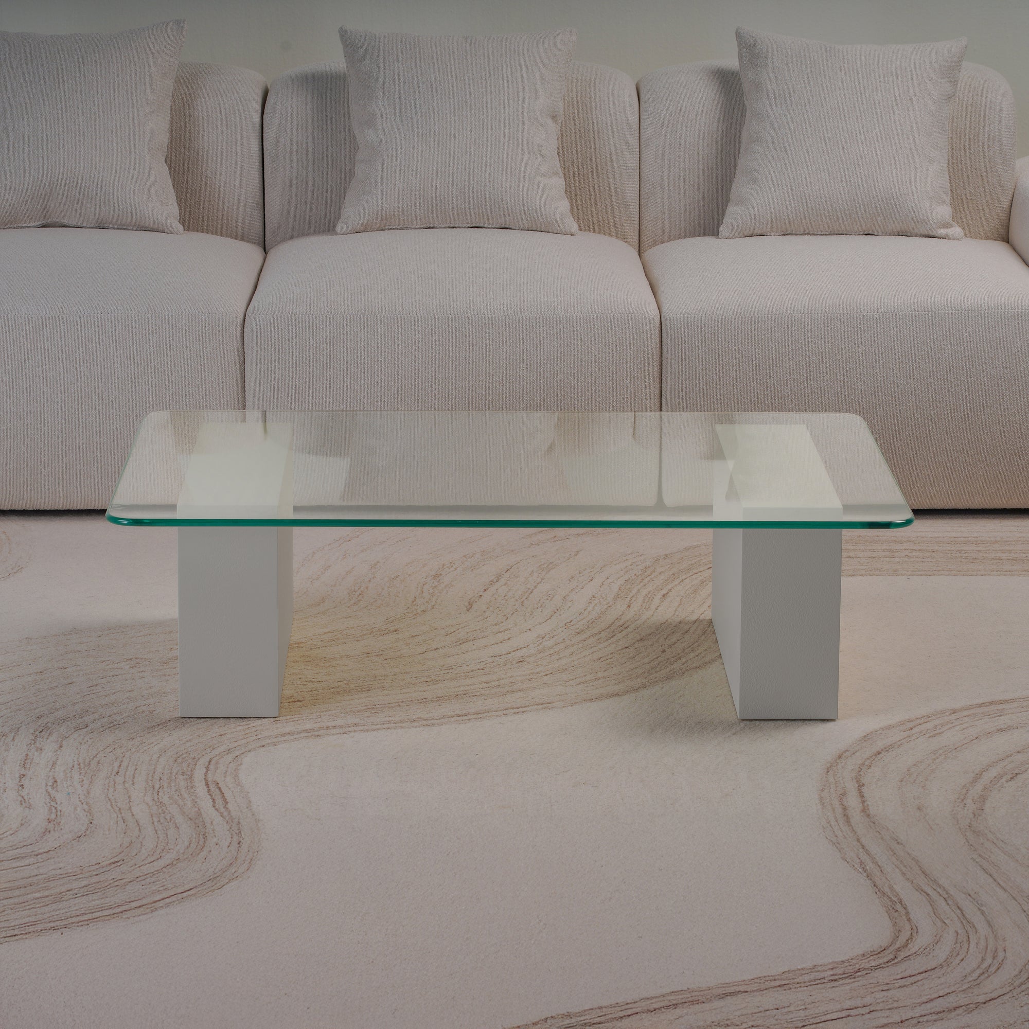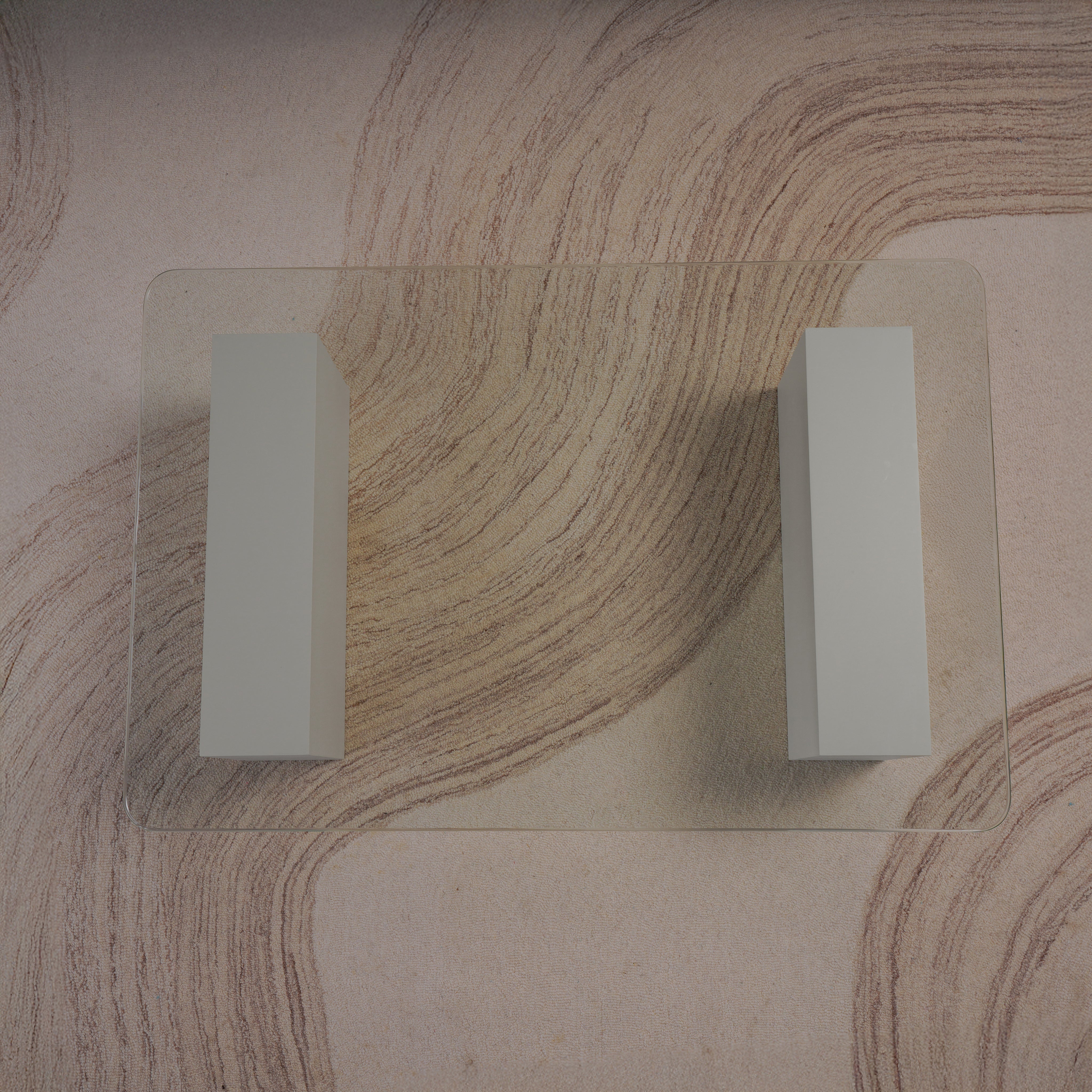 Experience refined minimalism with this block glass coffee table. Supported by two bold, block-style legs in a soft plaster finish, the design strikes a harmonious balance between solidity and transparency. The sleek glass top adds visual lightness, allowing the sculptural base to take center stage. A perfect fusion of modern elegance and everyday practicality, this piece is an ideal anchor for sophisticated living spaces.