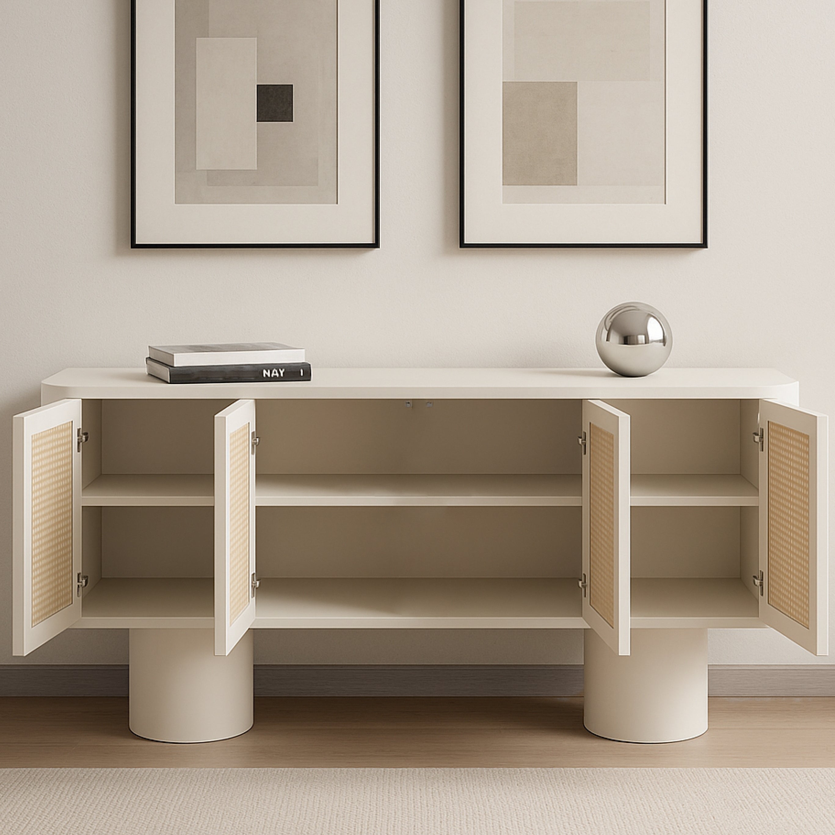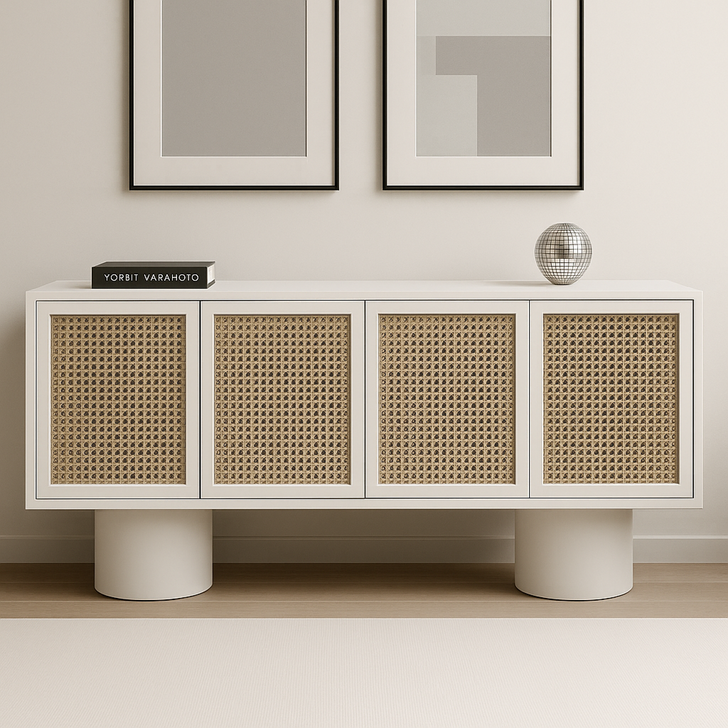 Experience the harmony of clean geometry and natural texture with this Cane Buffet. Crafted in a smooth plaster finish, its four symmetrical cane-front doors create a warm, organic contrast against the refined structure. The cylindrical pedestal legs elevate the design, offering both visual lightness and sturdy support. Perfect for dining or living spaces, this piece blends timeless craftsmanship with modern minimalism, delivering understated sophistication and functional storage in one elegant form