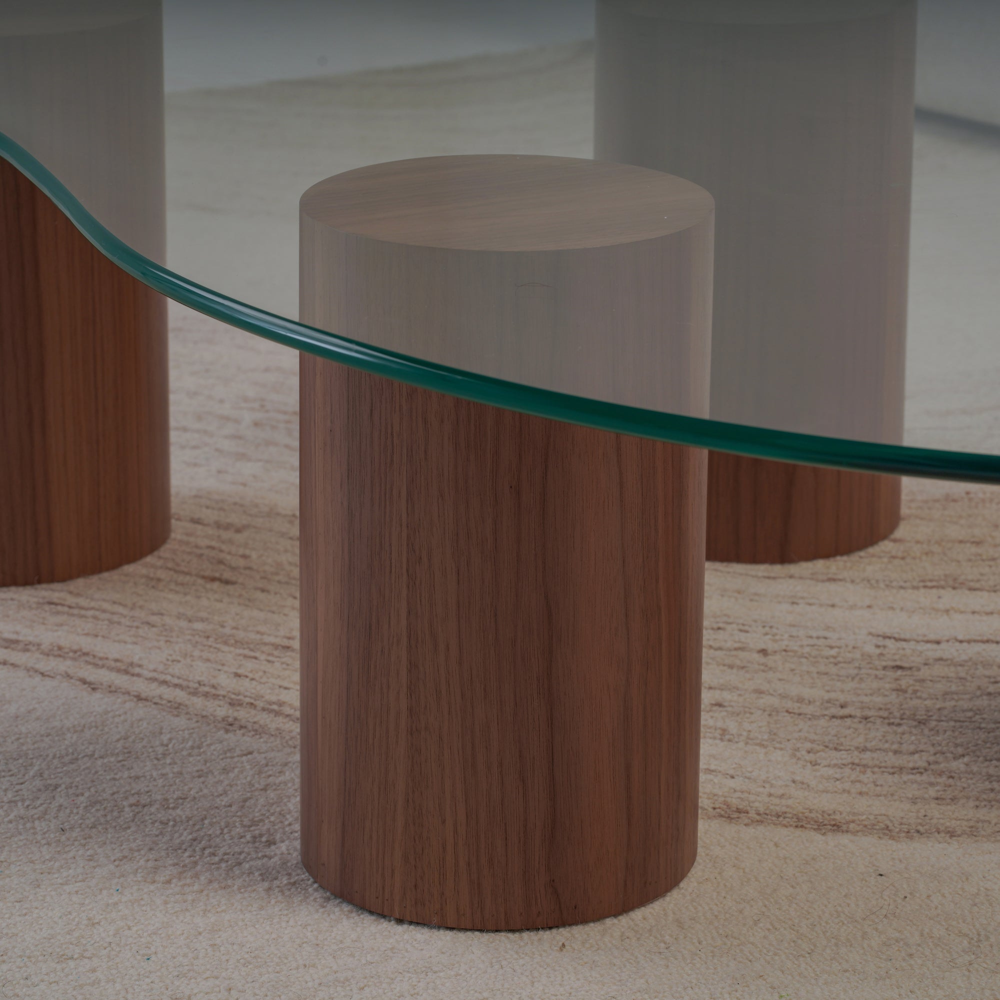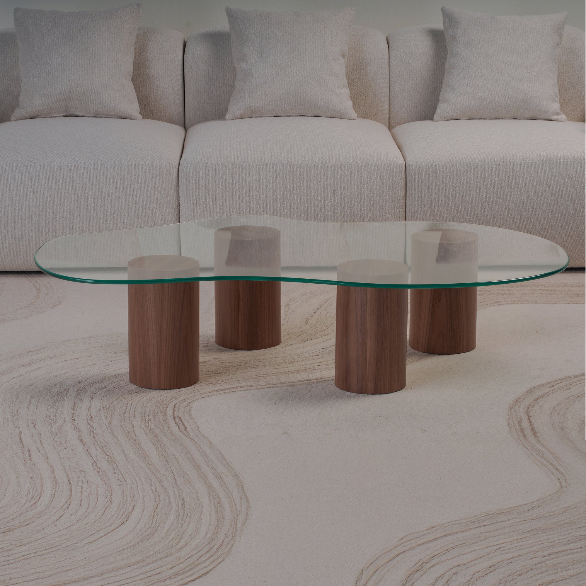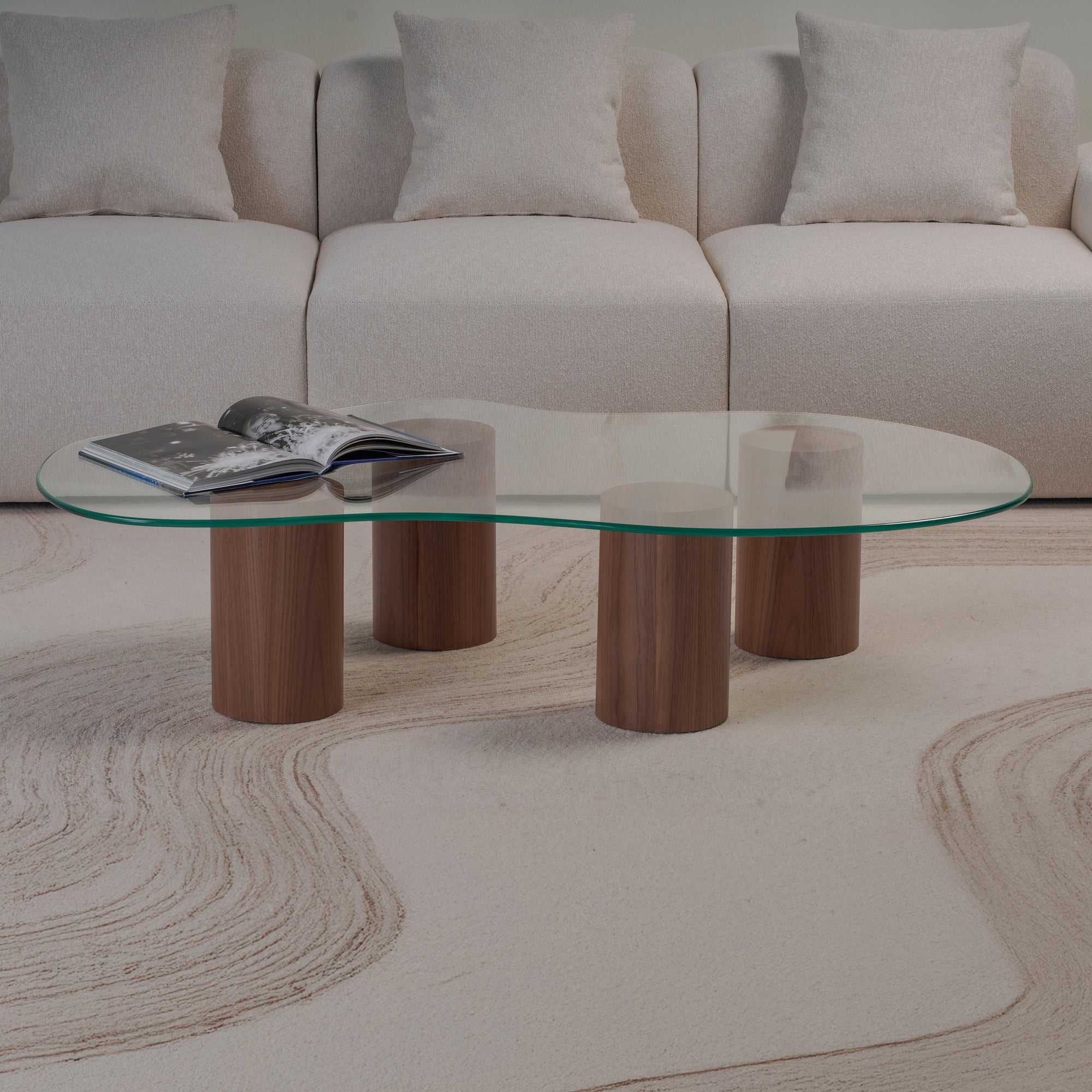Experience sculptural elegance with this cloudy glass coffee table. Anchored by four cylindrical bases in a soft plaster finish, the piece combines bold geometry with gentle curves for a refined architectural presence. The freeform glass top introduces an airy lightness, creating a striking contrast with the solid base below. Ideal for contemporary interiors, this table balances visual interest with functional design perfect as a statement piece in curated living spaces.