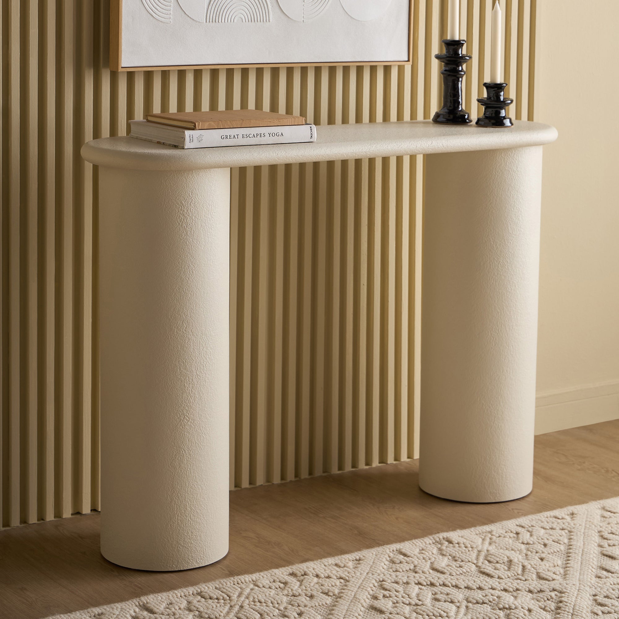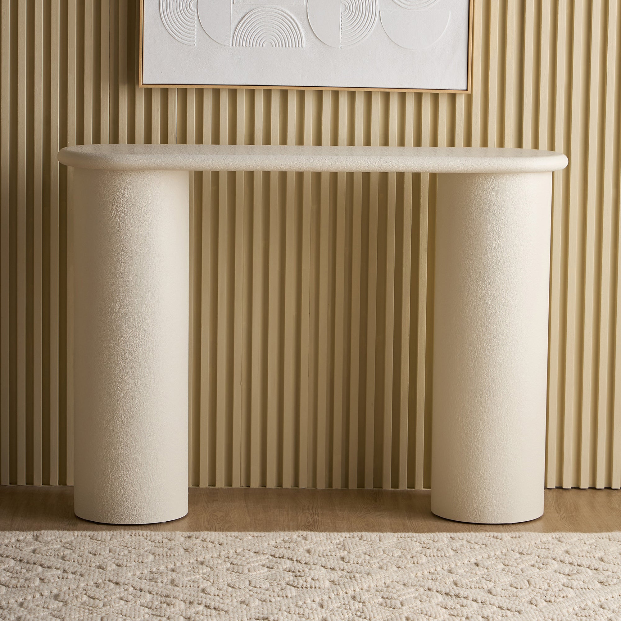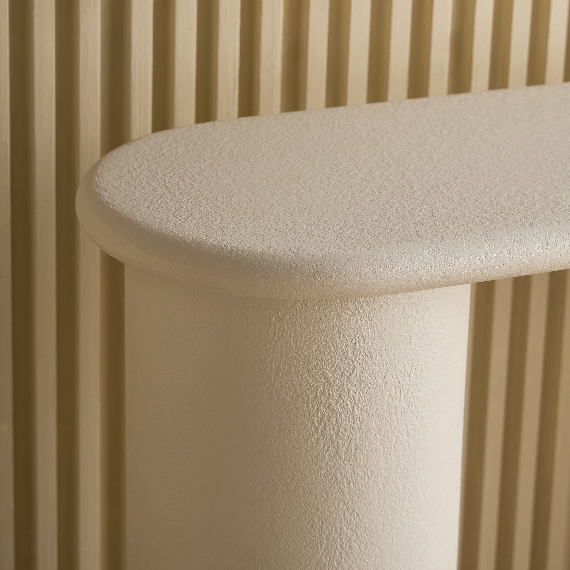 This console table is a modern and stylish addition to any home. Its sleek design and clean lines make it a versatile piece that can elevate any room. Crafted with a refined plaster finish and supported by sculptural pillar legs, it embodies both elegance and durability, making it a timeless statement piece.