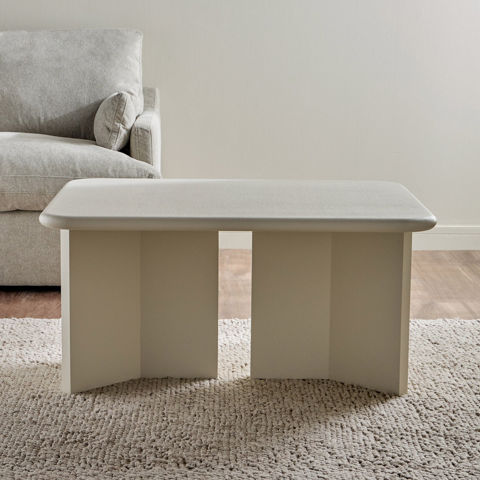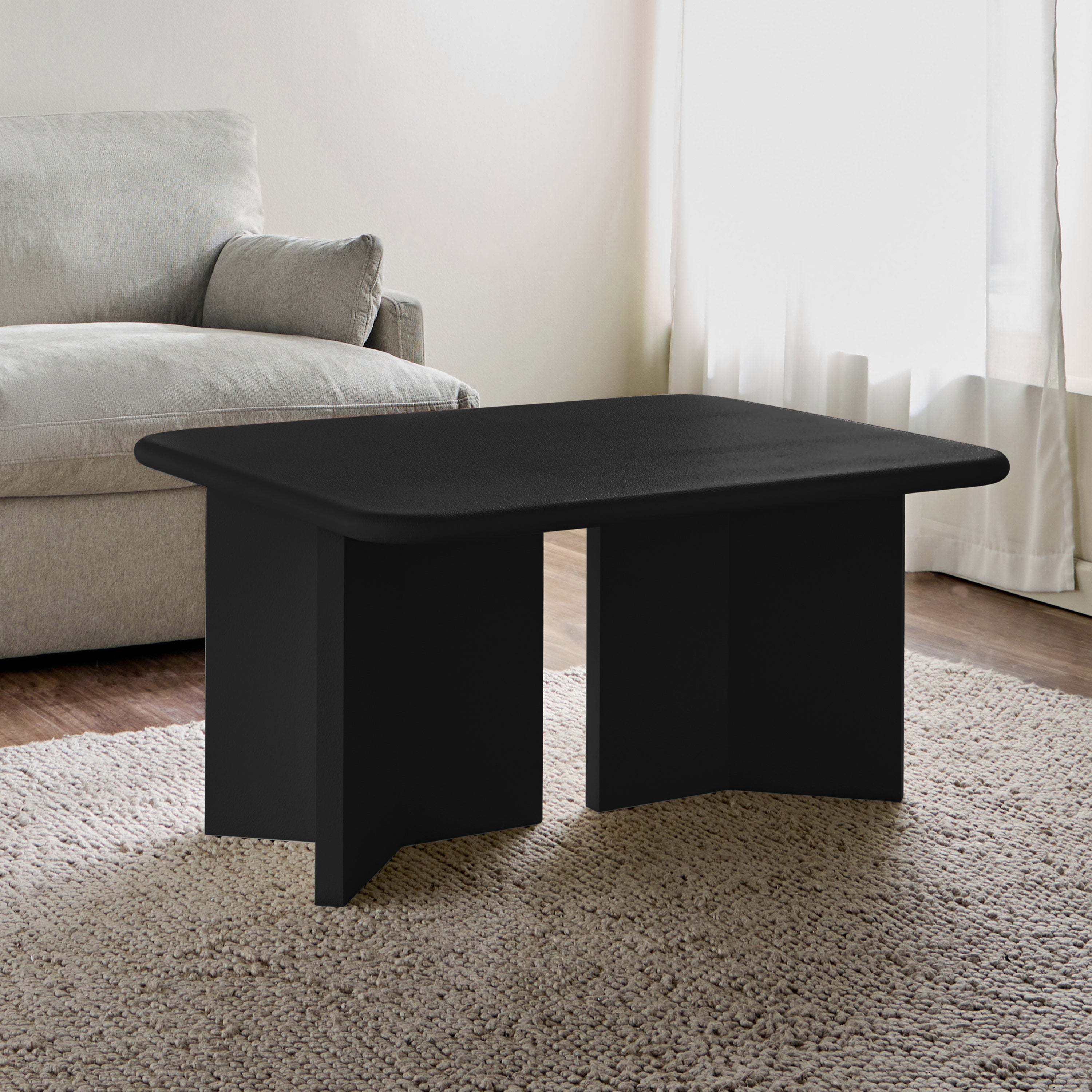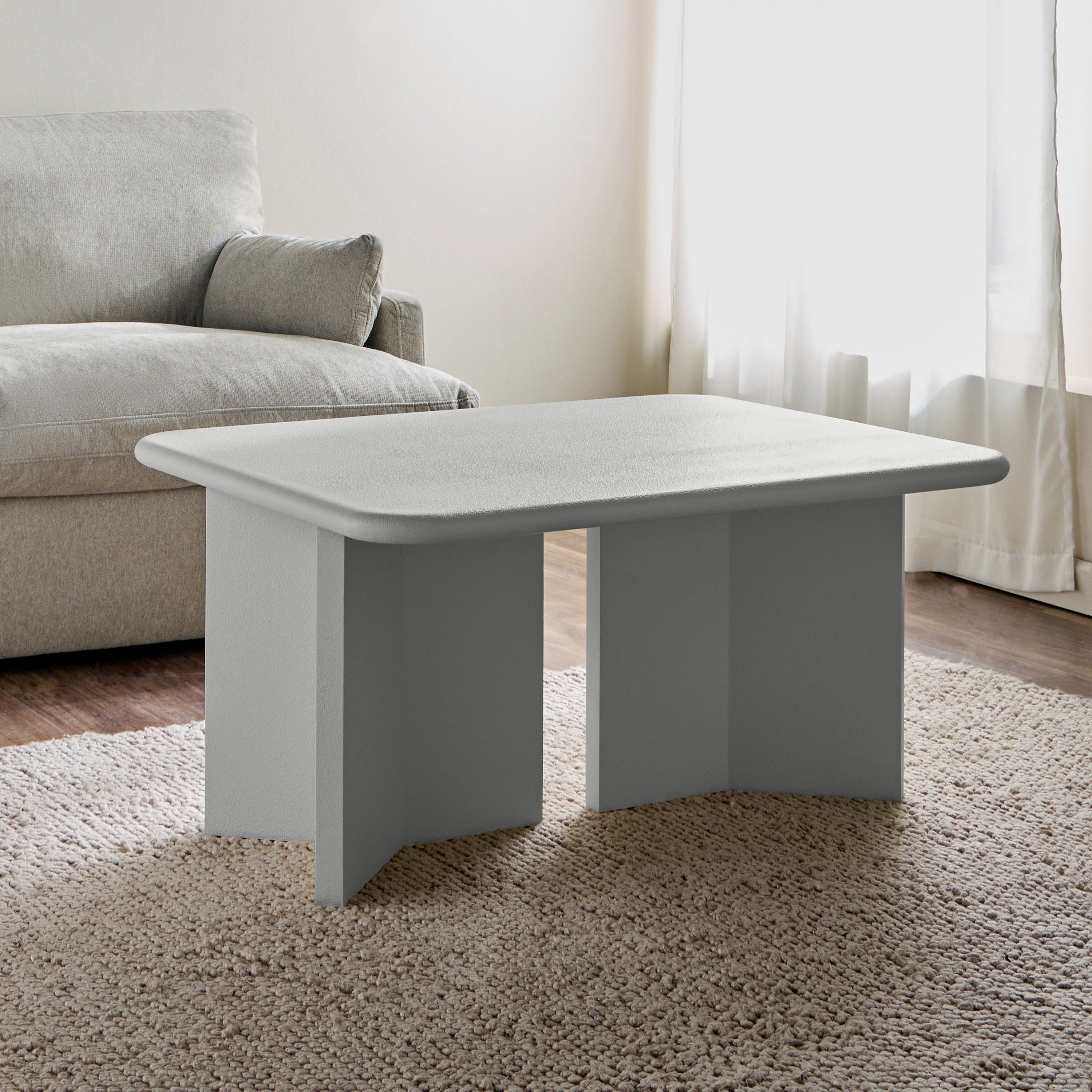 Enhance your living space with this coffee table, a harmonious blend of modern minimalism and architectural elegance. Its smooth, rounded tabletop and uniquely structured base exude contemporary sophistication. Built for durability, the table's textured finish adds depth and refinement. With ample surface space for your essentials, it seamlessly combines style and function, making it a versatile and striking centerpiece for any interior.