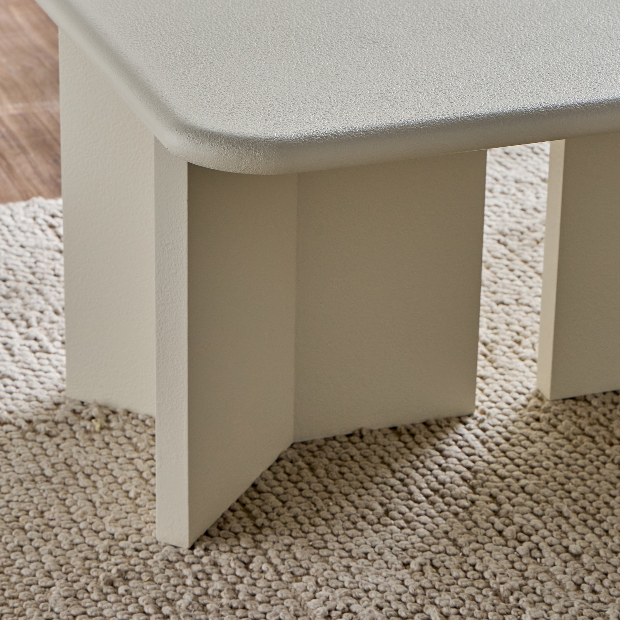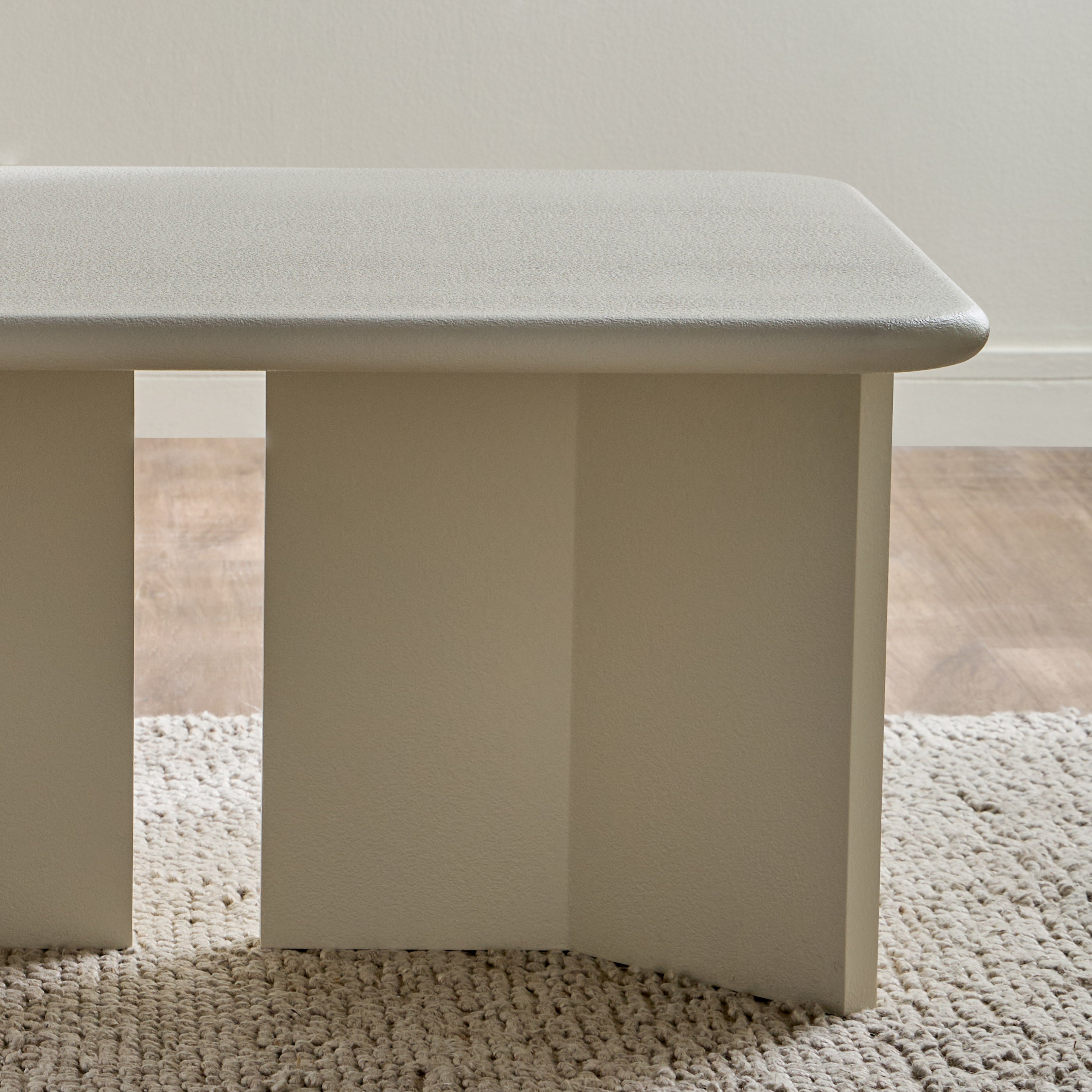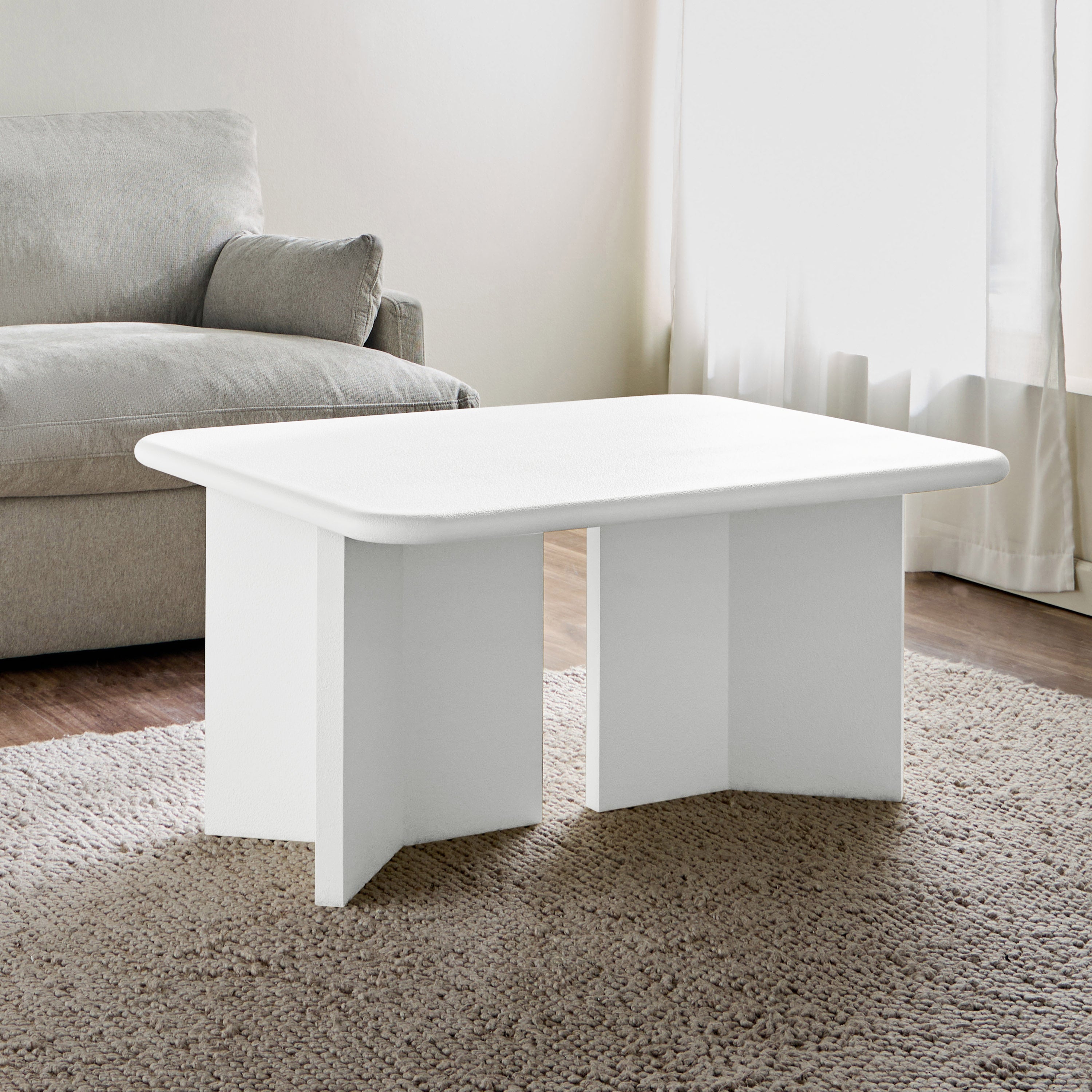 Enhance your living space with this coffee table, a harmonious blend of modern minimalism and architectural elegance. Its smooth, rounded tabletop and uniquely structured base exude contemporary sophistication. Built for durability, the table's textured finish adds depth and refinement. With ample surface space for your essentials, it seamlessly combines style and function, making it a versatile and striking centerpiece for any interior.