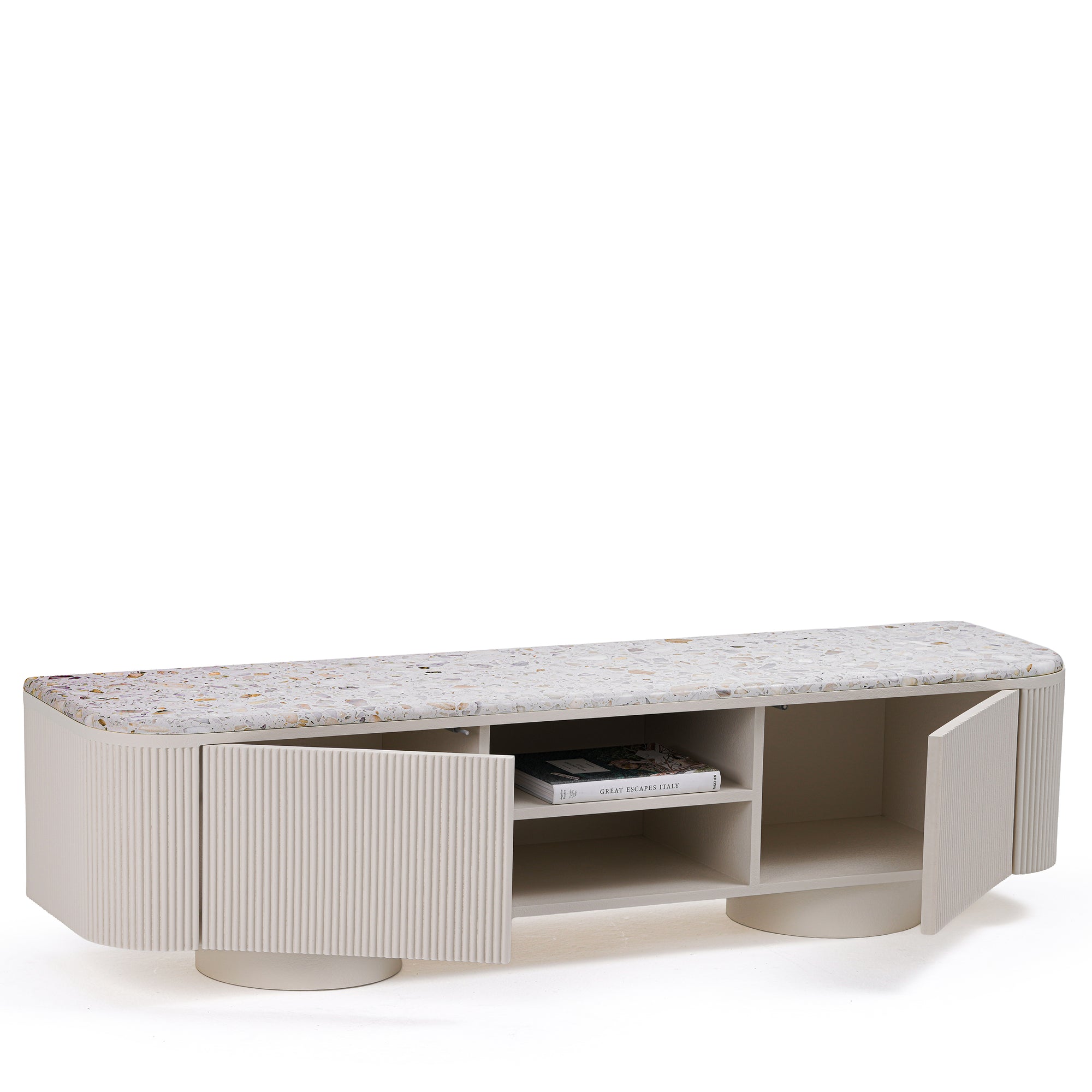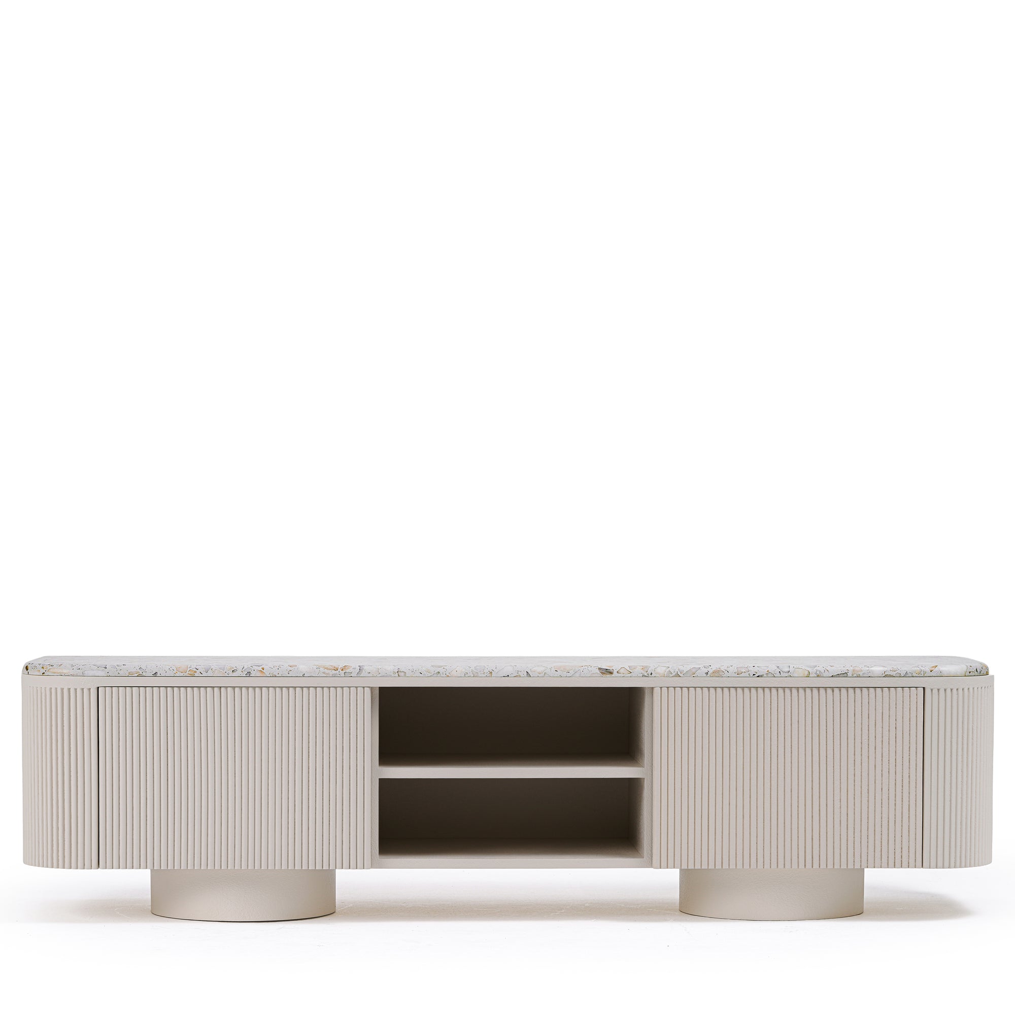 Elevate your living space with this refined terrazzo-top media console. Featuring a rounded silhouette and vertically fluted base, it exudes contemporary elegance with a textural twist. The speckled terrazzo surface adds a sophisticated contrast to the matte plaster finish, offering visual interest and a tactile appeal. Resting on cylindrical legs, this piece balances grace and grounding form. With thoughtfully integrated shelving and closed storage, it’s a seamless fusion of artful design and everyday function.