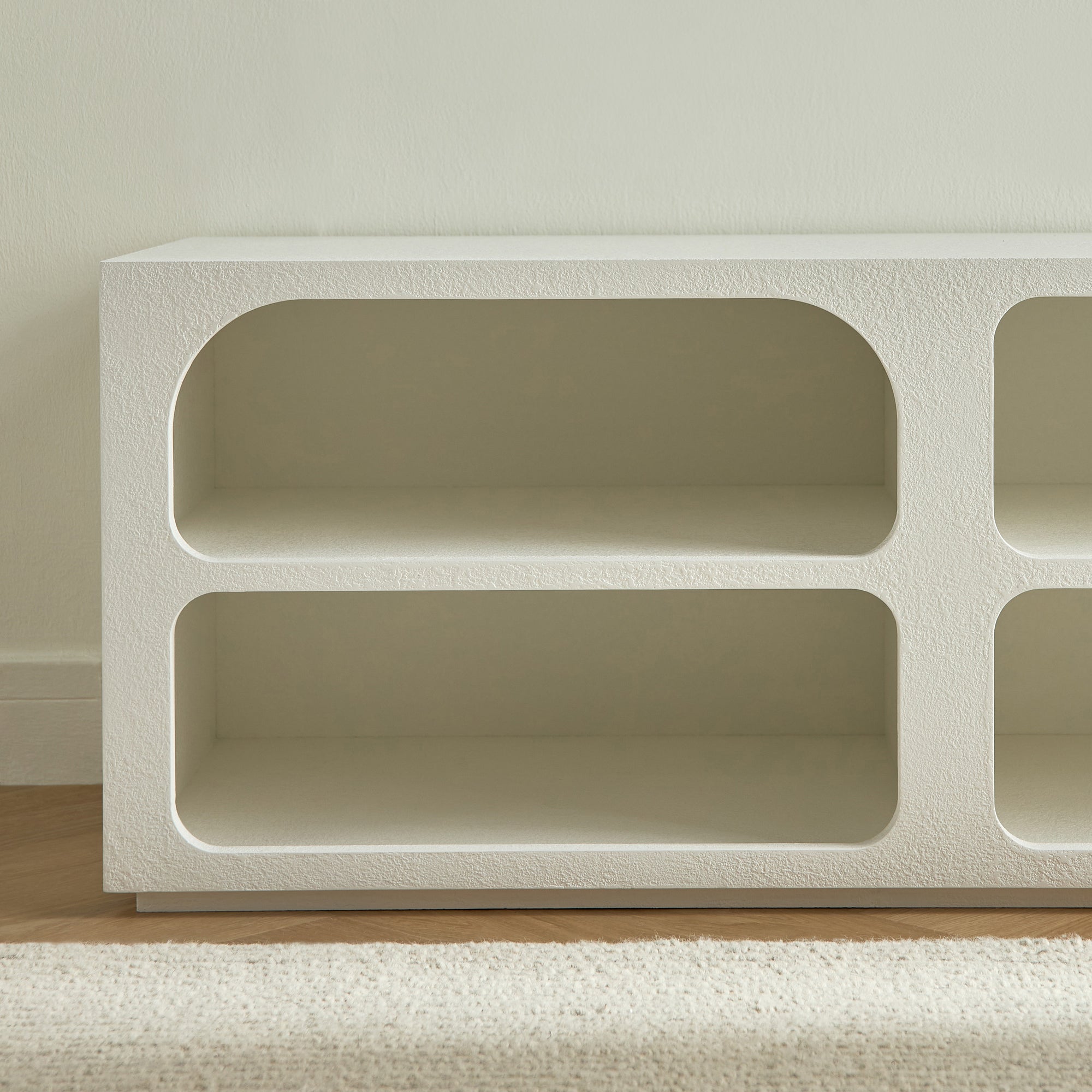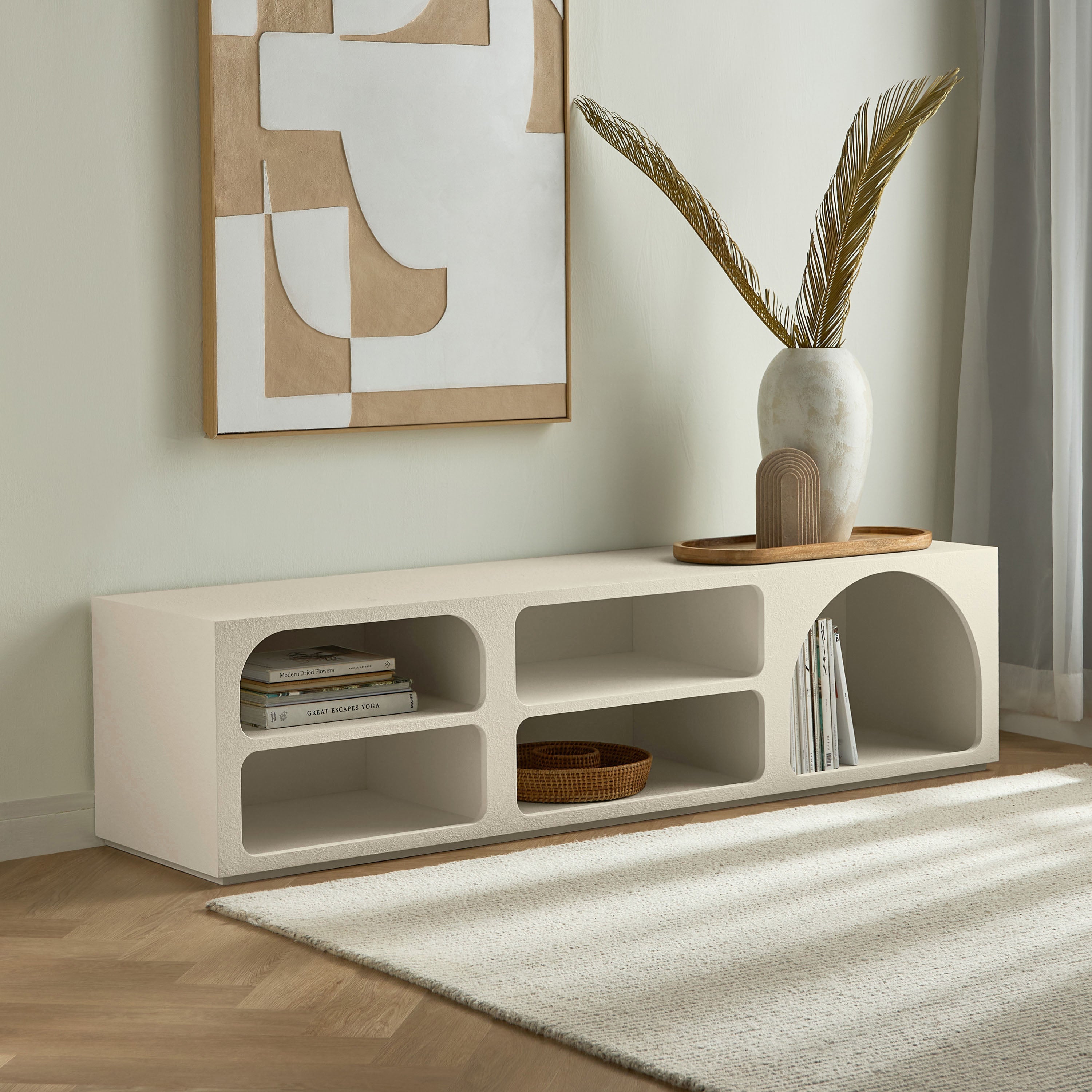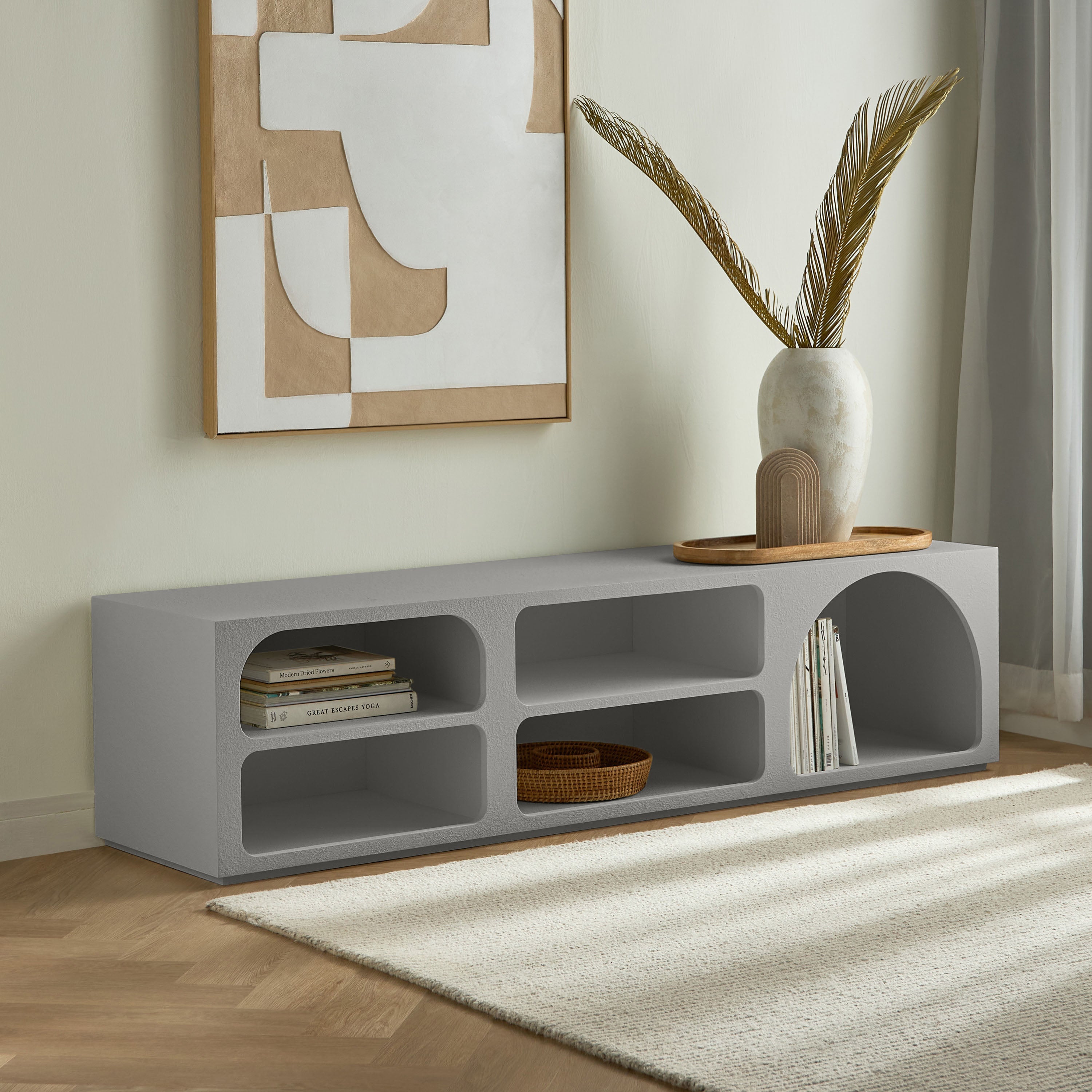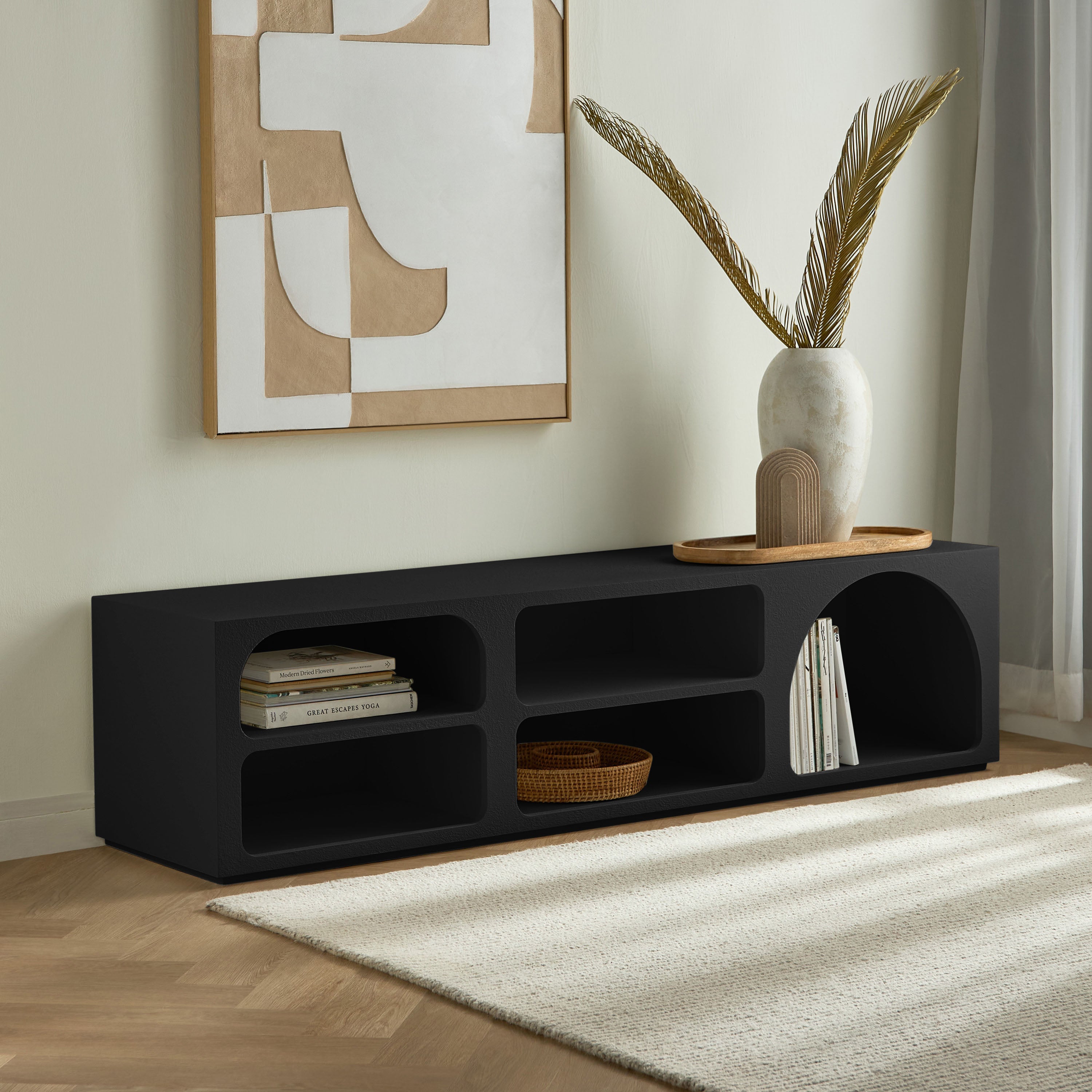 This television unit is a stylish and functional addition to any living space. Its modern design can easily accommodate a television screen of up to fifty-five inches. Crafted from quality engineered wood, this unit ensures durability. It offers ample storage space for your entertainment essentials, keeping your living room organized and clutter-free.