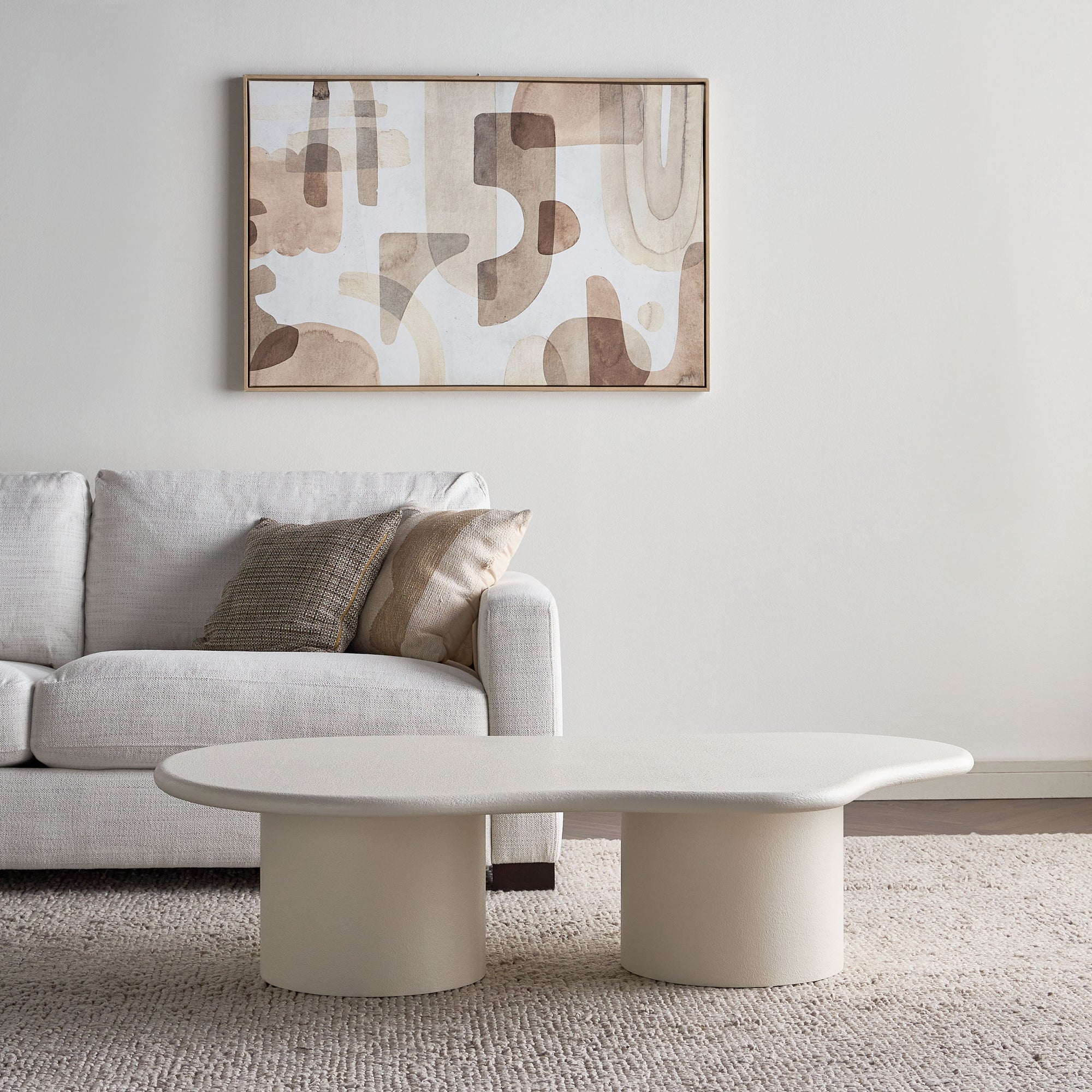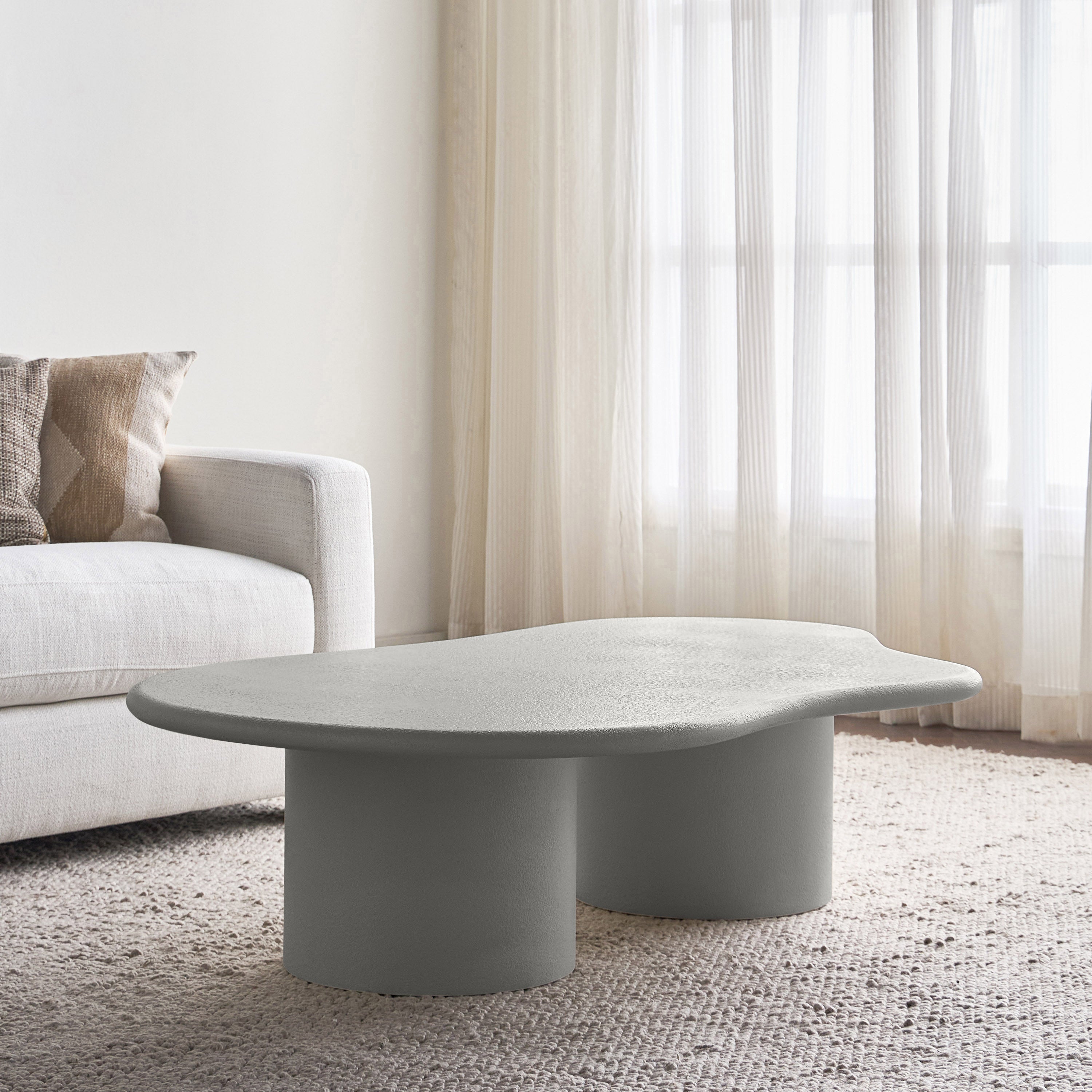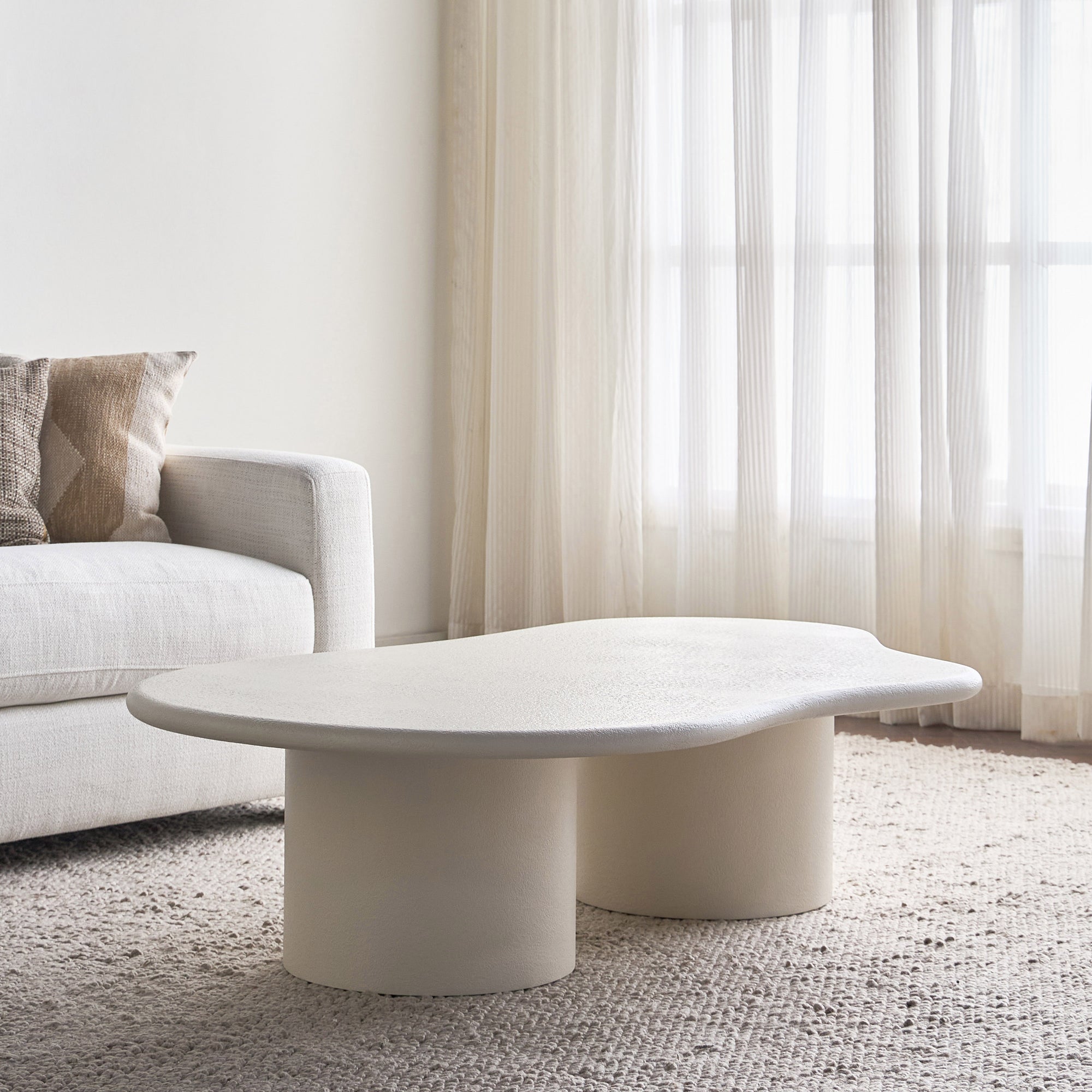 The table features soft, organic curves and a playful yet elegant form. The two cylindrical bases complement the undulating tabletop, creating a harmonious flow. Perfect for adding a sculptural element to any living space, this coffee table blends artistry and function seamlessly. Finished in plaster, it embodies a smooth, natural aesthetic that draws inspiration from water’s flowing movements, making it a statement piece in both modern and minimalistic interiors.