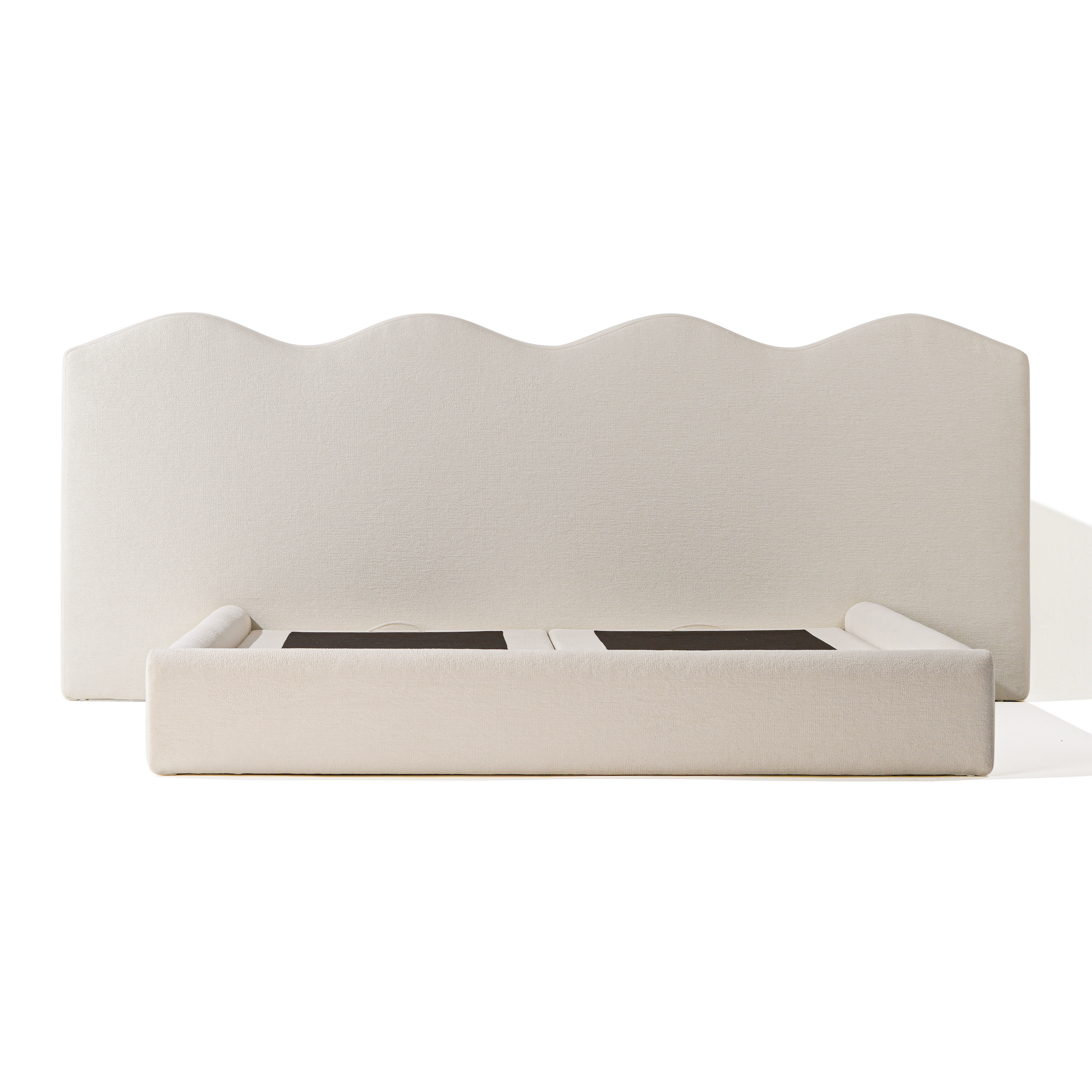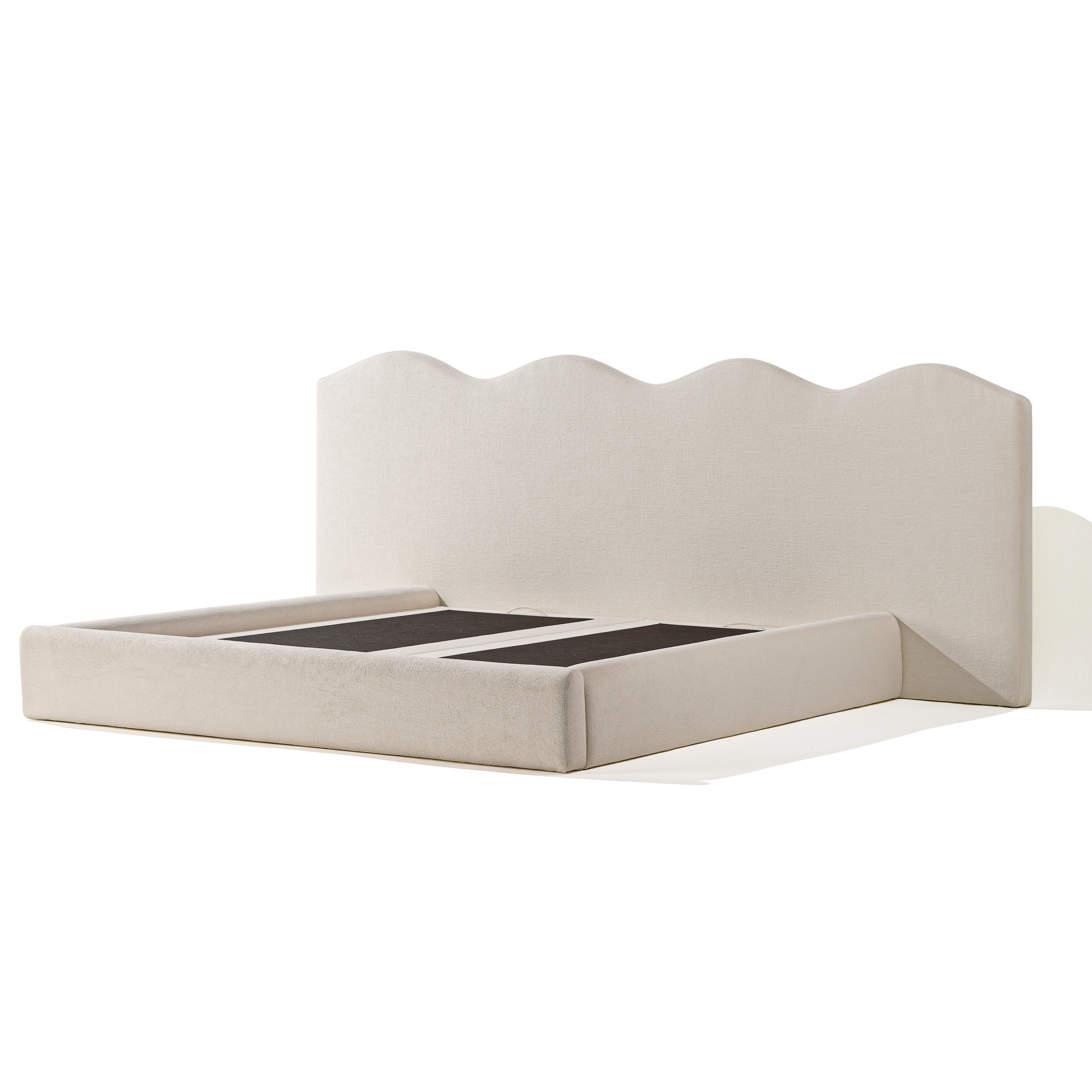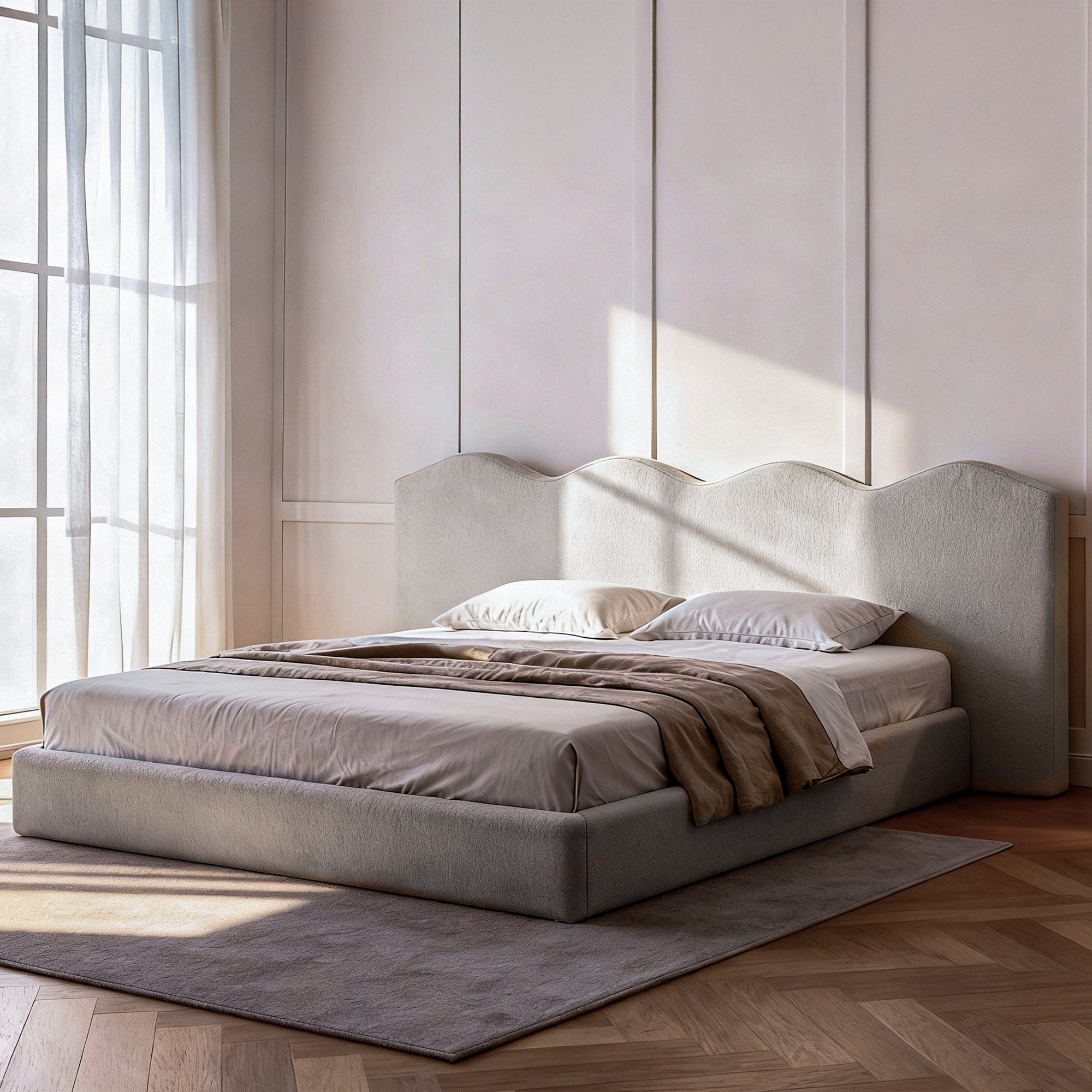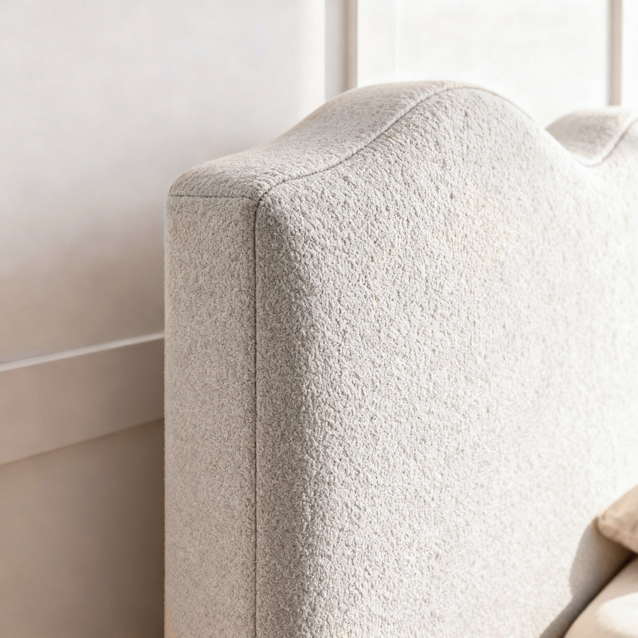 The Hugger Bed brings a touch of playful sophistication with its gently scalloped headboard, echoing the calming rhythm of waves. Its structured form balances charm with strength, offering reliable support while maintaining a soft, inviting presence. Upholstered in a smooth, neutral-toned fabric, the bed seamlessly blends durability with elegance. Perfect for a modern or contemporary space, the Ripple Bed adds character while ensuring comfort and style in every detail.