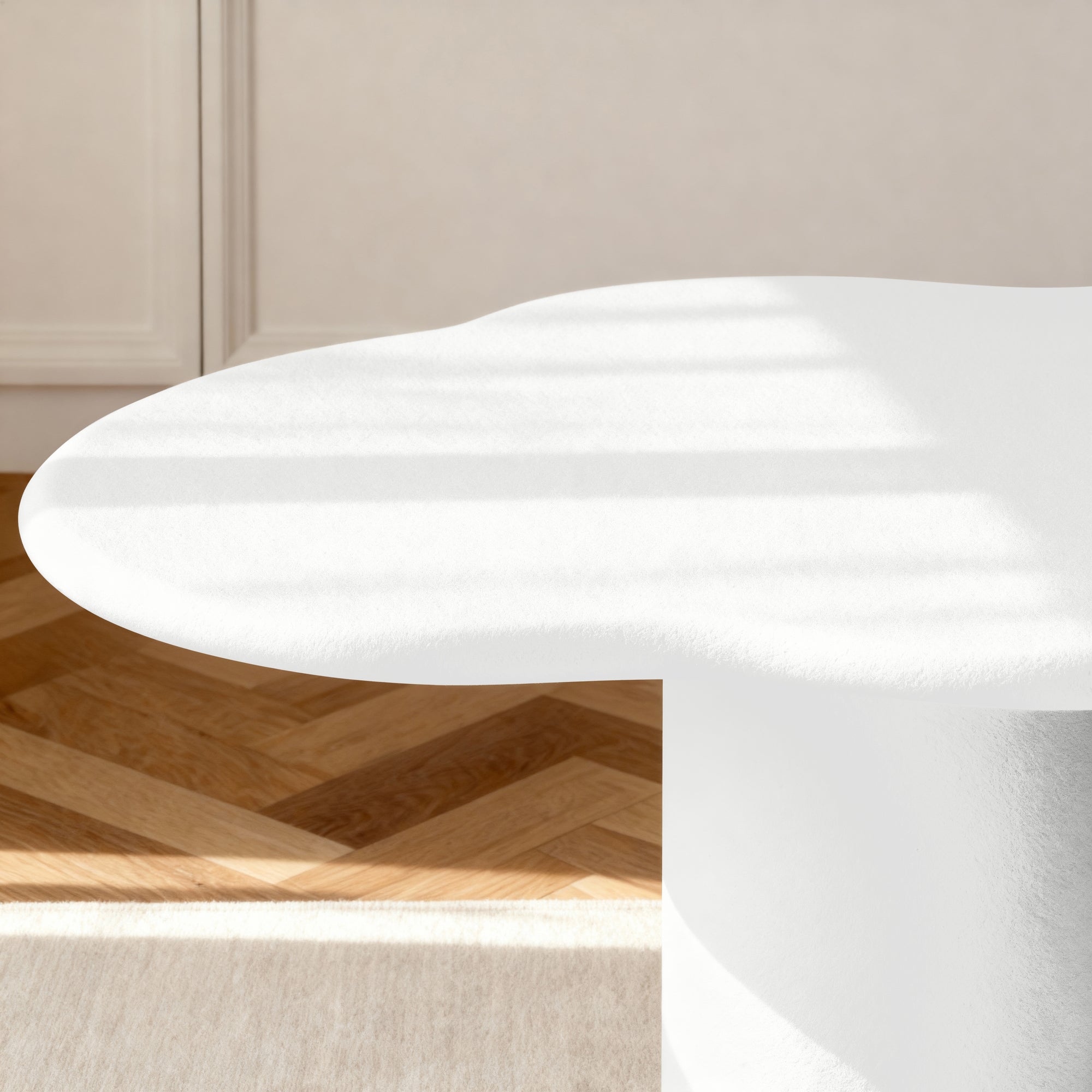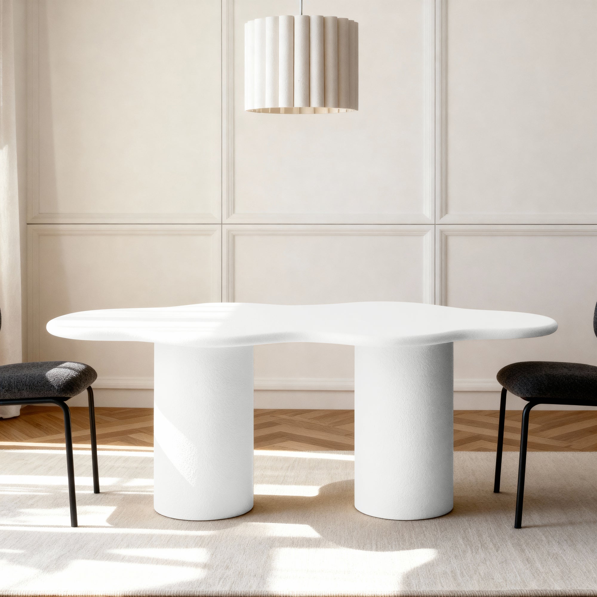 This dining table is a striking masterpiece that elevates any dining space. Its wave-like top, supported by sturdy cylindrical legs, creates a mesmerizing visual effect. The textured finish adds depth to its contemporary design, making it an ideal choice for modern homes. Gather your loved ones for memorable meals and create lasting moments around this exceptional table.