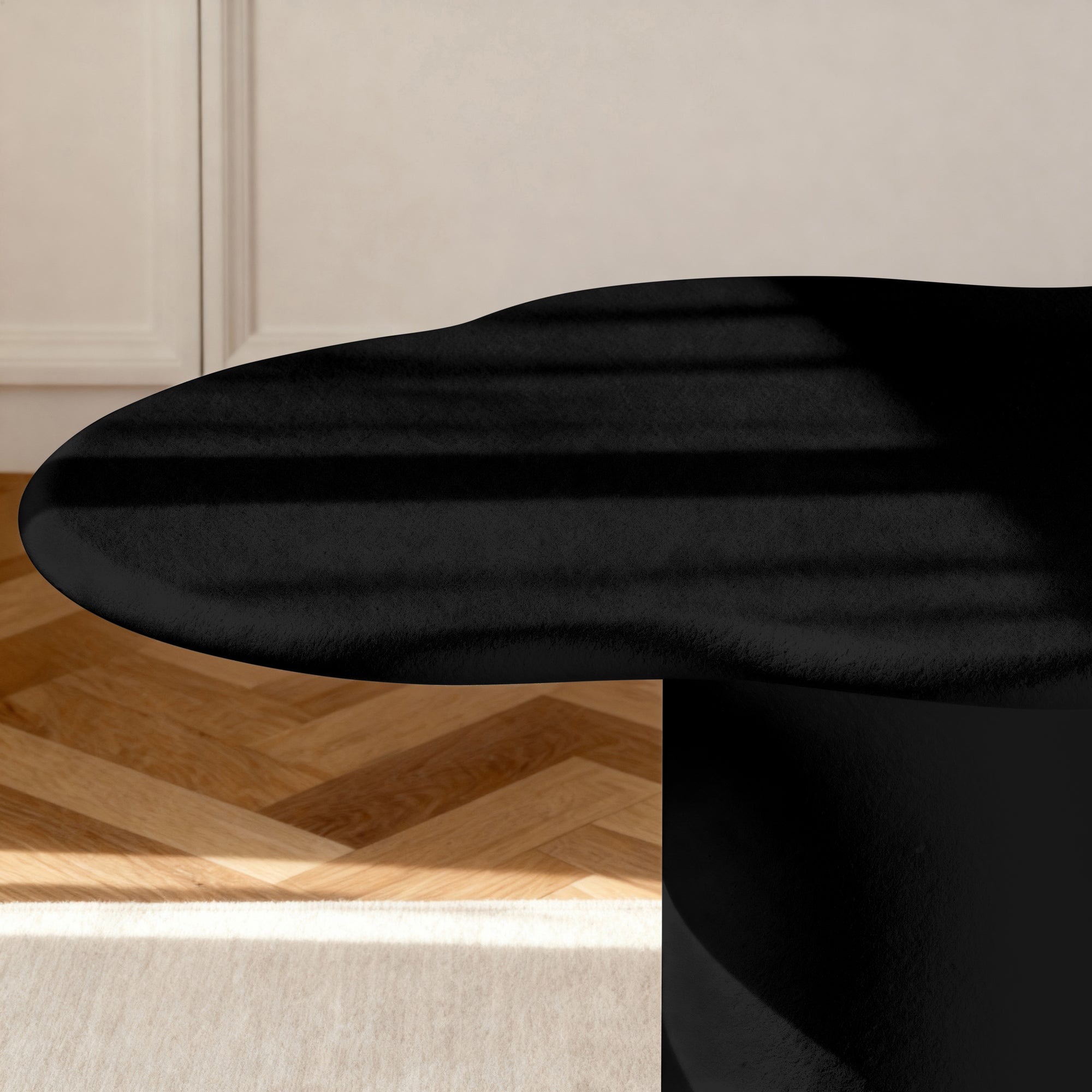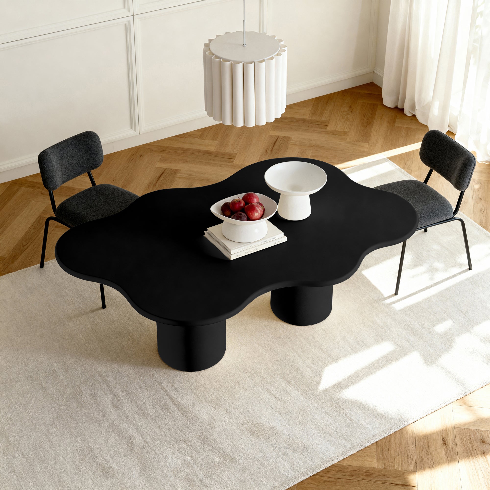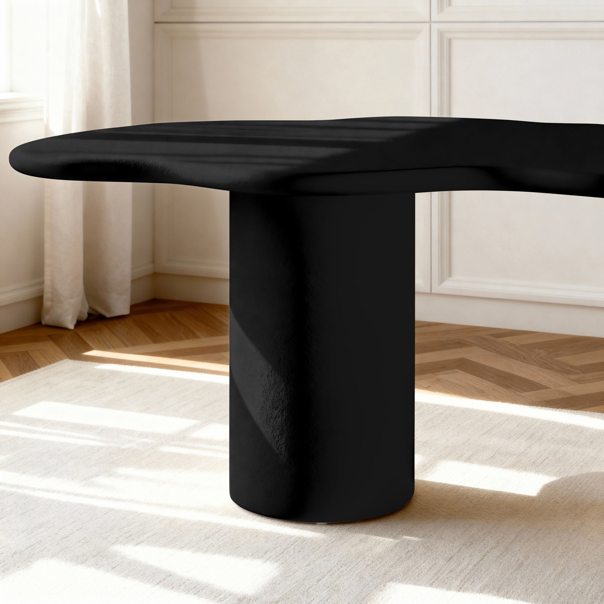 This dining table is a striking masterpiece that elevates any dining space. Its wave-like top, supported by sturdy cylindrical legs, creates a mesmerizing visual effect. The textured finish adds depth to its contemporary design, making it an ideal choice for modern homes. Gather your loved ones for memorable meals and create lasting moments around this exceptional table.