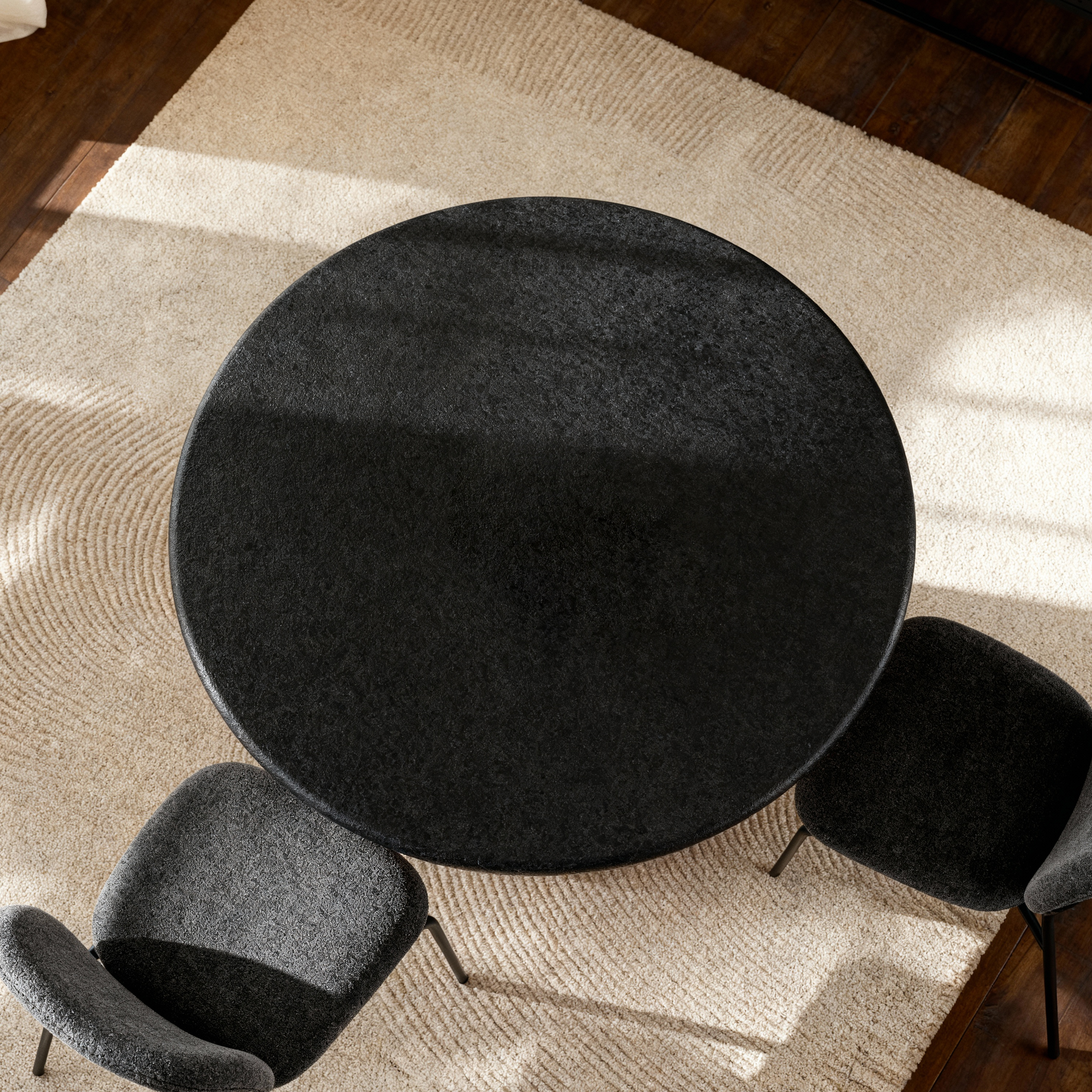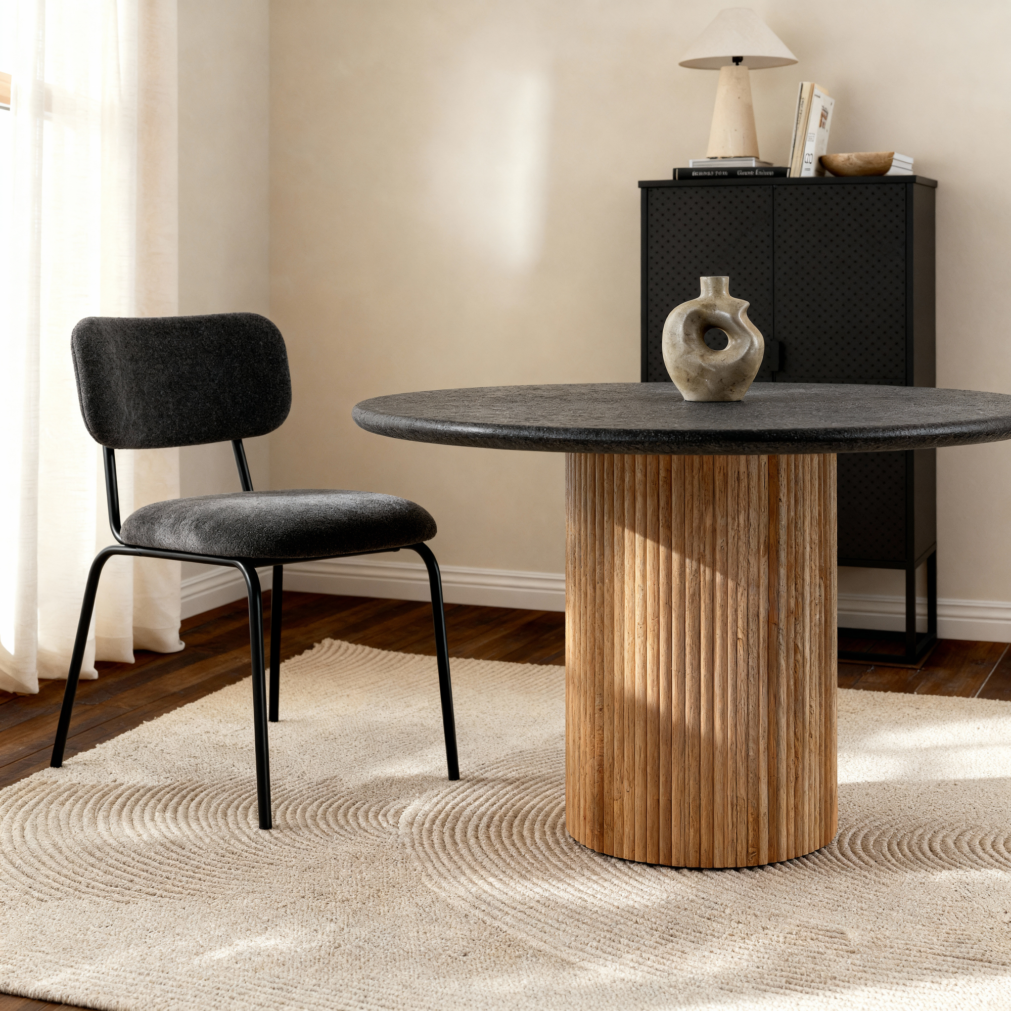Experience the harmony of contrast with this contemporary round table. Its smooth dark-toned circular top rests on a fluted cylindrical base in a warm natural wood finish, creating a balanced interplay of depth and texture. The vertical detailing of the base adds rhythm and sophistication, while the clean silhouette embodies modern minimalism. Versatile and refined, this piece transitions seamlessly between dining, meeting, or display settings—an ideal centerpiece for interiors that value both elegance and organic character.