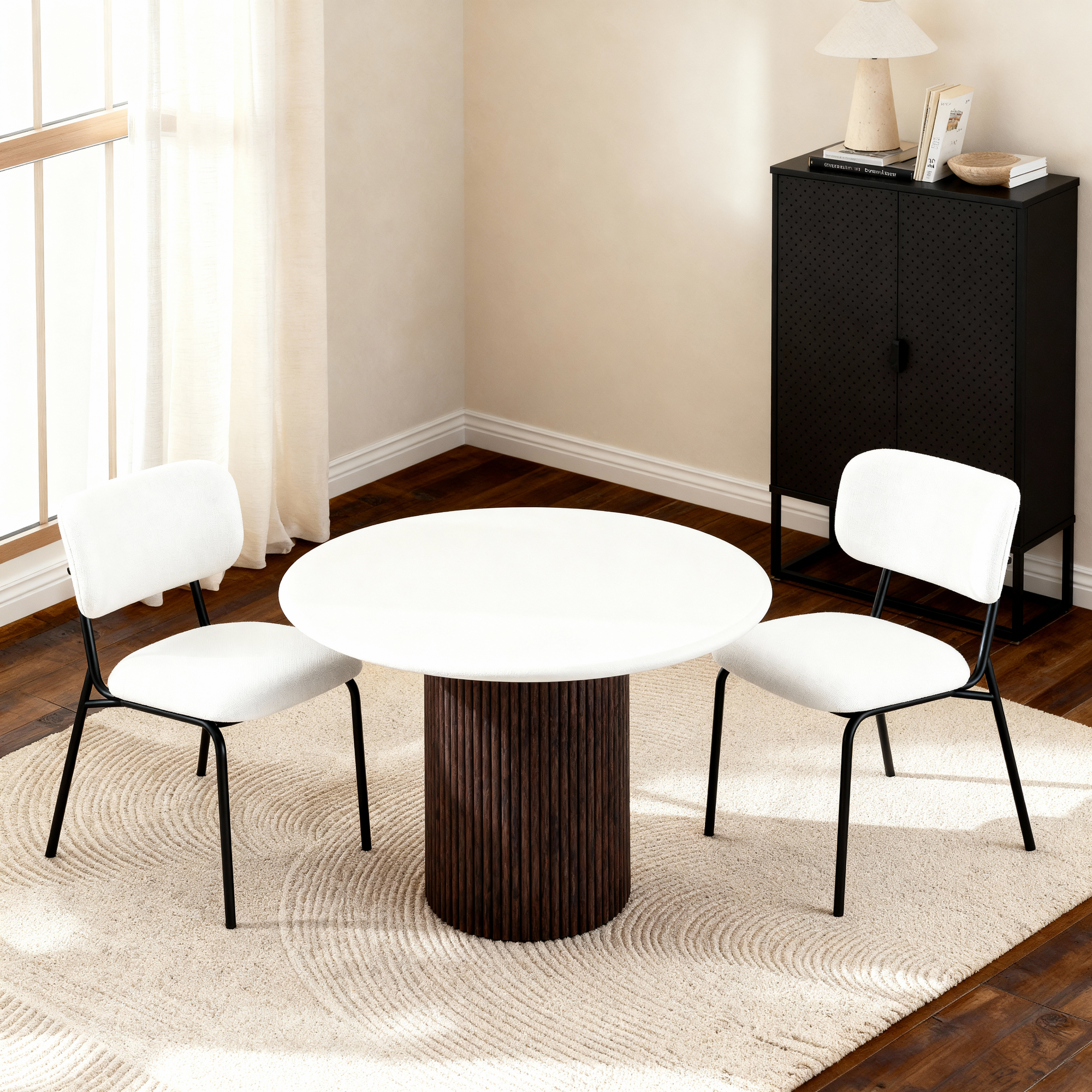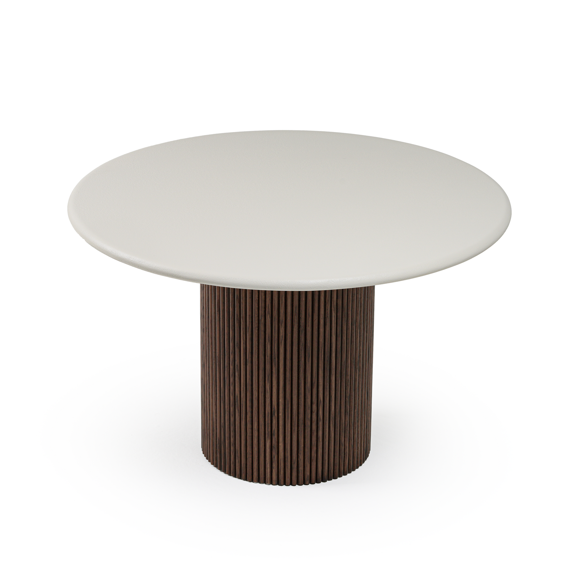 Experience the balance of texture and form with this contemporary round table. A smooth, light-toned circular top is paired with a fluted cylindrical base in a rich dark wood finish, creating a striking interplay of contrast and rhythm. The vertical detailing lends subtle depth, while the clean silhouette embodies modern refinement. Versatile in purpose, this piece transitions seamlessly between dining, meeting, or display settings—an ideal anchor for interiors defined by timeless sophistication.