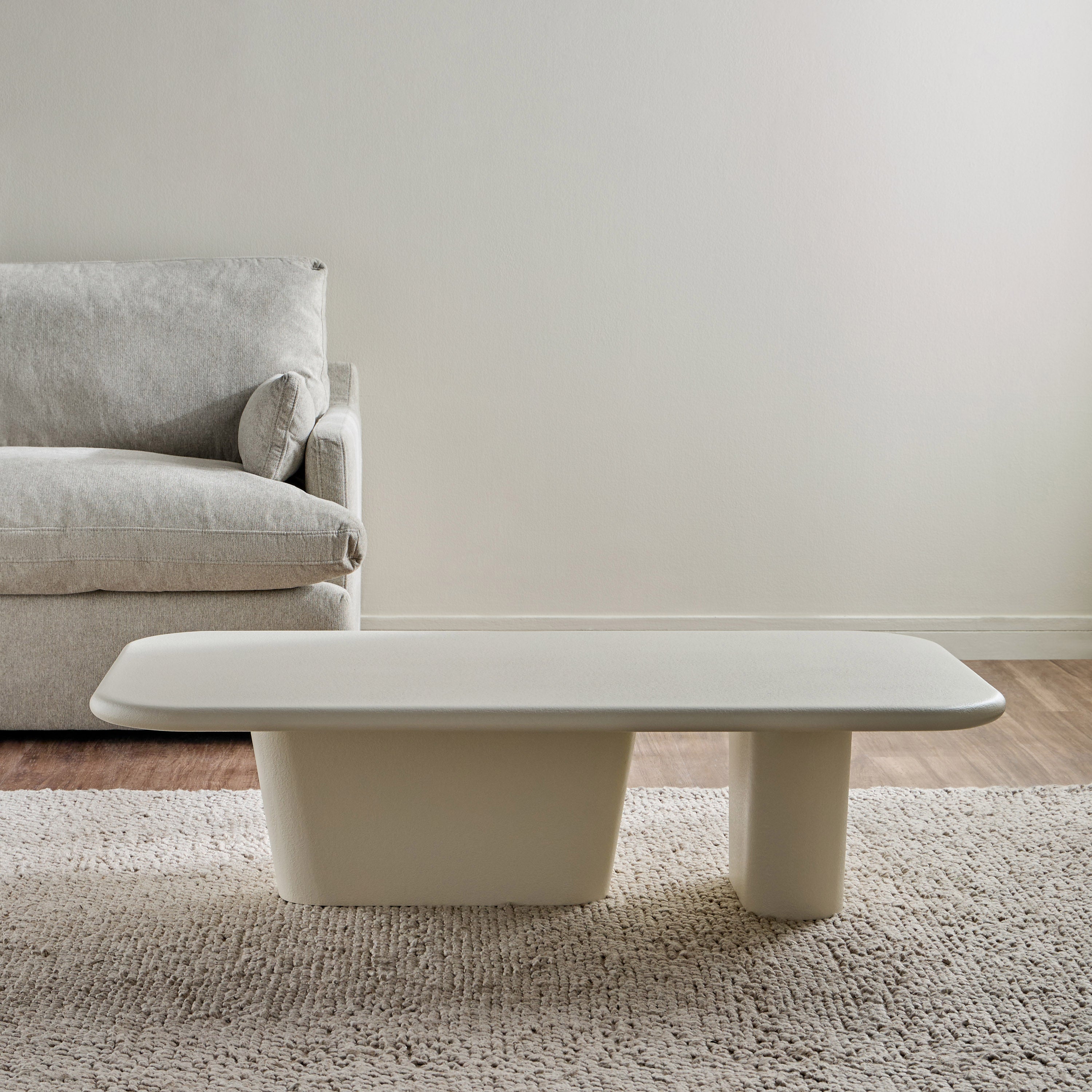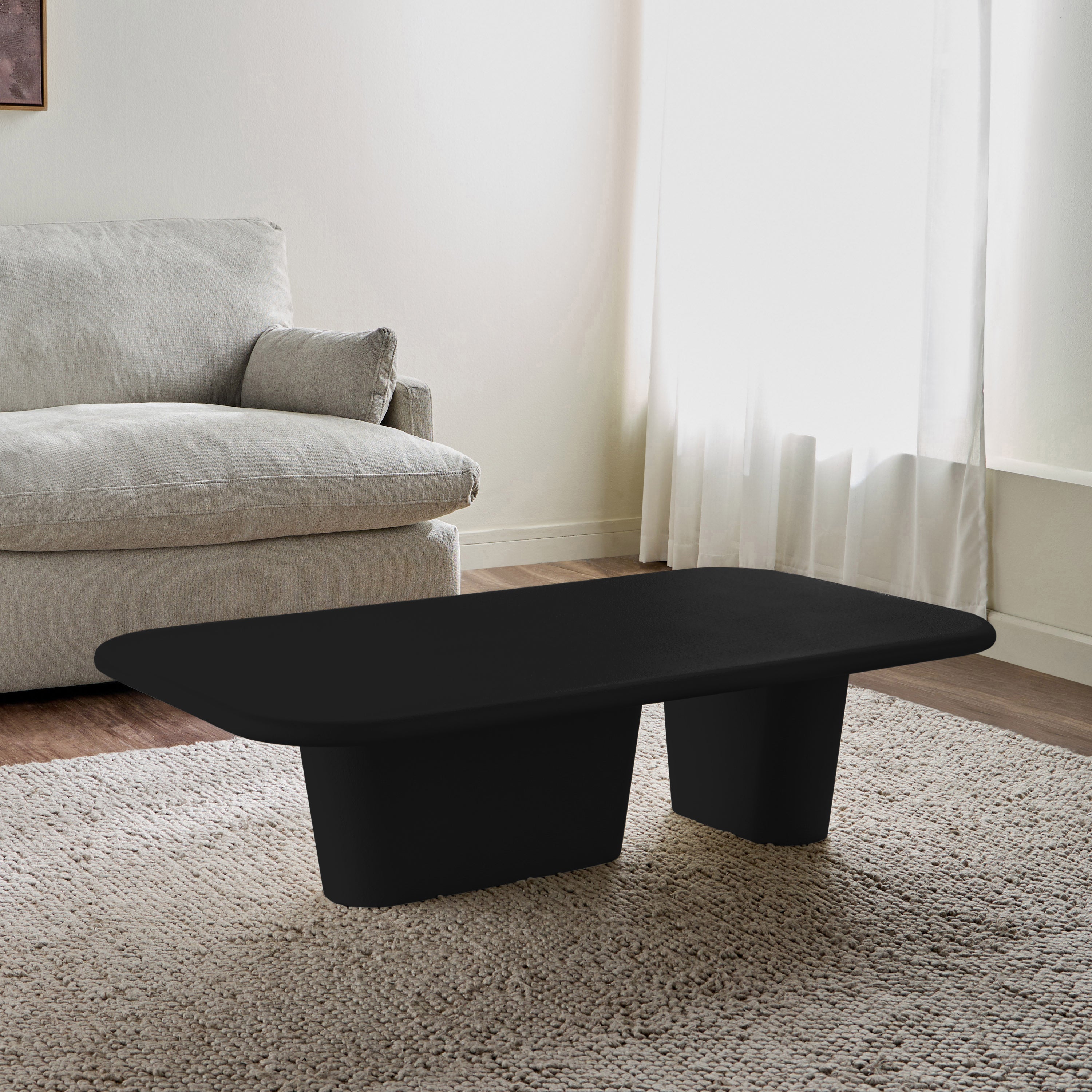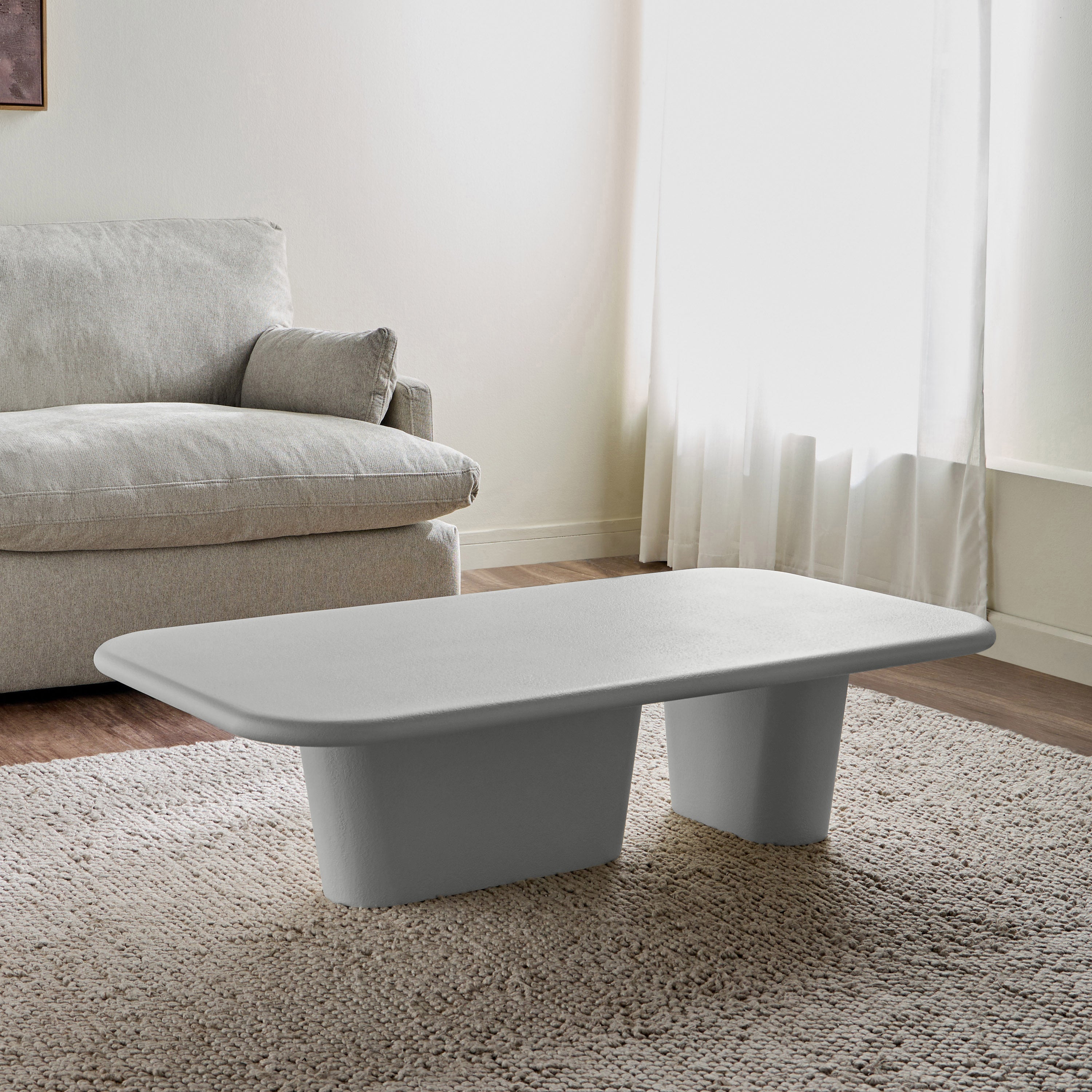 This coffee table embodies contemporary elegance with its sleek, low-profile silhouette and refined textured finish, adding a sophisticated yet understated charm to any living space. The sculptural dual-leg base ensures stability while infusing an artistic touch into its minimalist design. Crafted from durable material, it promises longevity and resilience, while the spacious tabletop offers ample surface area for your essentials, perfectly blending form and function for your home.
