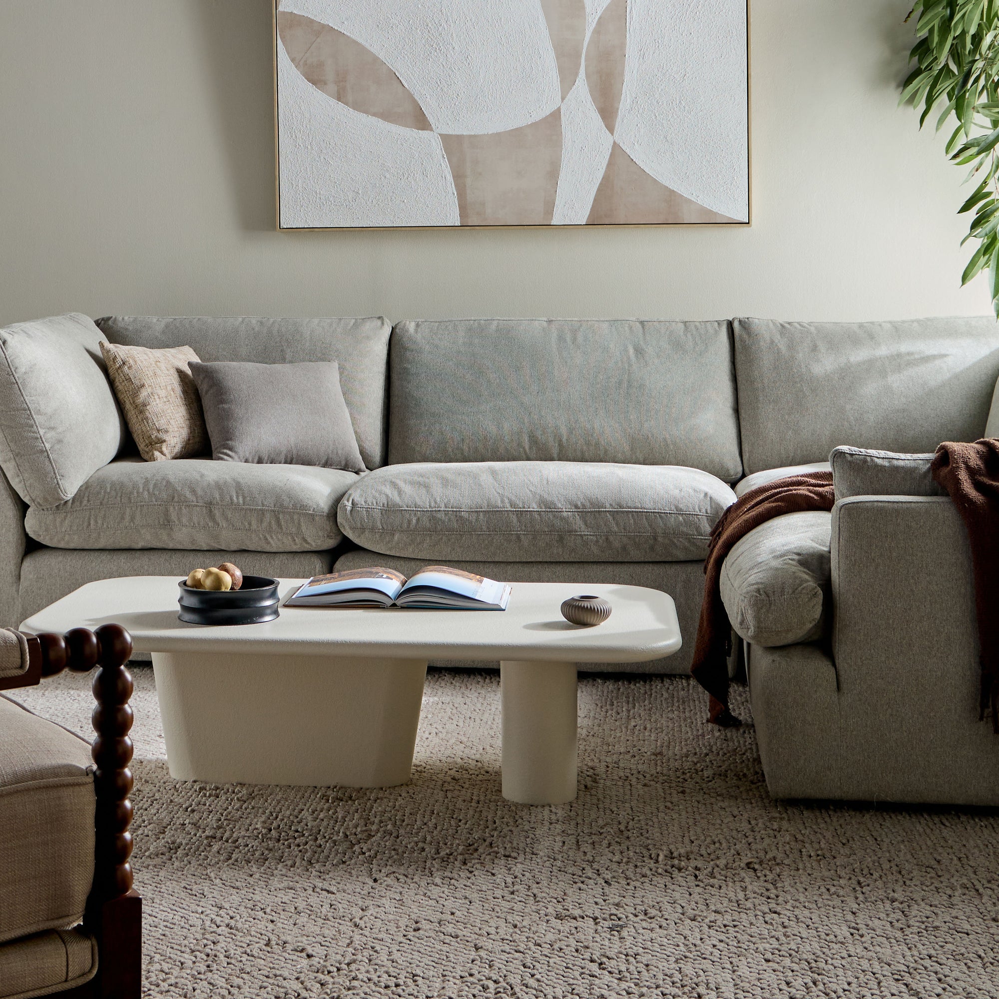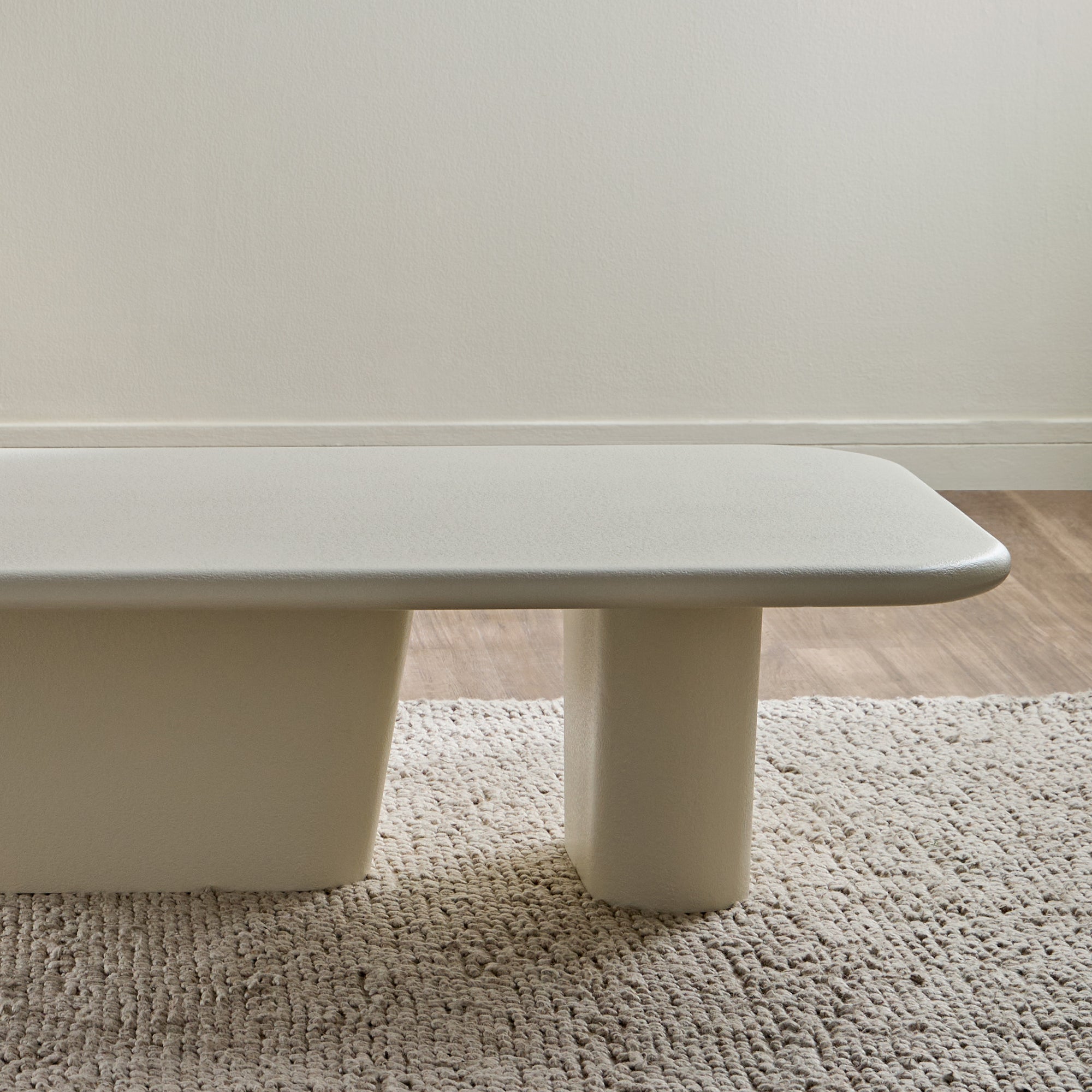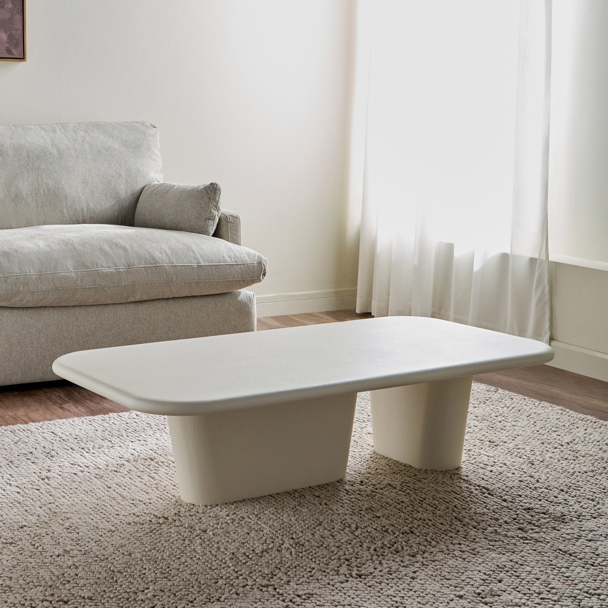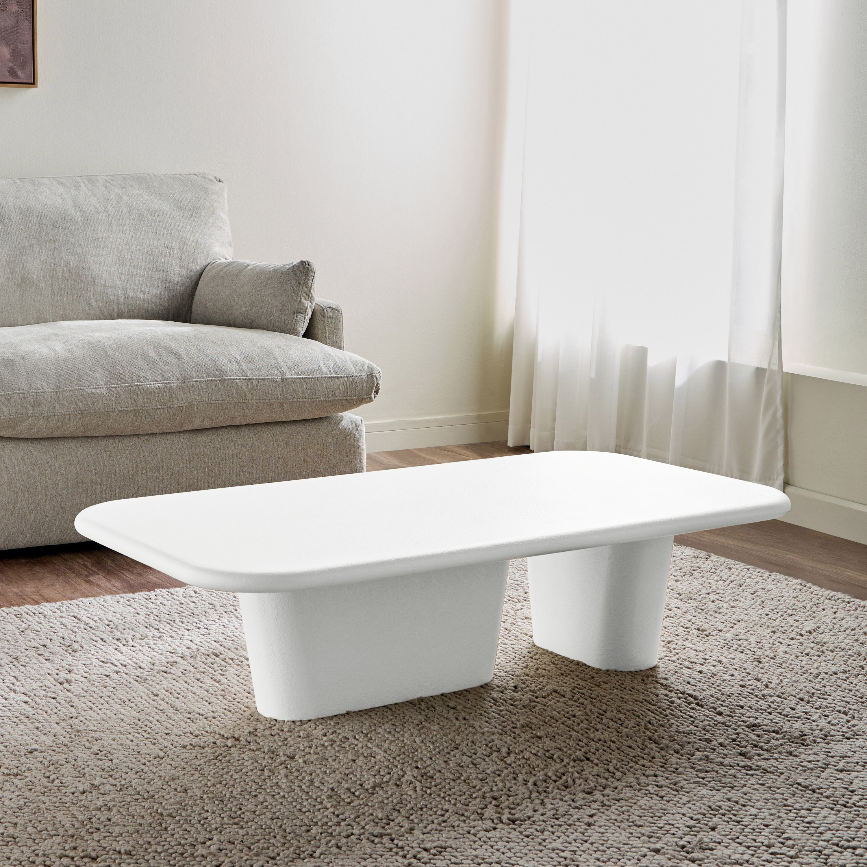 This coffee table embodies contemporary elegance with its sleek, low-profile silhouette and refined textured finish, adding a sophisticated yet understated charm to any living space. The sculptural dual-leg base ensures stability while infusing an artistic touch into its minimalist design. Crafted from durable material, it promises longevity and resilience, while the spacious tabletop offers ample surface area for your essentials, perfectly blending form and function for your home.