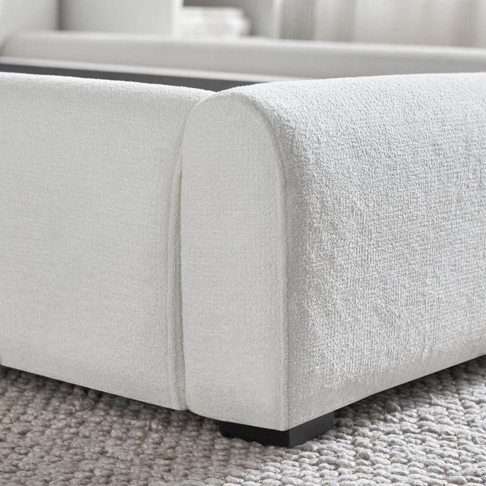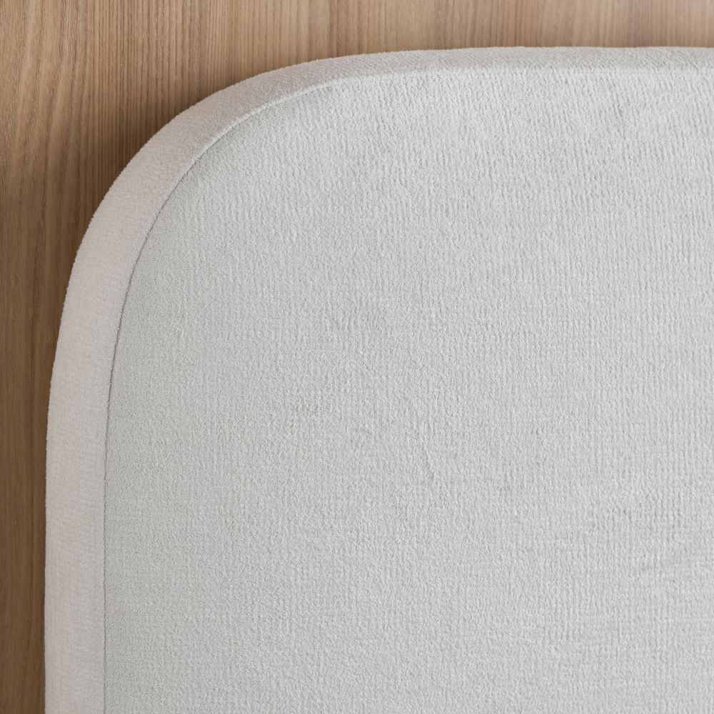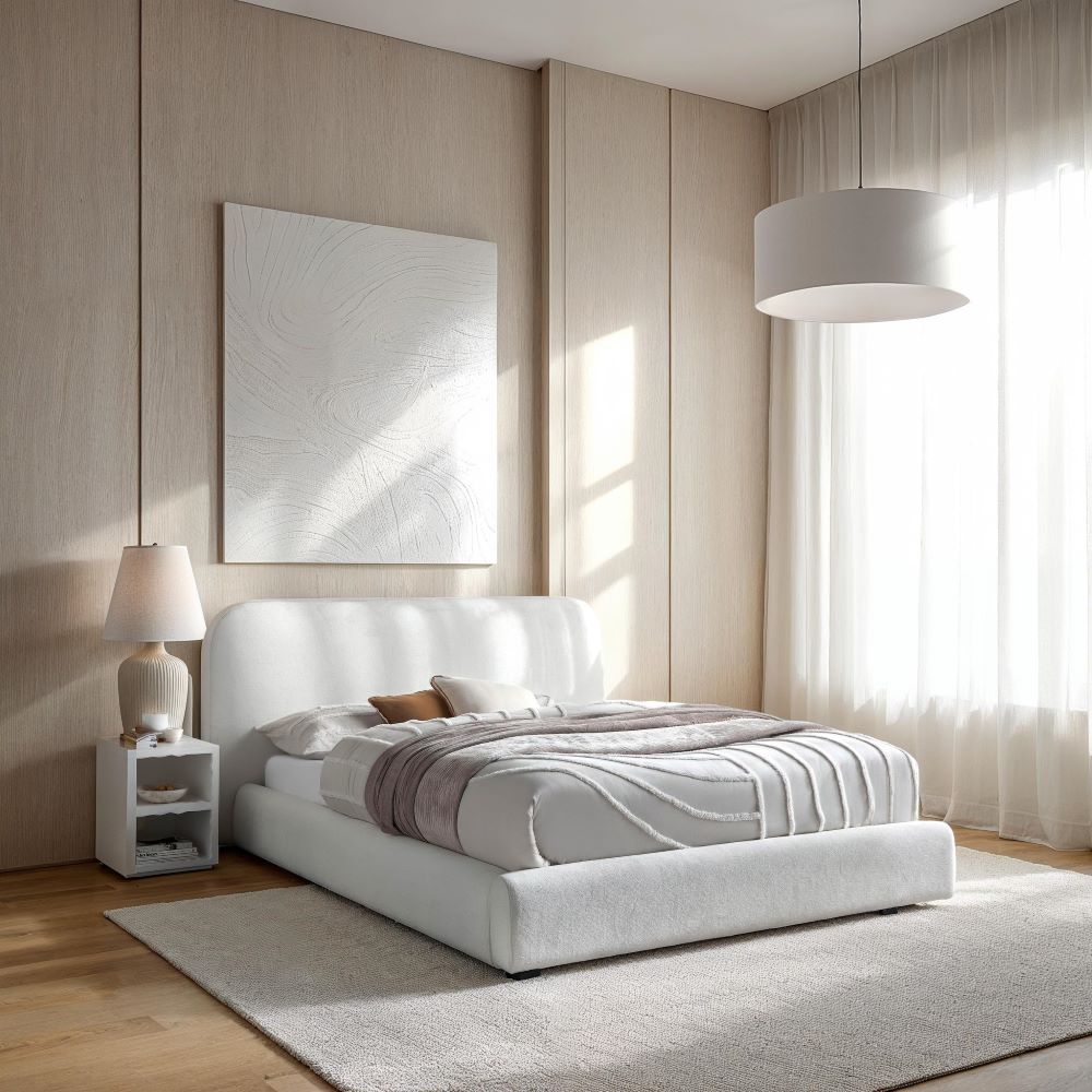 This cozy bed blends contemporary sophistication with timeless design. Its standout feature is the gently arched, fully upholstered fabric headboard, adding an elegant touch to your bedroom. The low-profile frame, crafted from solid wood, offers sturdy support while complementing a modern, minimalist aesthetic. Perfectly tailored for those who value understated luxury, this bed creates a serene and stylish focal point in any sleeping space, combining both comfort and chic design.