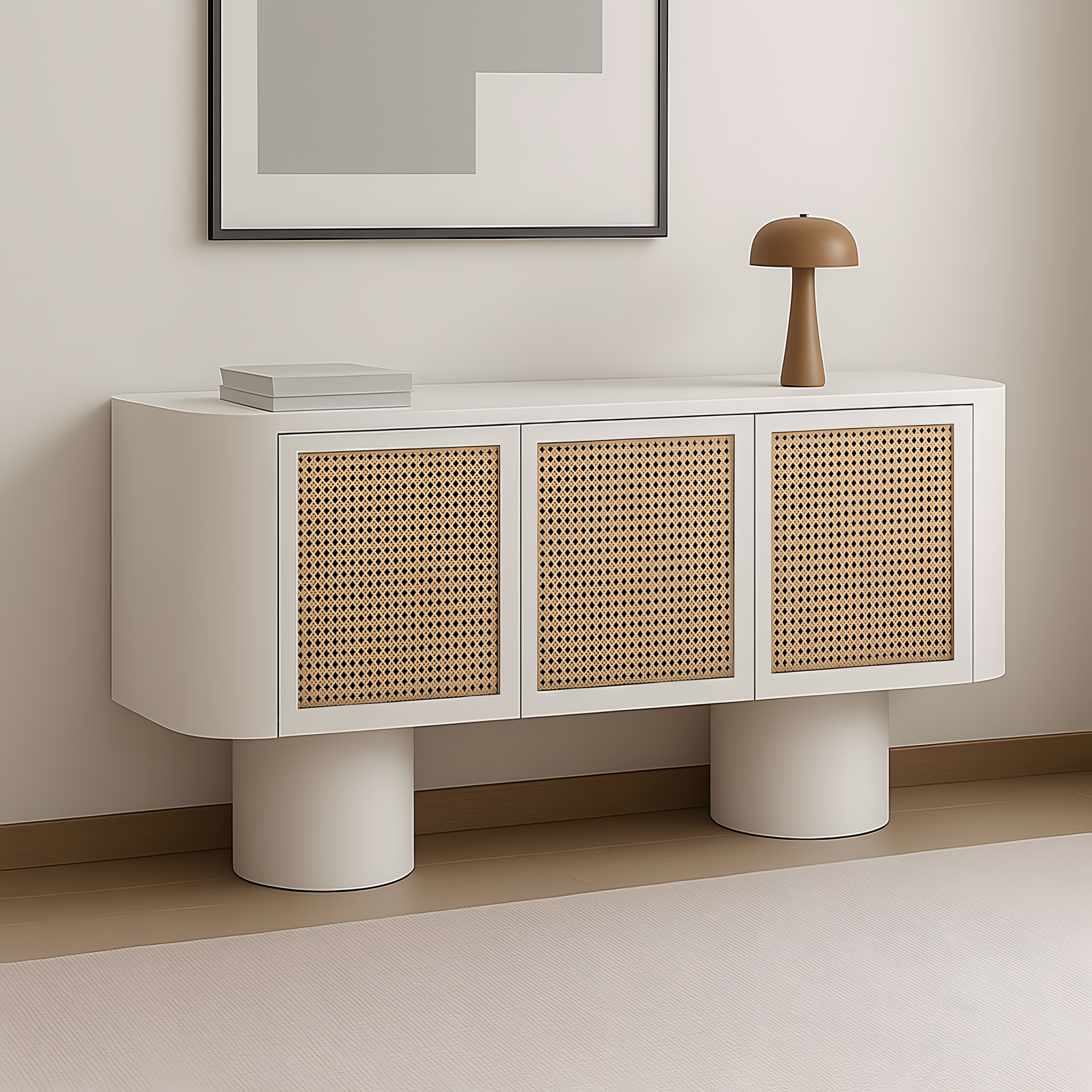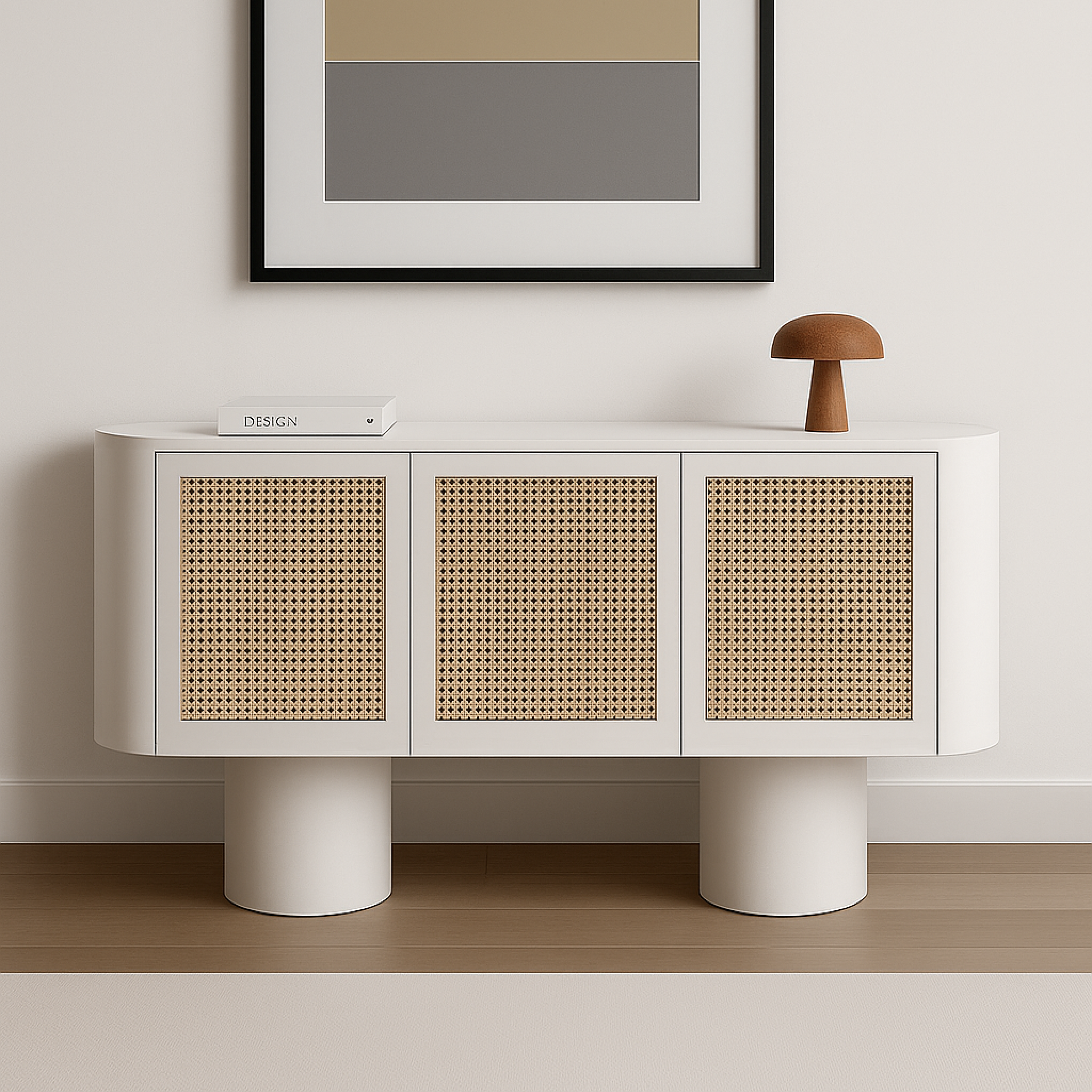 Experience the union of clean geometry and organic texture with this Meadow Cane Buffet. Crafted in a smooth plaster finish, it features three central cane-panel doors framed by soft curves that bring a natural warmth to its modern silhouette. Elevated on cylindrical pedestal legs, the design creates a sense of lightness while ensuring sturdy support. Perfect for dining rooms or living spaces, it offers concealed storage that keeps interiors uncluttered, blending functional elegance with artisanal detail.