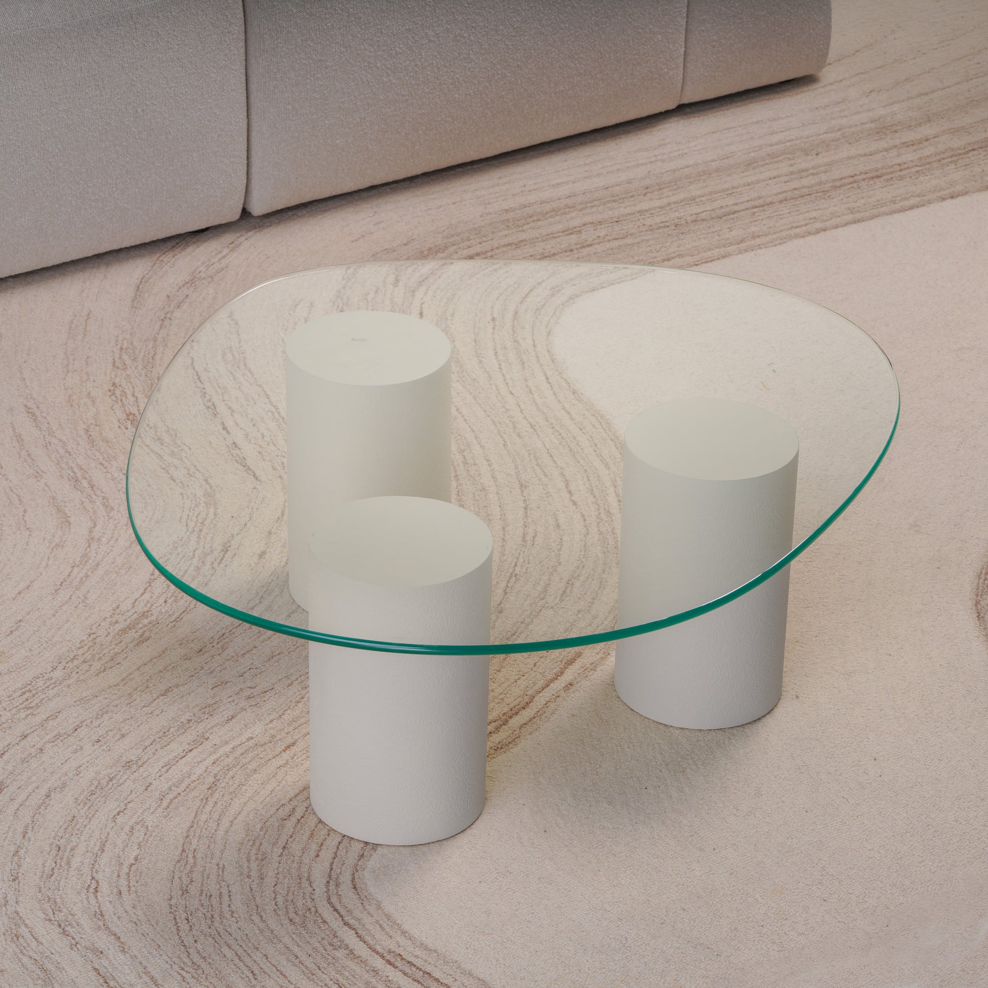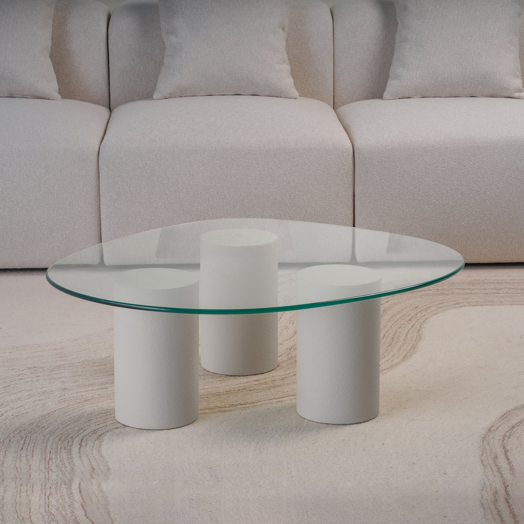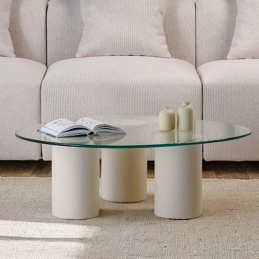 Experience the balance of softness and structure with this Pebble Top Glass Coffee Table. Designed with three cylindrical plaster-finished bases and topped with a fluid, organically shaped glass surface, it evokes a sense of lightness and sculptural grace. The transparent top enhances visual space, while the solid forms ground the design with quiet strength. Perfect for modern living rooms, it merges artistic presence with everyday functionality.