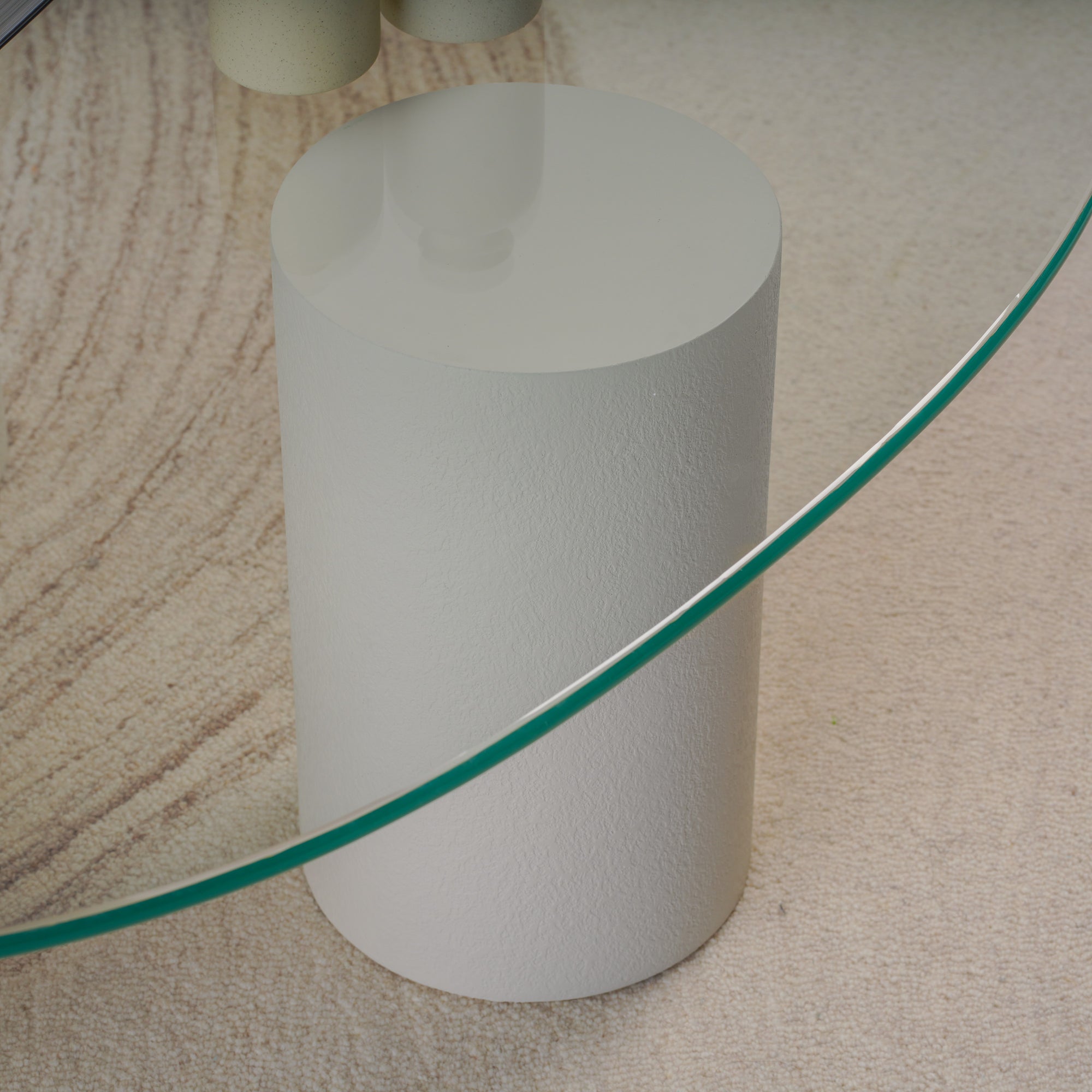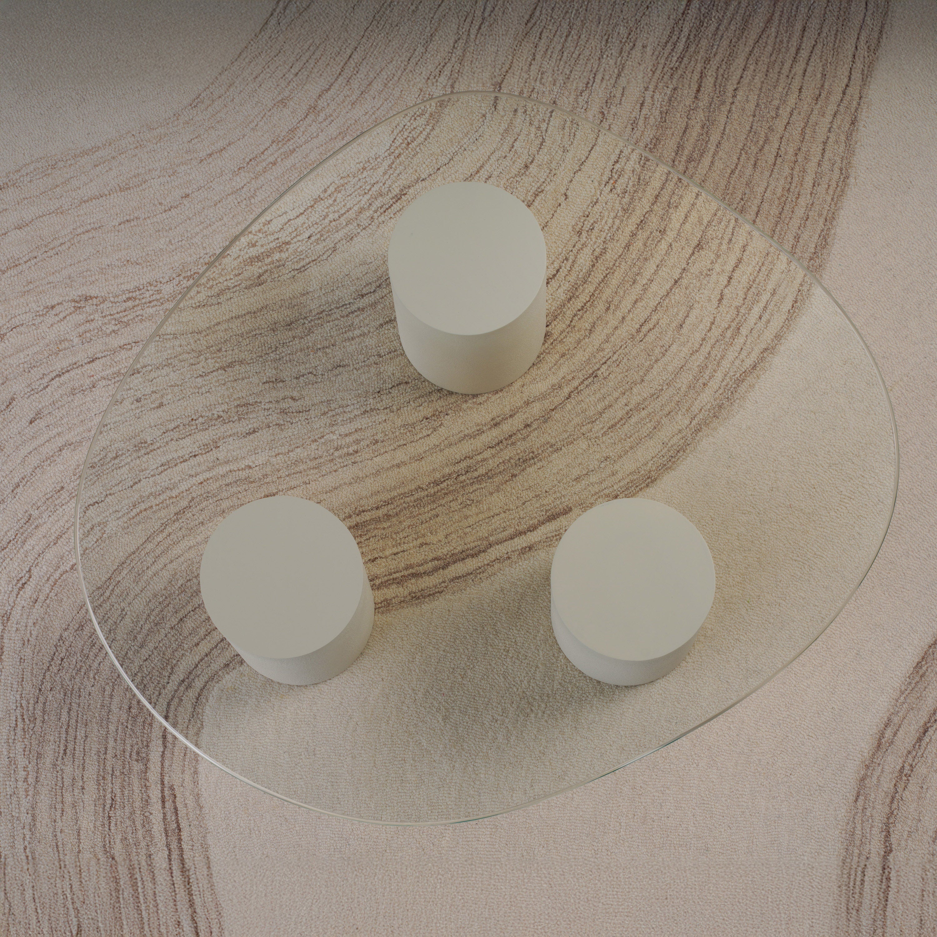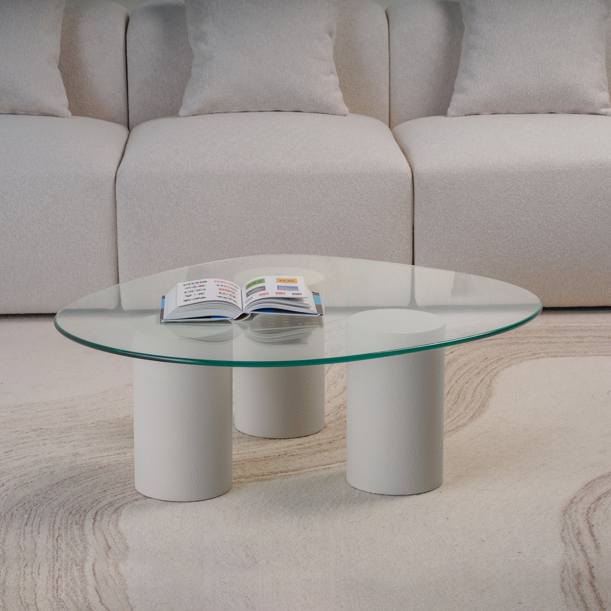 Experience the balance of softness and structure with this Pebble Top Glass Coffee Table. Designed with three cylindrical plaster-finished bases and topped with a fluid, organically shaped glass surface, it evokes a sense of lightness and sculptural grace. The transparent top enhances visual space, while the solid forms ground the design with quiet strength. Perfect for modern living rooms, it merges artistic presence with everyday functionality.