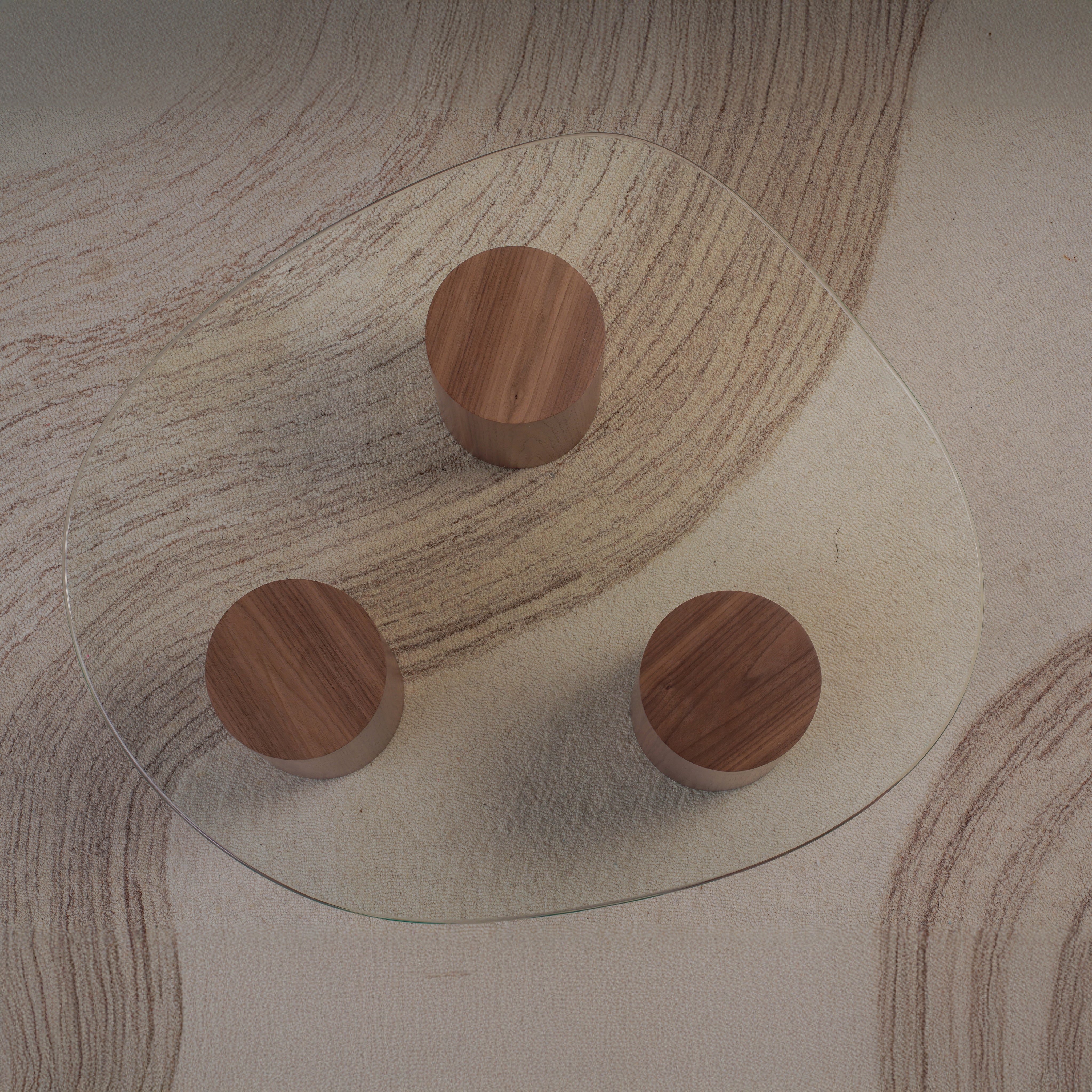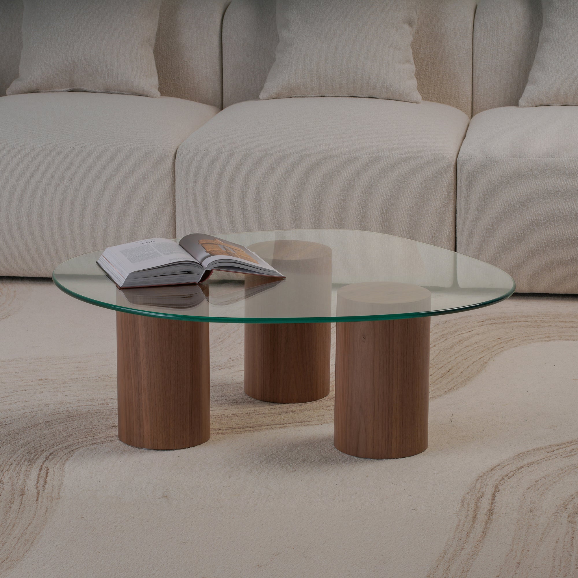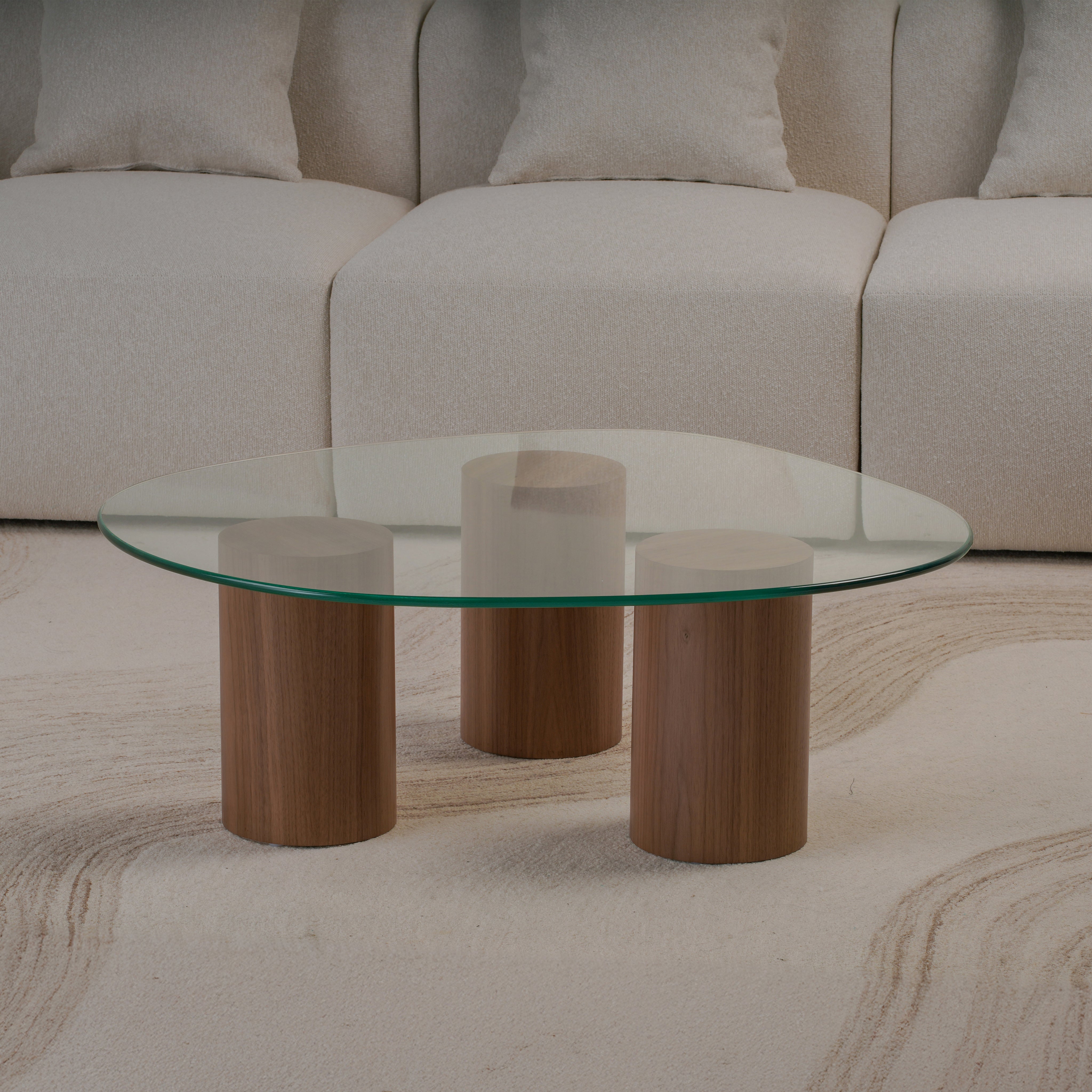 Experience the balance of softness and structure with this Pebble Top Glass Coffee Table. Designed with three cylindrical plaster-finished bases and topped with a fluid, organically shaped glass surface, it evokes a sense of lightness and sculptural grace. The transparent top enhances visual space, while the solid forms ground the design with quiet strength. Perfect for modern living rooms, it merges artistic presence with everyday functionality.