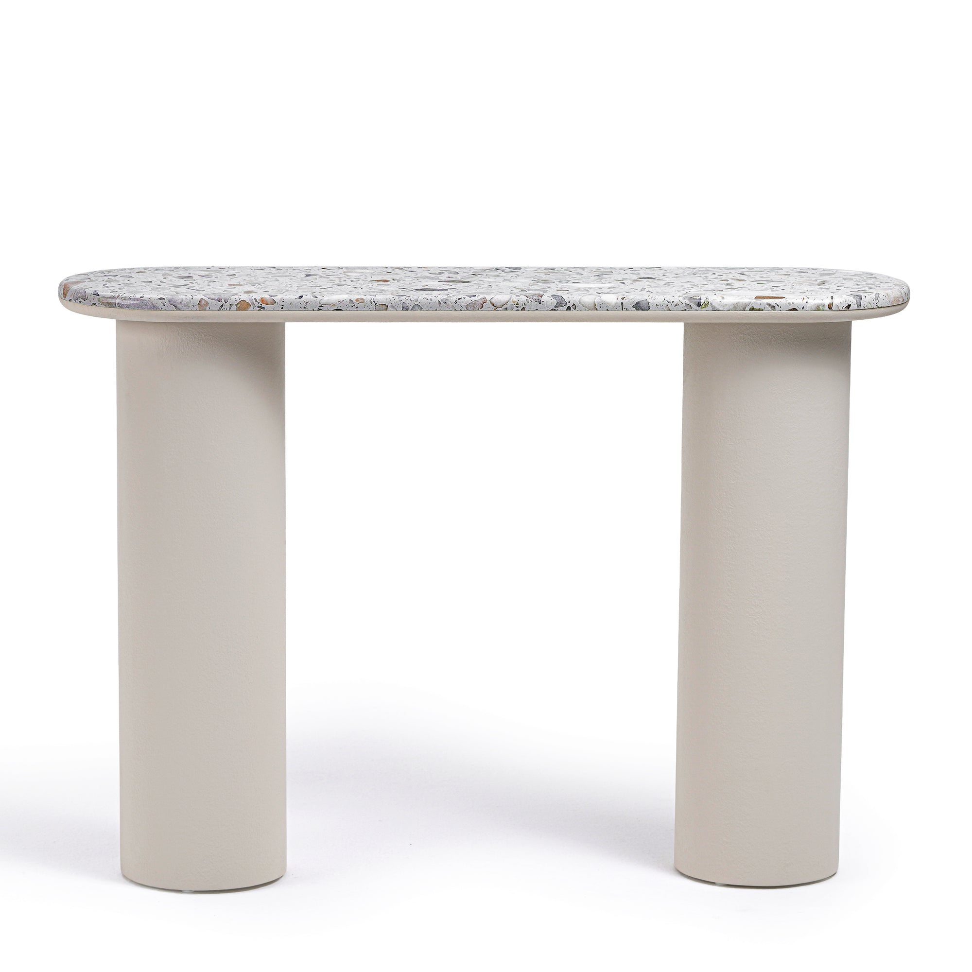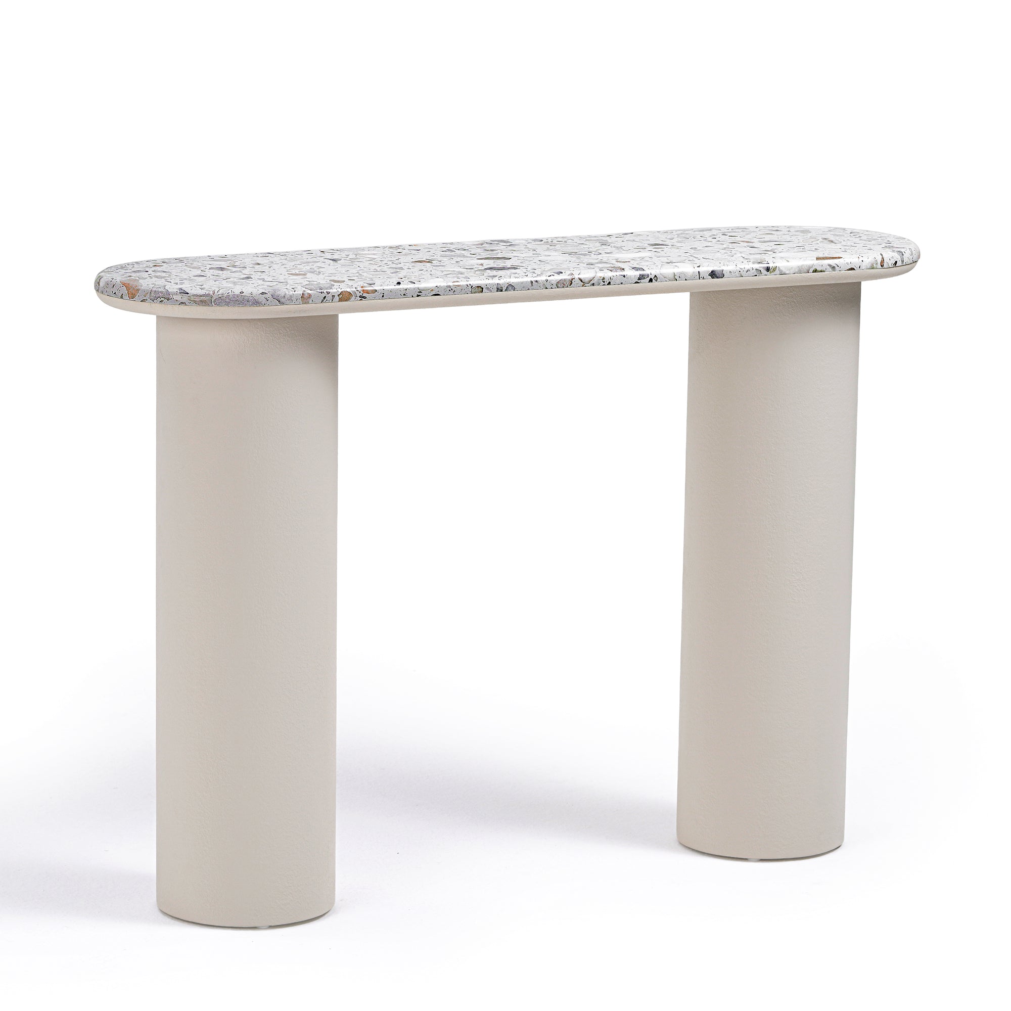 Experience sculptural simplicity with this Pillar Terrazzo Top Console. Defined by its softly rounded terrazzo top and supported by two cylindrical plaster-finished legs, this piece captures a balance of minimalism and material richness. The clean, fluid lines offer a sense of quiet rhythm, while the tactile textures invite closer appreciation. Perfect for entryways, hallways, or behind sofas, it brings modern elegance and understated function to thoughtfully curated interiors.