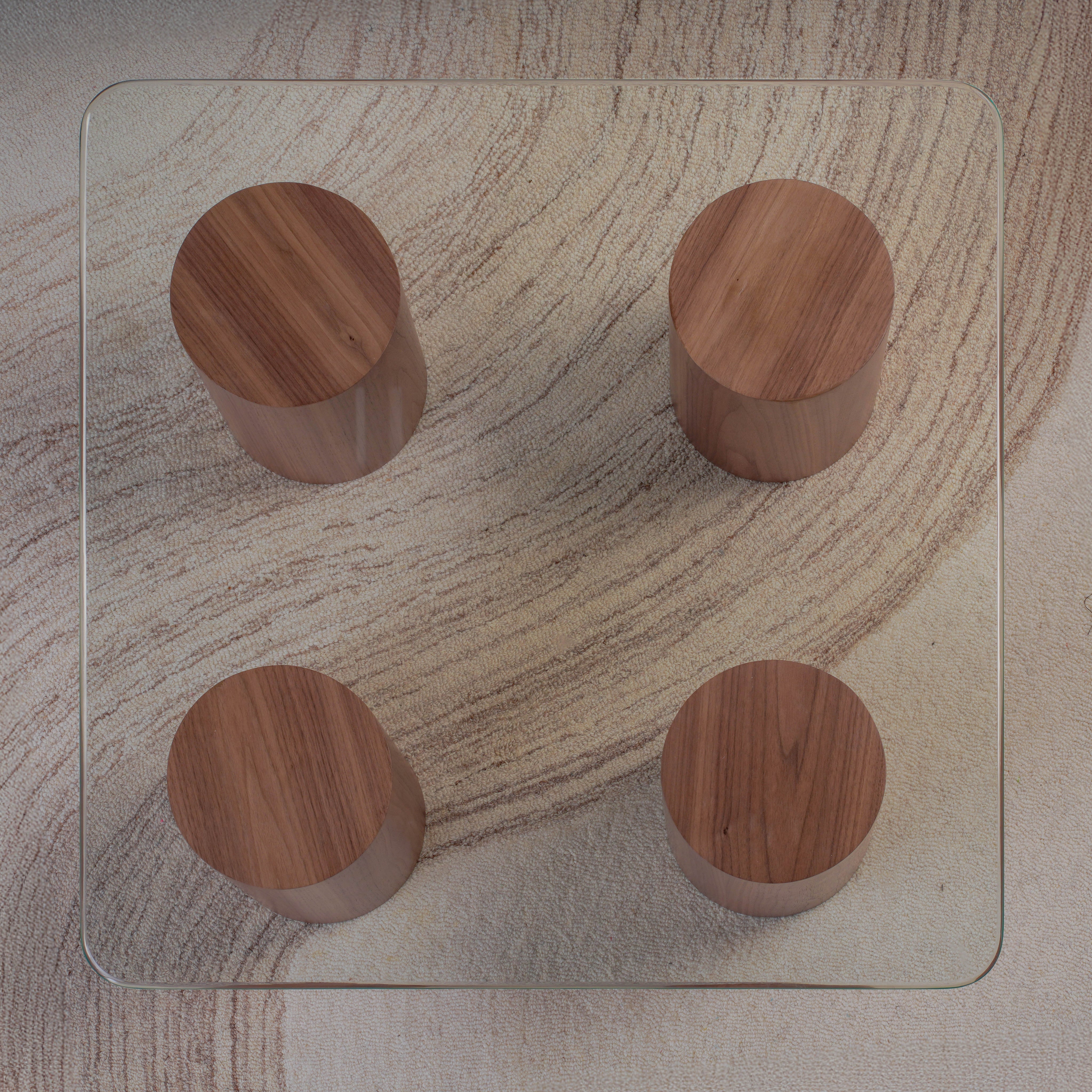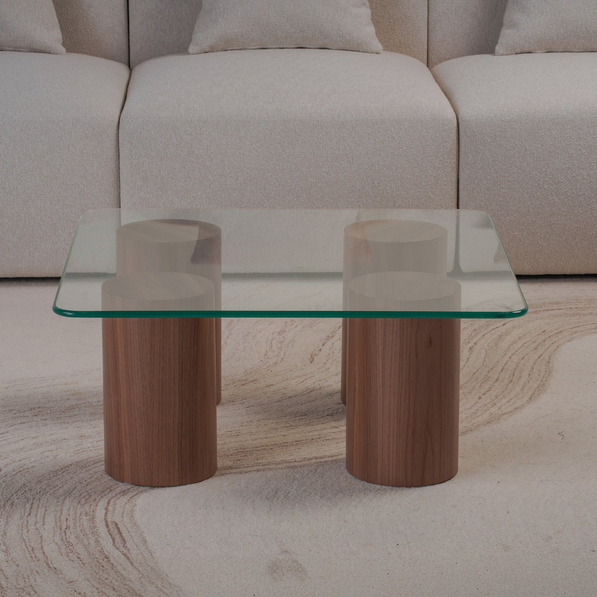 Experience the elegance of structure and simplicity with this square glass coffee table. Resting on four cylindrical bases finished in smooth plaster, it combines bold architectural lines with a calming, tactile presence. The clear glass top introduces a sense of openness and fluidity, perfectly balancing the grounded design below. Ideal for modern living rooms, it brings together sculptural charm and everyday functionality in a refined, contemporary form.