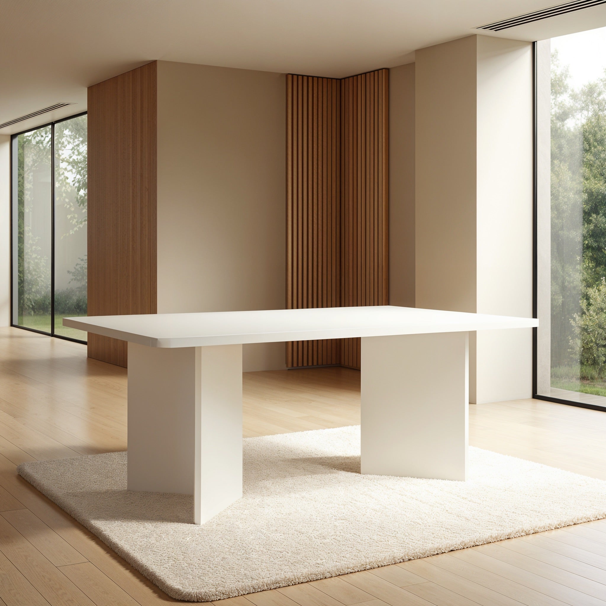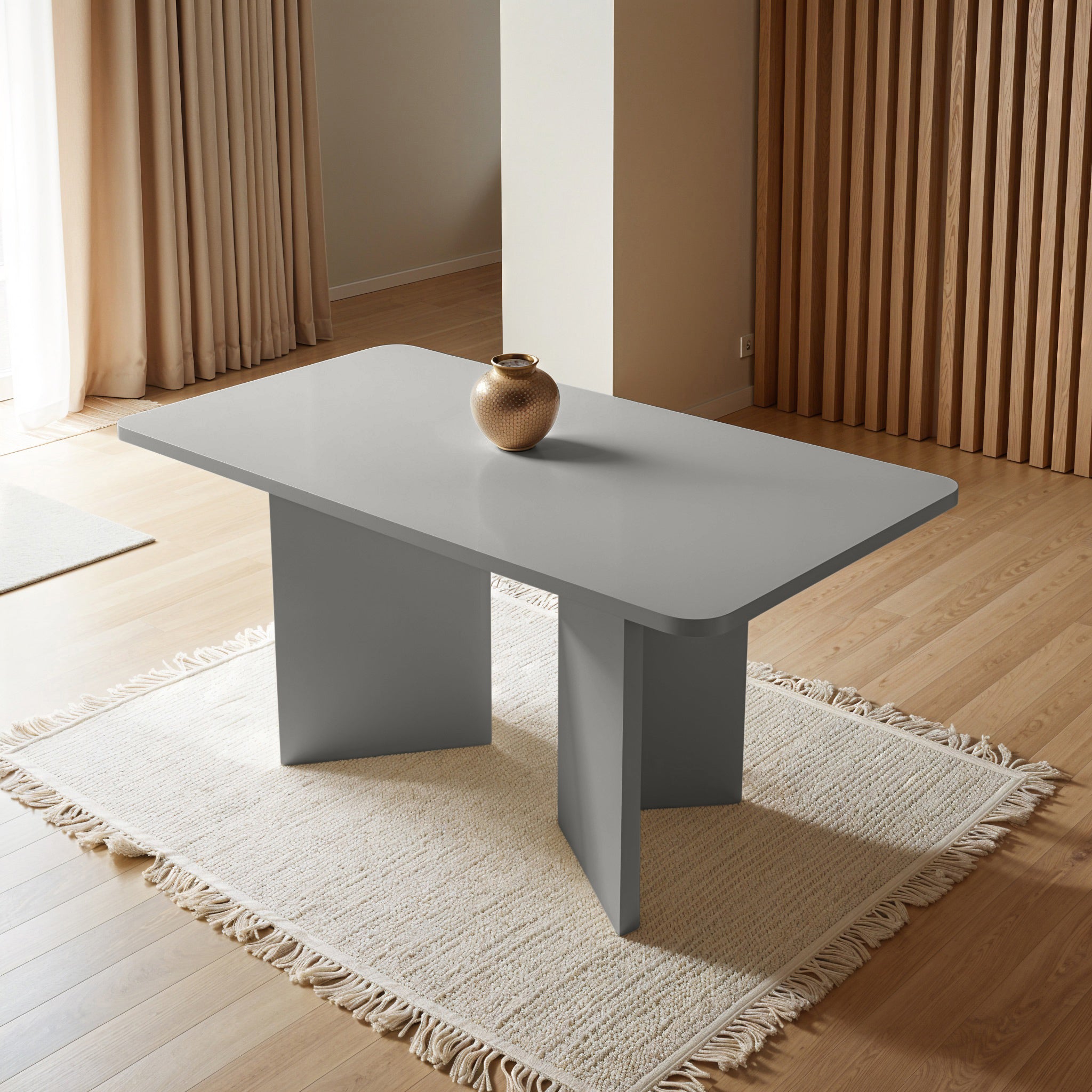 This dining table is a captivating combination of simplicity and functionality. Its sleek, rounded edges and robust twin pedestal base create a stable yet stylish foundation. The subtle textured finish adds a touch of contemporary charm, making it an ideal choice for minimalist and modern dining spaces. Perfect for hosting elegant dinners or casual meals, this table seamlessly blends durability with sophistication, becoming the centerpiece of any dining room.