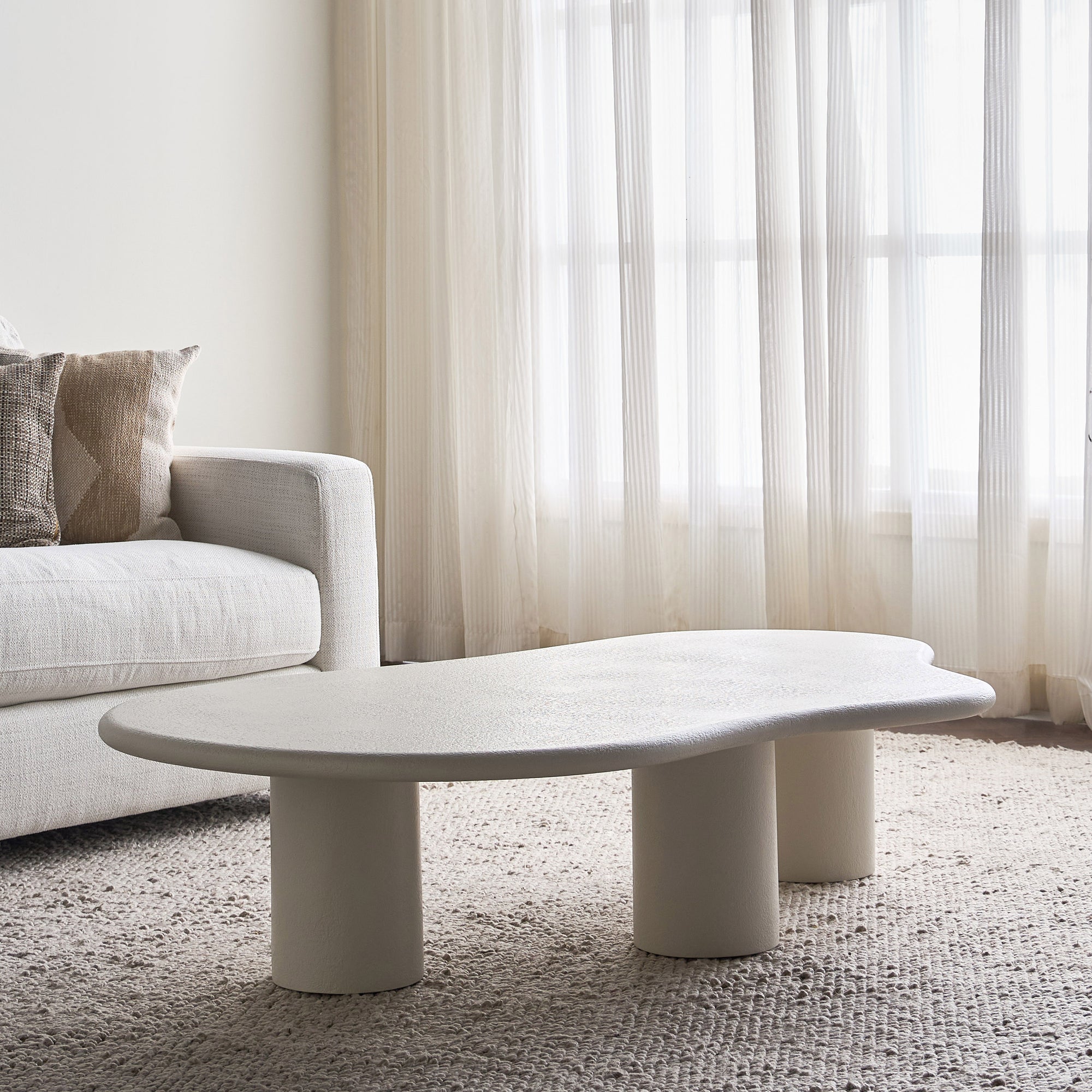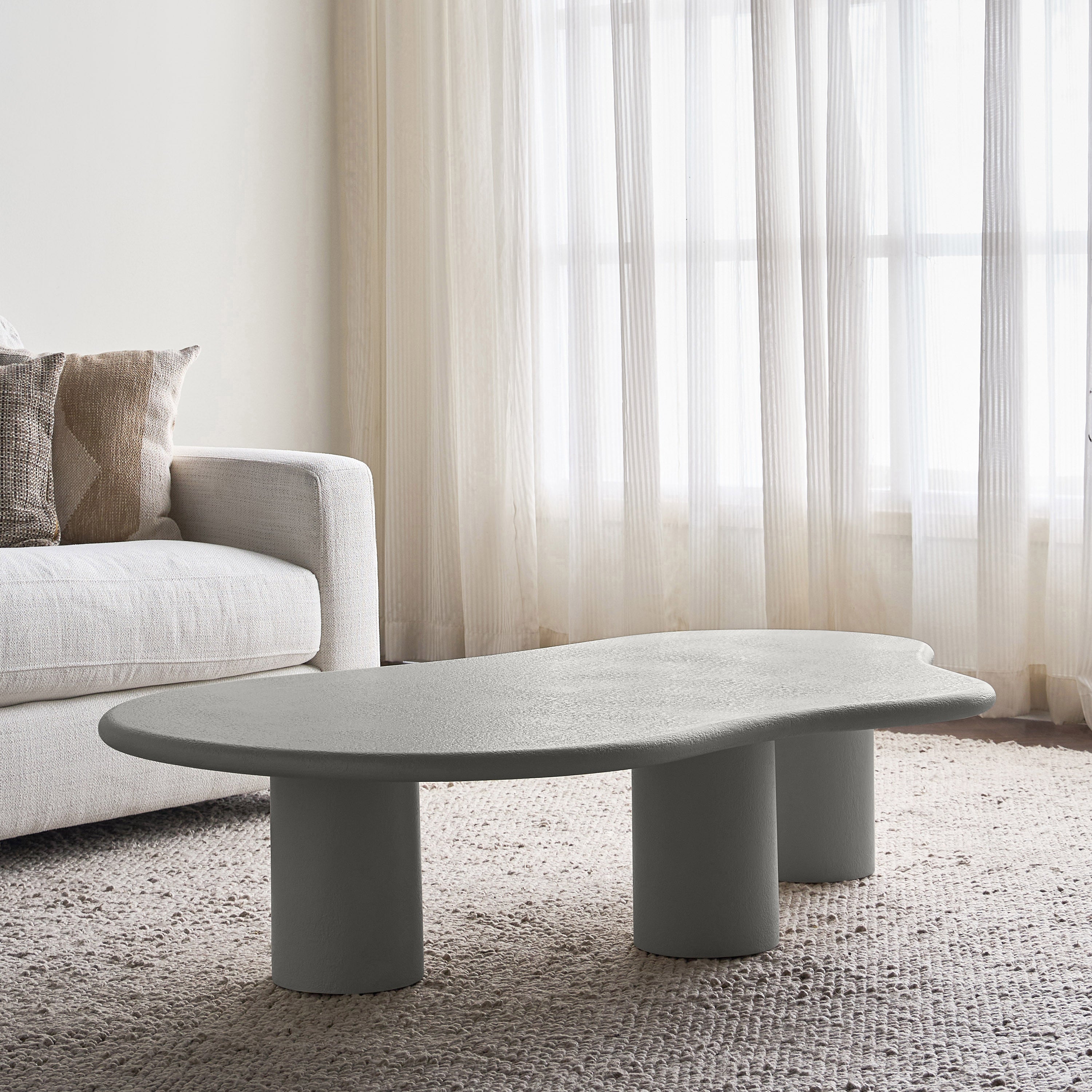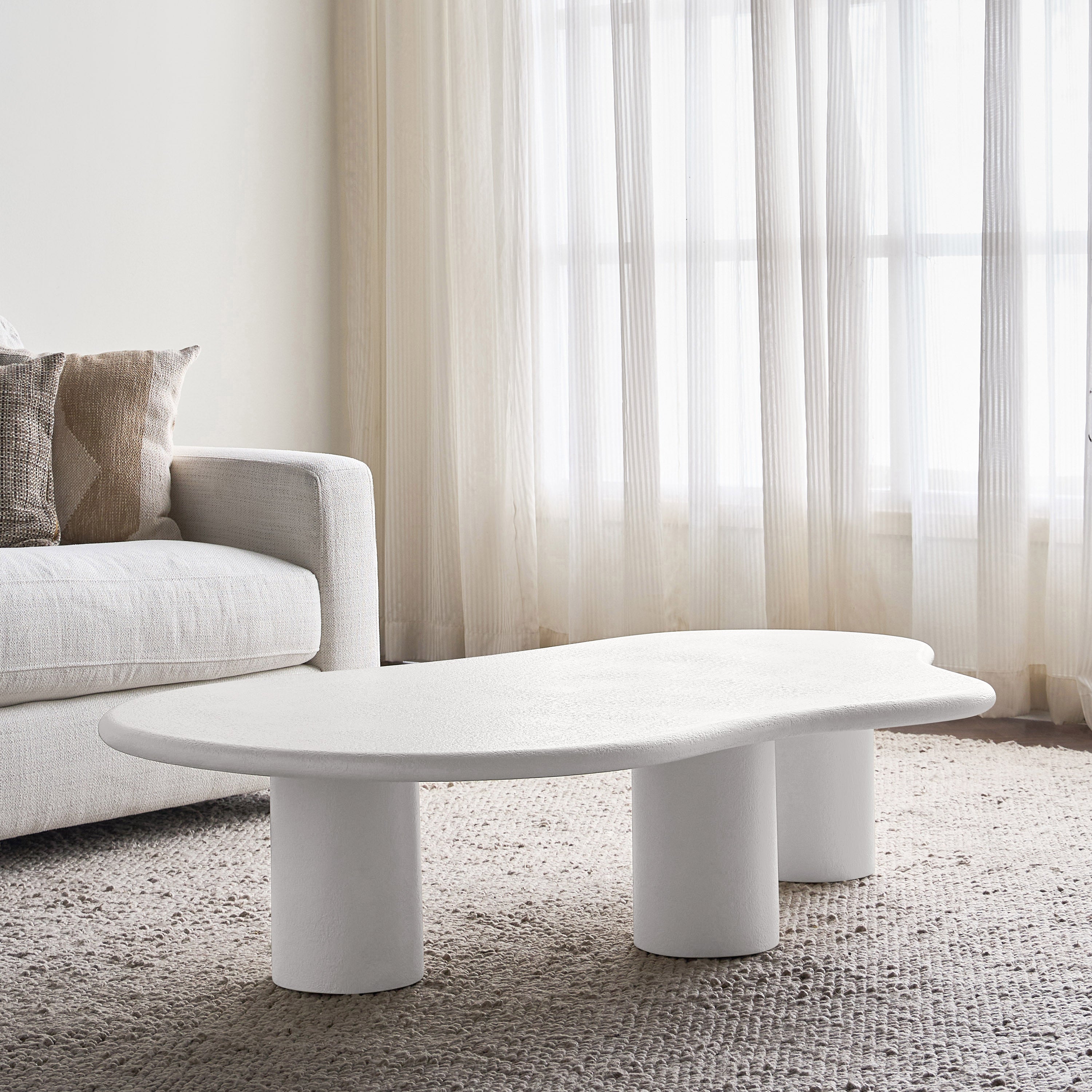 The coffee table is an organic masterpiece designed to bring fluidity and softness into your living space. Featuring a unique freeform shape and supported by three sturdy pillar legs, this table is a perfect blend of functionality and modern design. Its plaster finish adds a textured feel, making it not only visually striking but also smooth to the touch. Whether for casual use or as a statement piece, the table effortlessly enhances any interior with a touch of nature-inspired elegance.