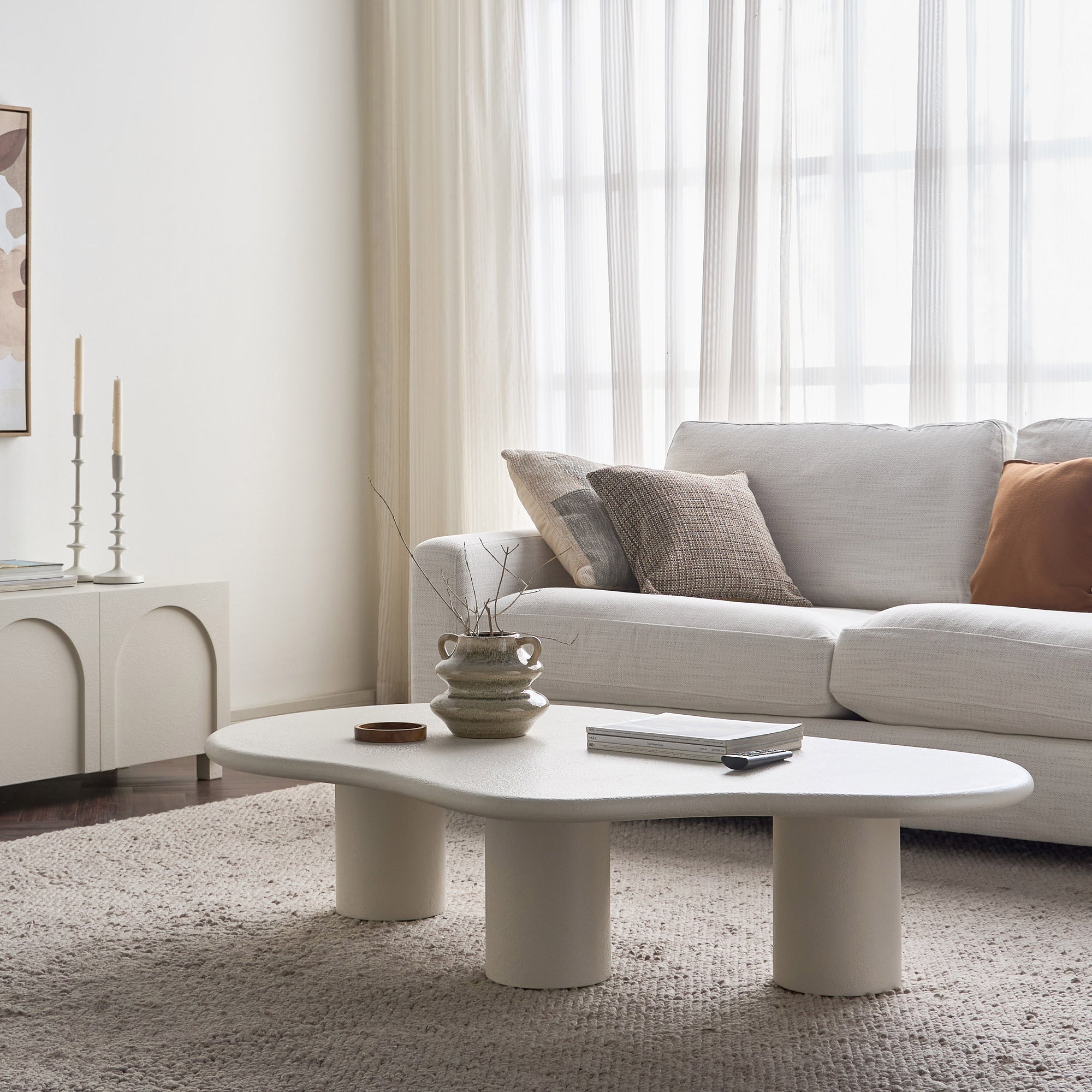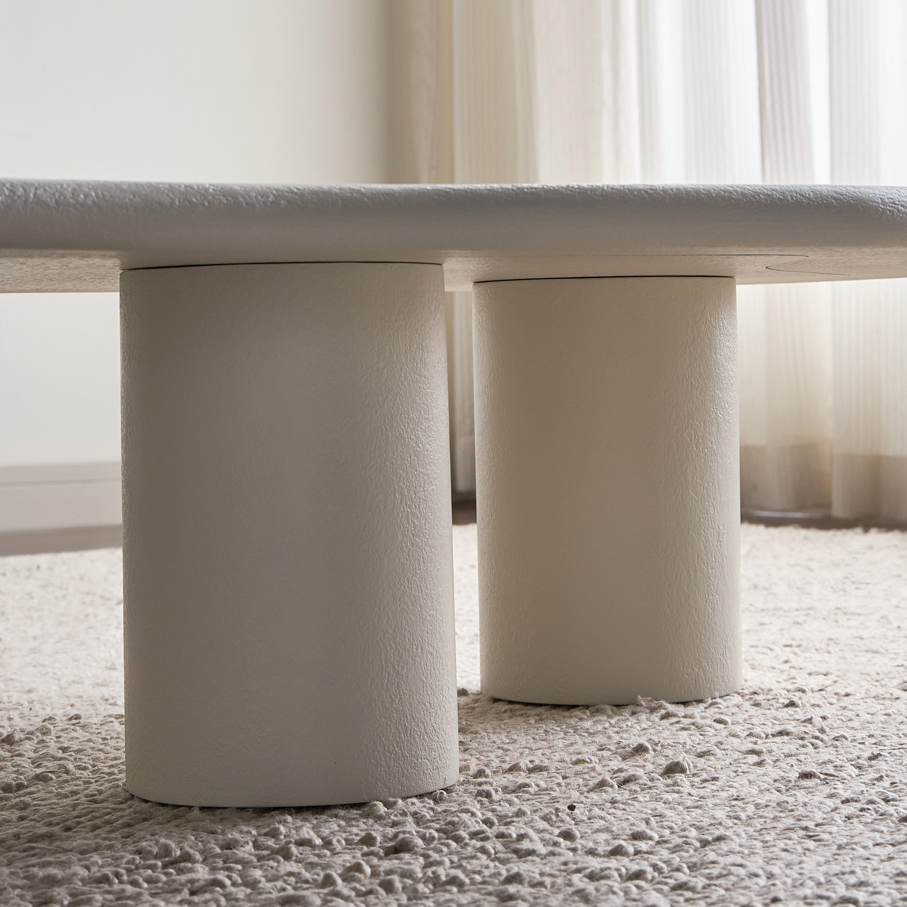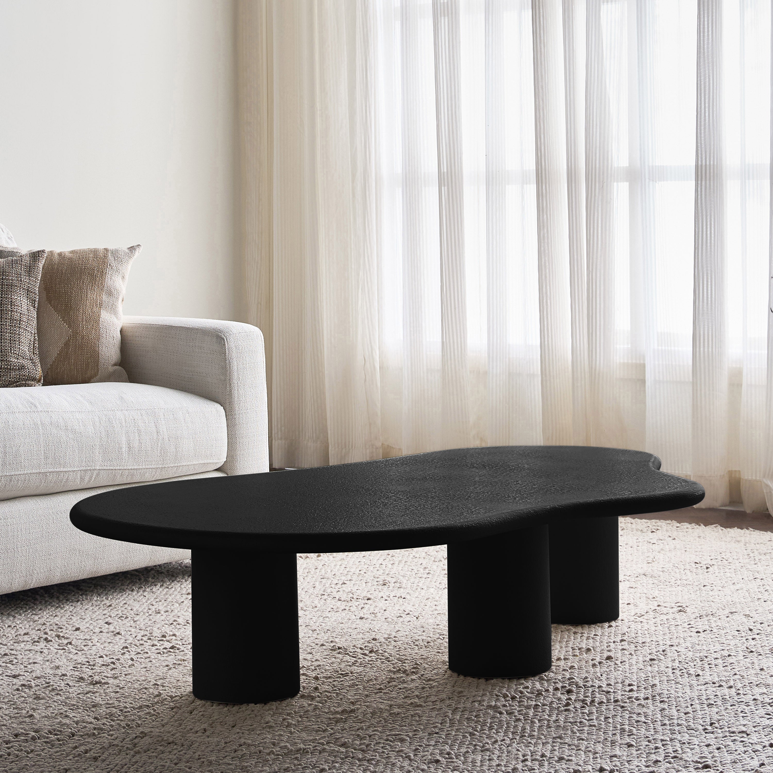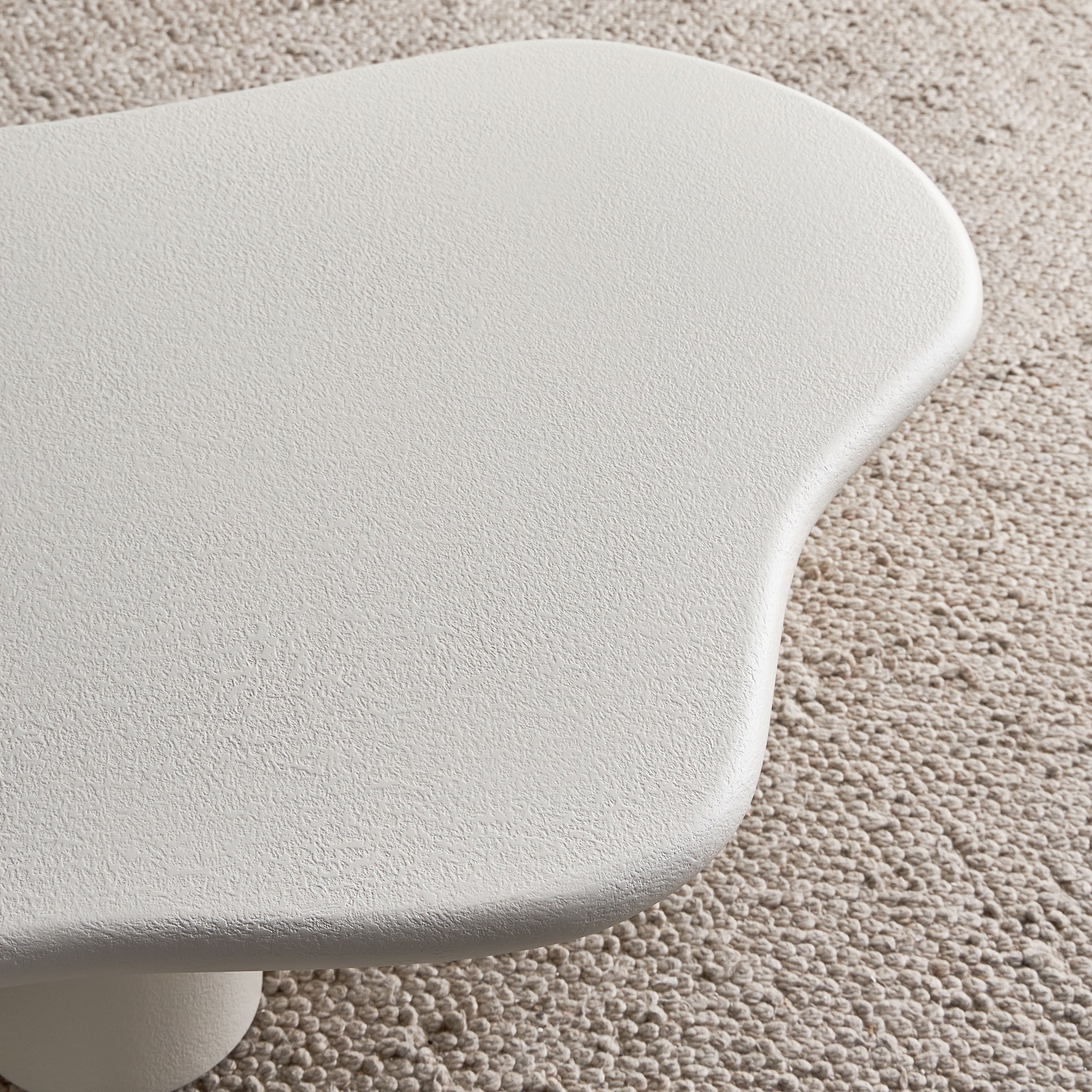 The coffee table is an organic masterpiece designed to bring fluidity and softness into your living space. Featuring a unique freeform shape and supported by three sturdy pillar legs, this table is a perfect blend of functionality and modern design. Its plaster finish adds a textured feel, making it not only visually striking but also smooth to the touch. Whether for casual use or as a statement piece, the table effortlessly enhances any interior with a touch of nature-inspired elegance.
